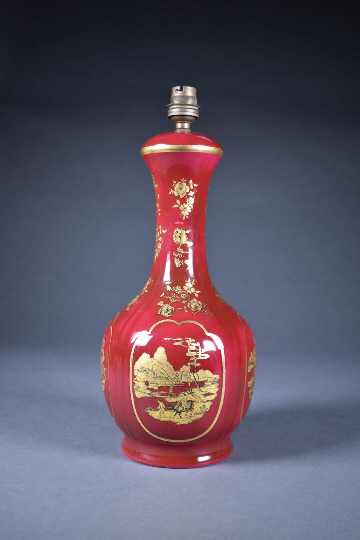 Lampe ovoïde à haut col en porcelaine à décor en dorure de scènes dans le goût chinois sur fond rouge. XXe siècle. Haut. : 36 cm.