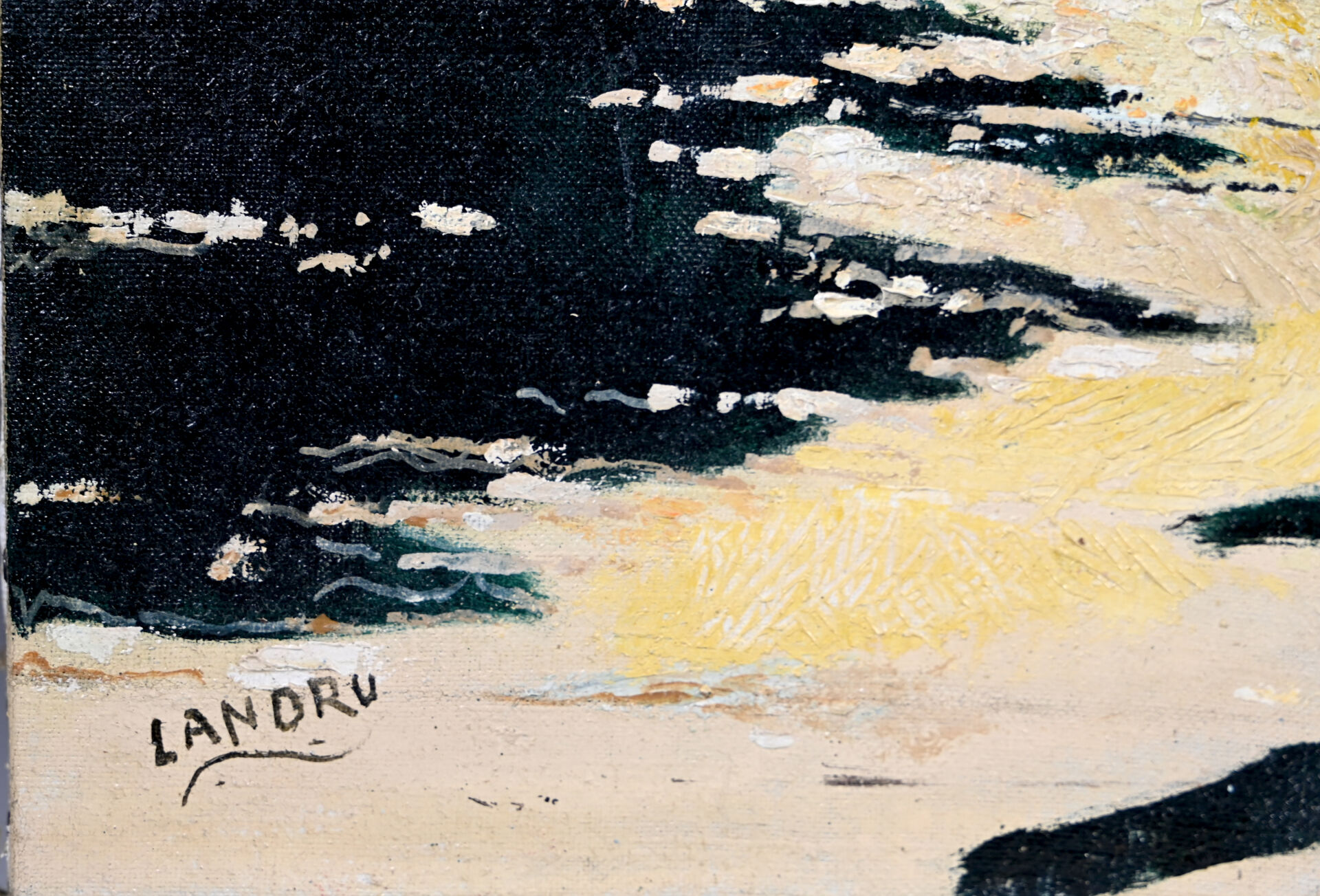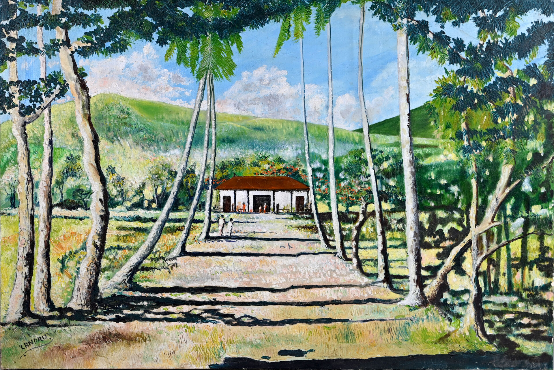 LANDRU (XXeme siècle). Habitation créole – Bord de mer aux antilles. Deux Huiles sur toile signées en bas à gauche. 50.5 x 74.5 cm et 60 x 100 cm.