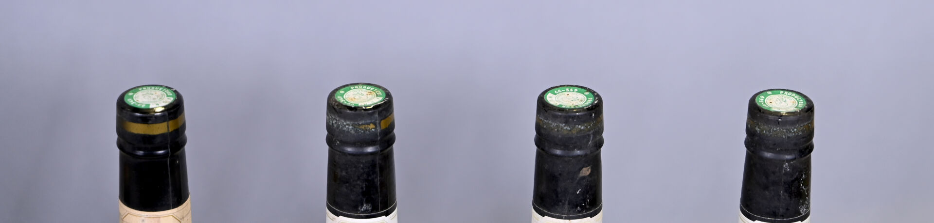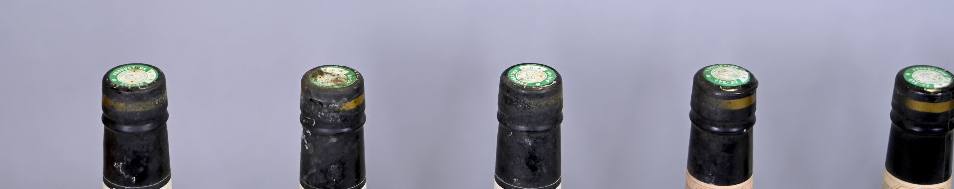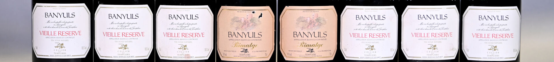 6 bouteilles, Banyuls Grand Cru, Cellier des Templiers, Vieille Réserve, Demi Doux. Capsules légèrement sales. Etiquettes avec des traces dont une présente une petite tache.