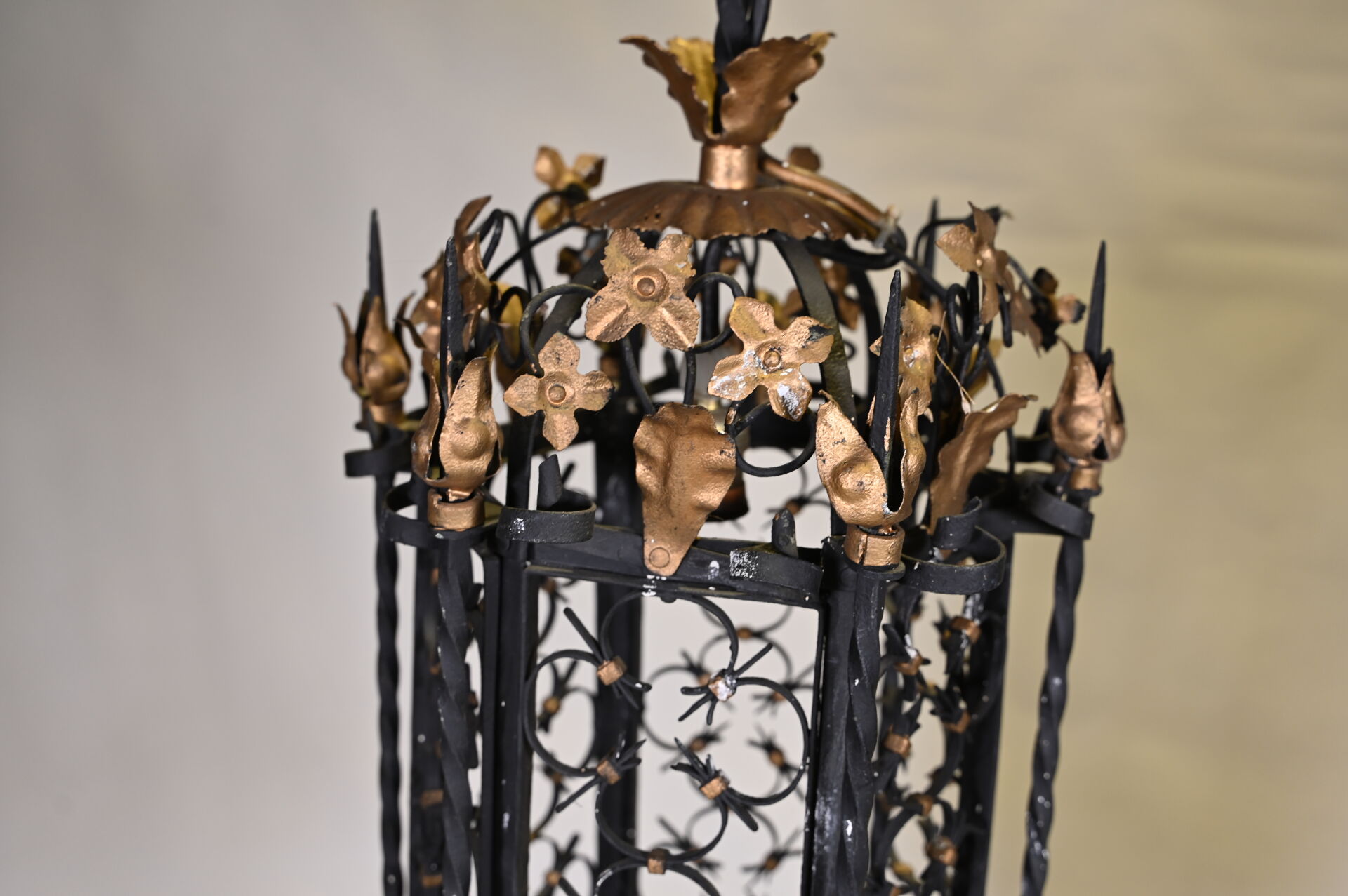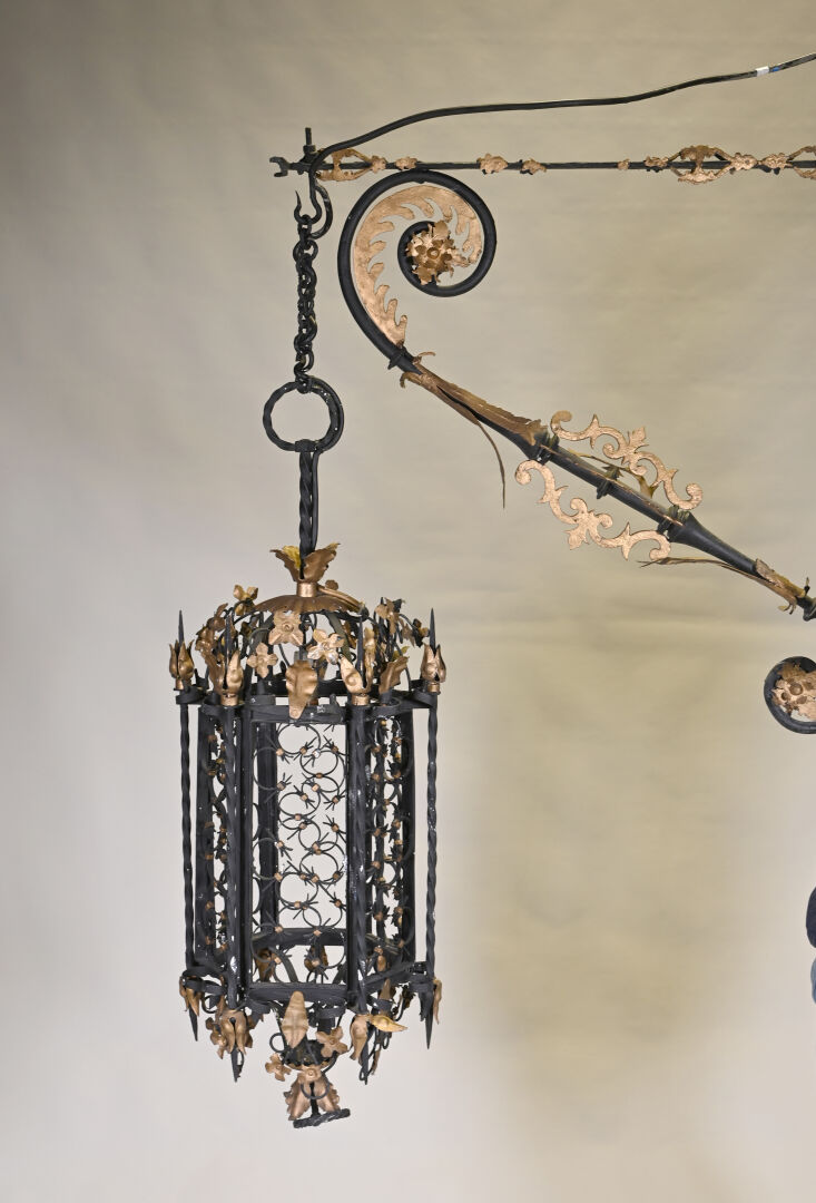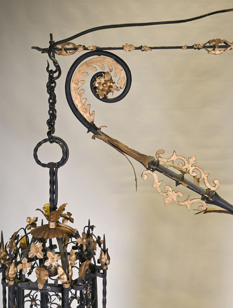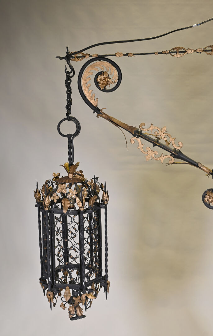 Lanterne de hall ou de galerie en métal et fer forgé laqués noir et or avec sa potence. Fin du XIXe siècle. Haut. totale : 147 cm – Prof. : 95 cm.