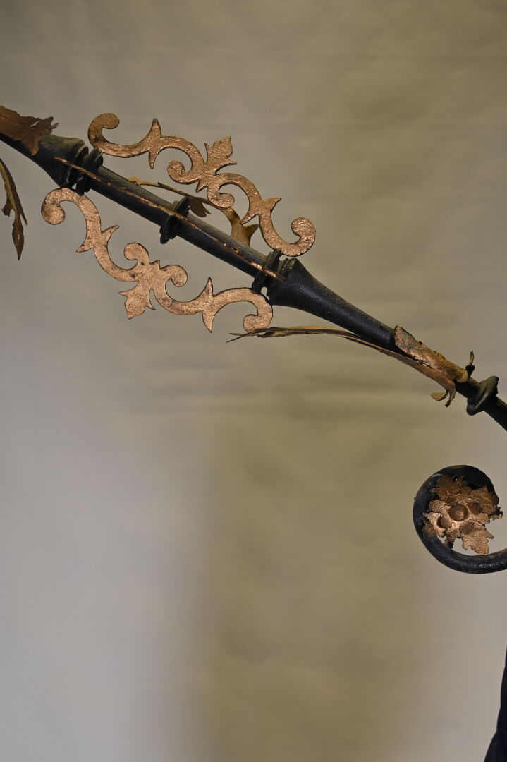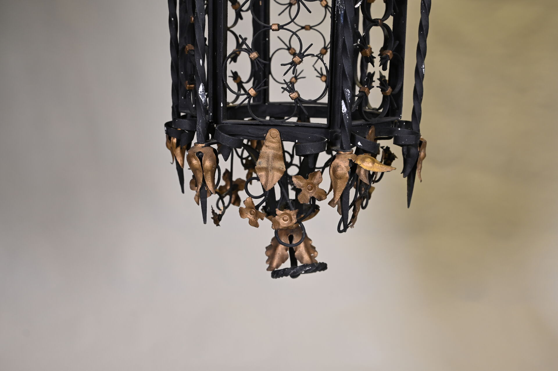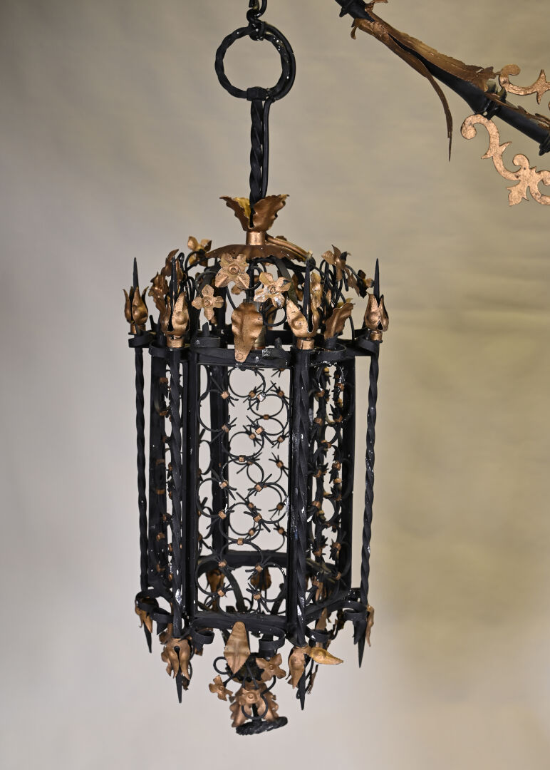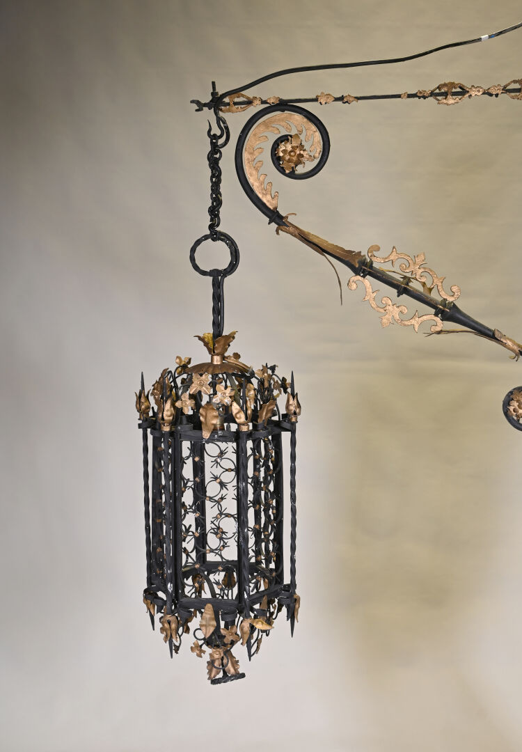Lanterne de hall ou de galerie en métal et fer forgé laqués noir et or avec sa potence. Fin du XIXe siècle. Haut. totale : 147 cm – Prof. : 95 cm.