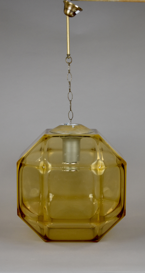 Lanterne polygonale en Plexiglas fumé jaune (légères traces de frottements). Travail des années 1970. Haut. : 50 cm – Larg. : 50 cm – Prof. : 50 cm.