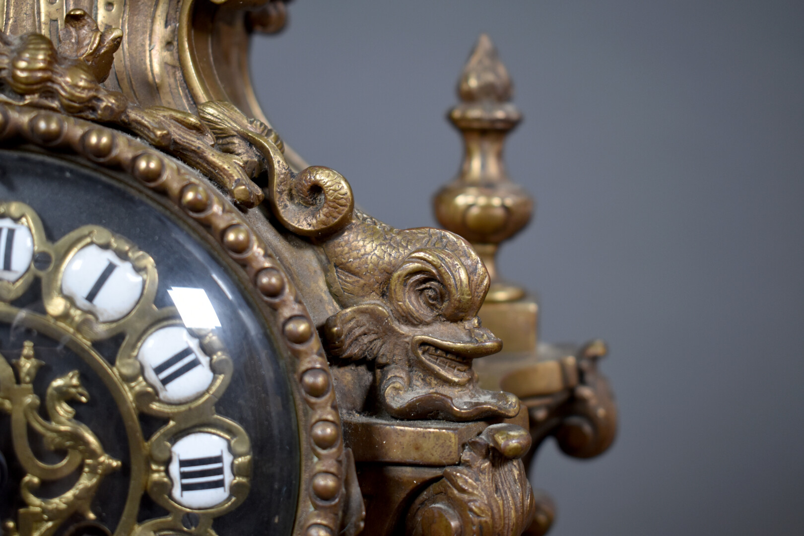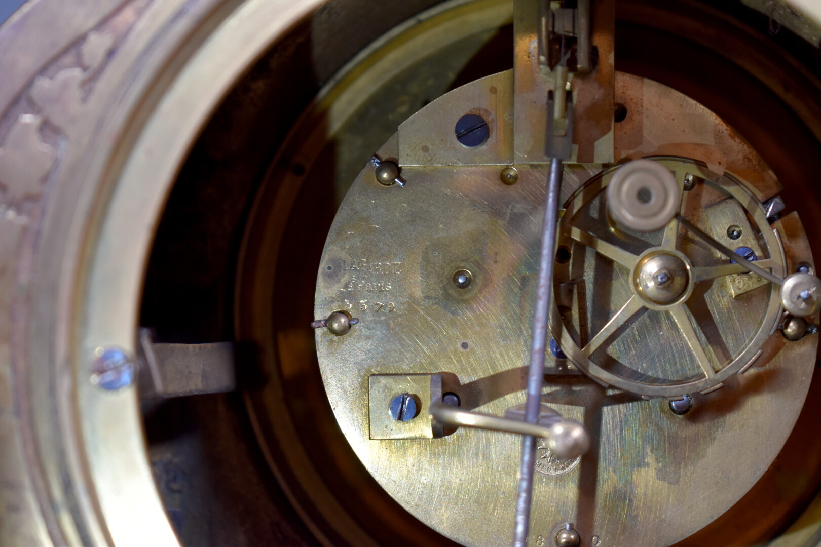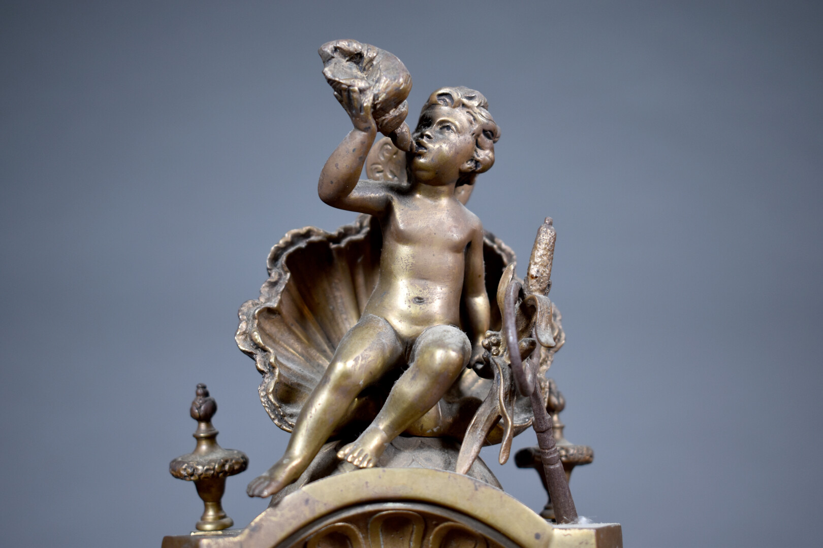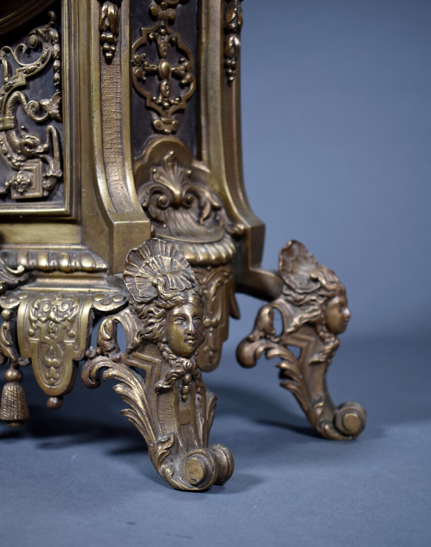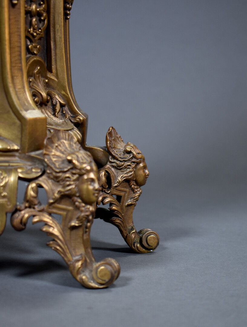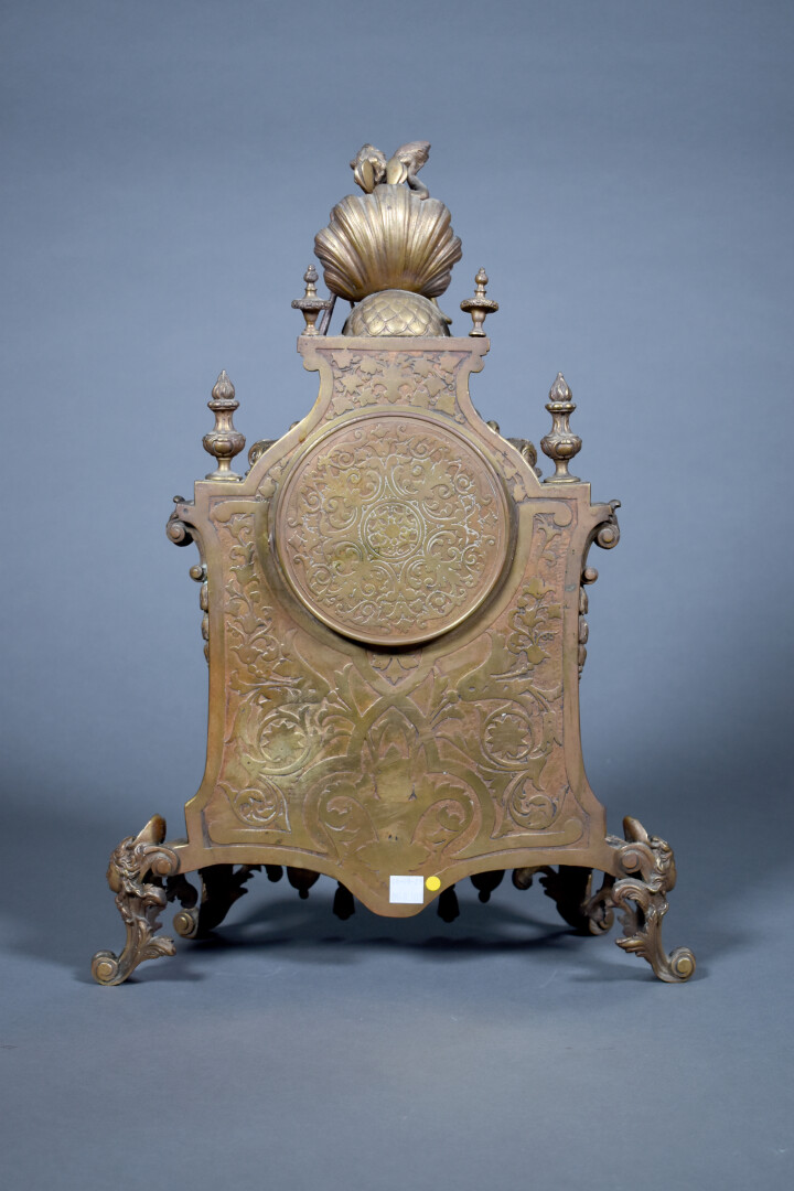 LARGARDE à Paris et Japy Frères et Compagnie. Pendule en bronze ciselé anciennement doré à décor dit à la Bérain. Cadran à cartouches émaillés de chiffres romains pour les heures. Mouvement signé Largde à Paris et numéroté 3379, cachet de Japy. Elle est surmonté d’un putto dans un coquillage soufflant dans une corne (à refixer). Les pieds surmontés d’espagnolettes. Style Louis XIV, fin du XIXe siècle. Haut. : 51,5 cm.