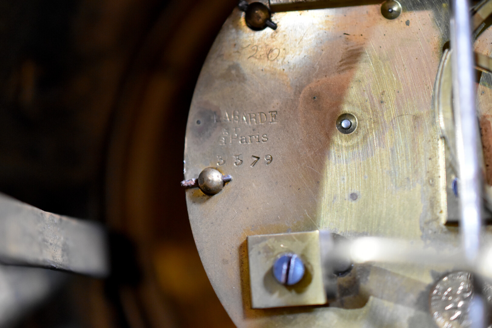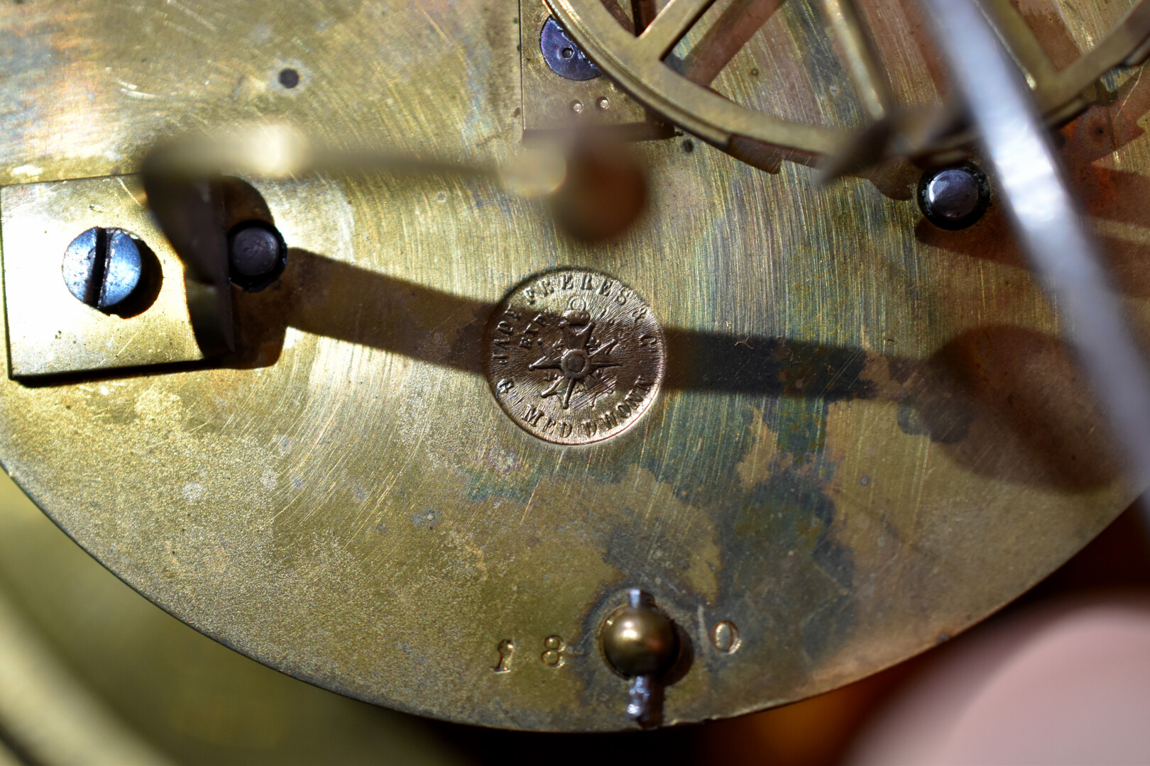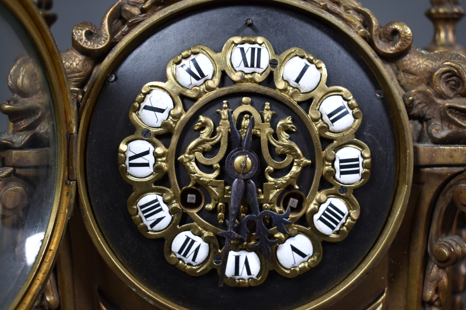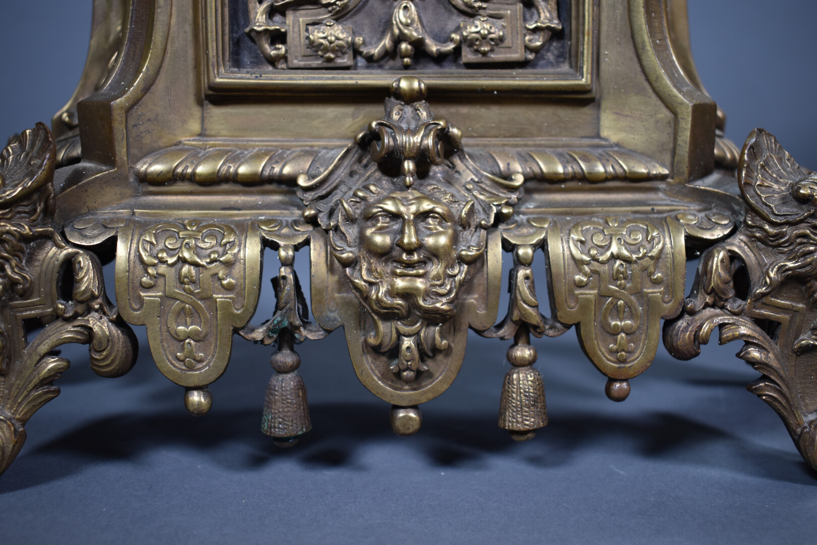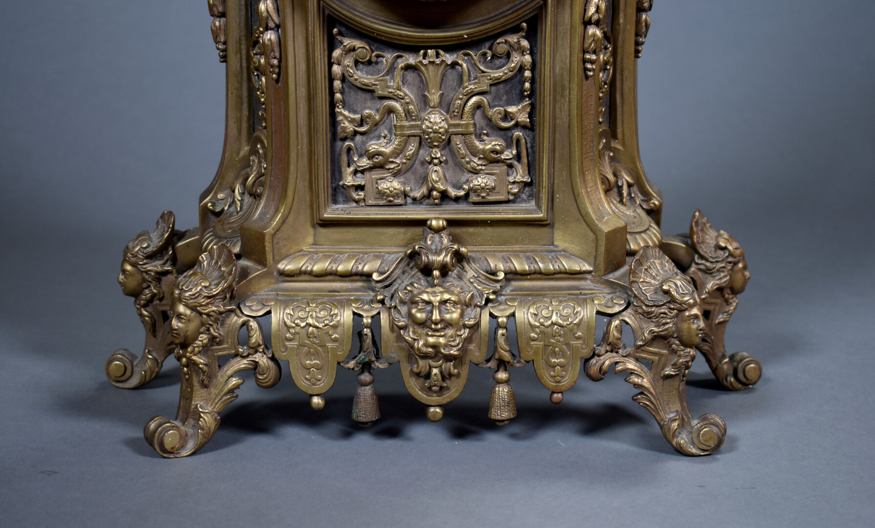 LARGARDE à Paris et Japy Frères et Compagnie. Pendule en bronze ciselé anciennement doré à décor dit à la Bérain. Cadran à cartouches émaillés de chiffres romains pour les heures. Mouvement signé Largde à Paris et numéroté 3379, cachet de Japy. Elle est surmonté d’un putto dans un coquillage soufflant dans une corne (à refixer). Les pieds surmontés d’espagnolettes. Style Louis XIV, fin du XIXe siècle. Haut. : 51,5 cm.