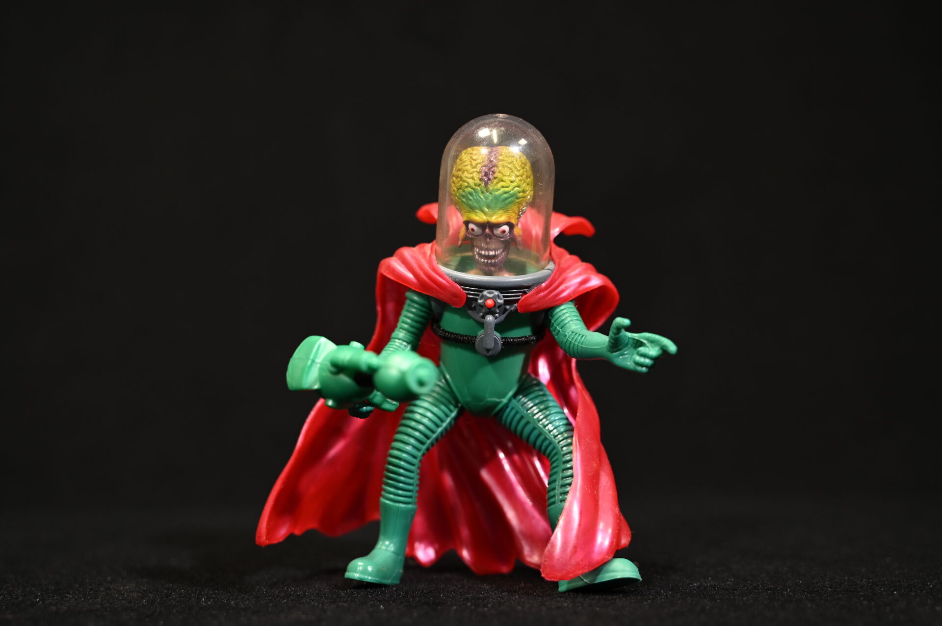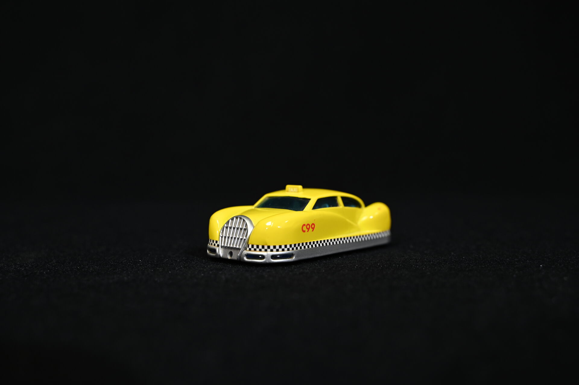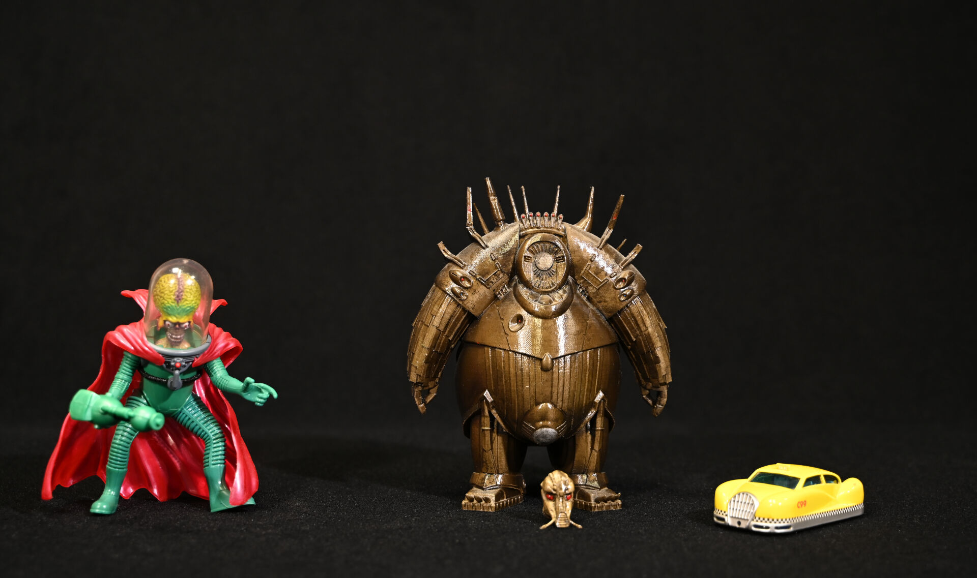 LE CINQUIEME ELEMENT – THE FIFTH ELEMENT et MARS ATTACKS. Ensemble soit une figurine du Mondoshawan (tête coupée, pique cassé), un taxi « C99 » de CANAL + (1999) et une figurine de l’Ambassadeur Martien (électrifié, piles) avec son pistolet et sa cape en caoutchouc. Haut. du Mondoshawan : 20 cm.