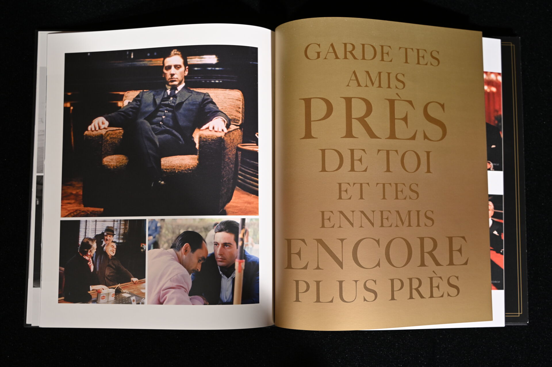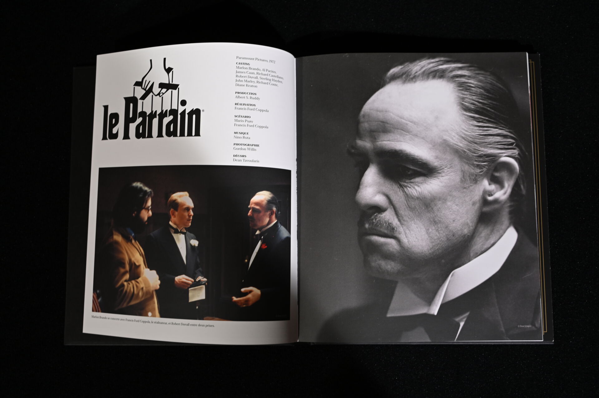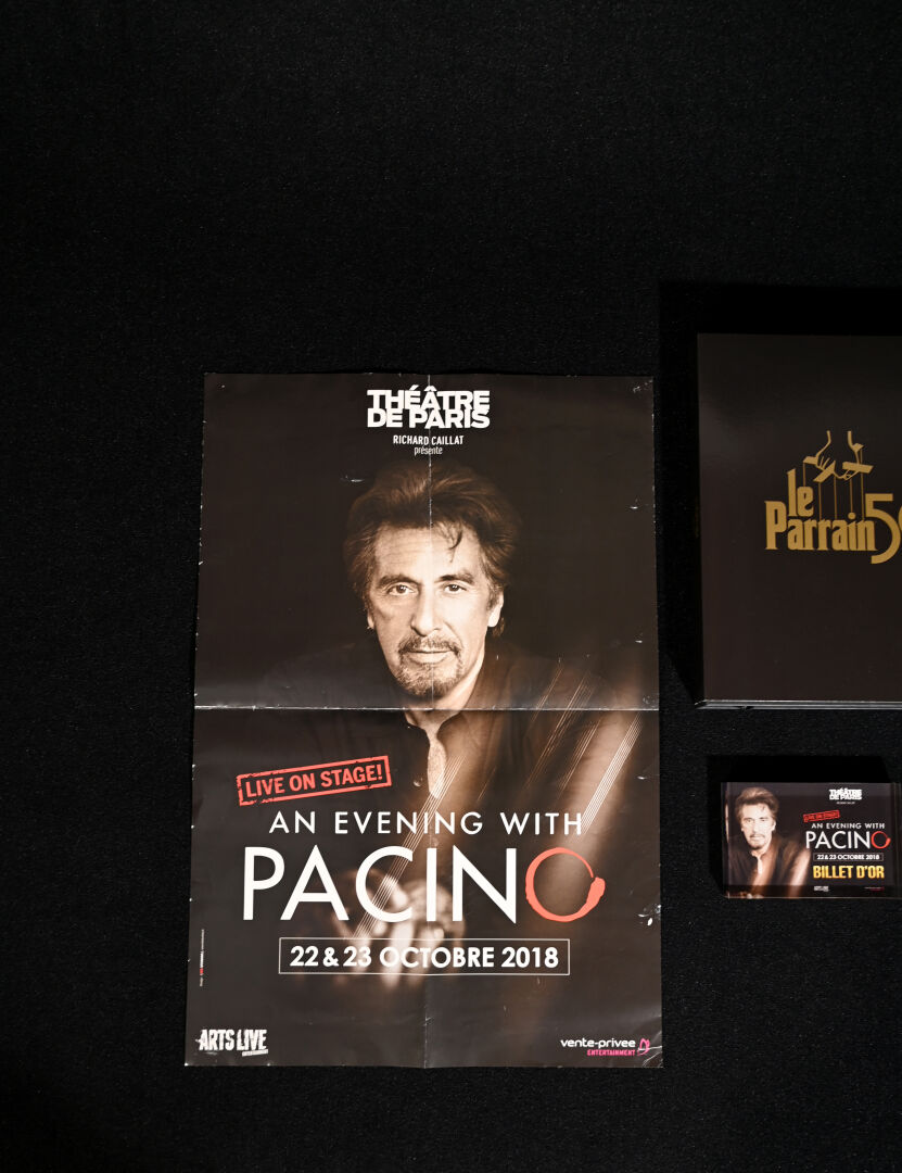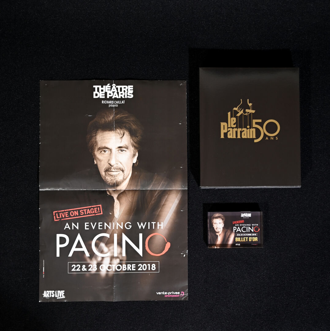 LE PARRAIN 50 ANS – THE GODFATHER 50 YEARS. Coffret avec livret montrant des photos de tournage et les DVD des trois films et bonus. 2022. On joint un bloc plexiglas « An Evening With Pacino – 22 & 23 Octobre 2018 – Billet d’Or » et un poster.