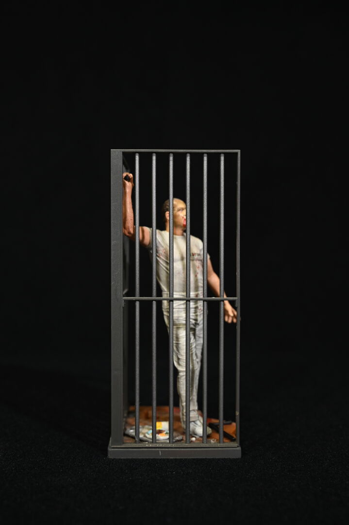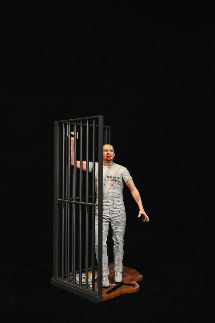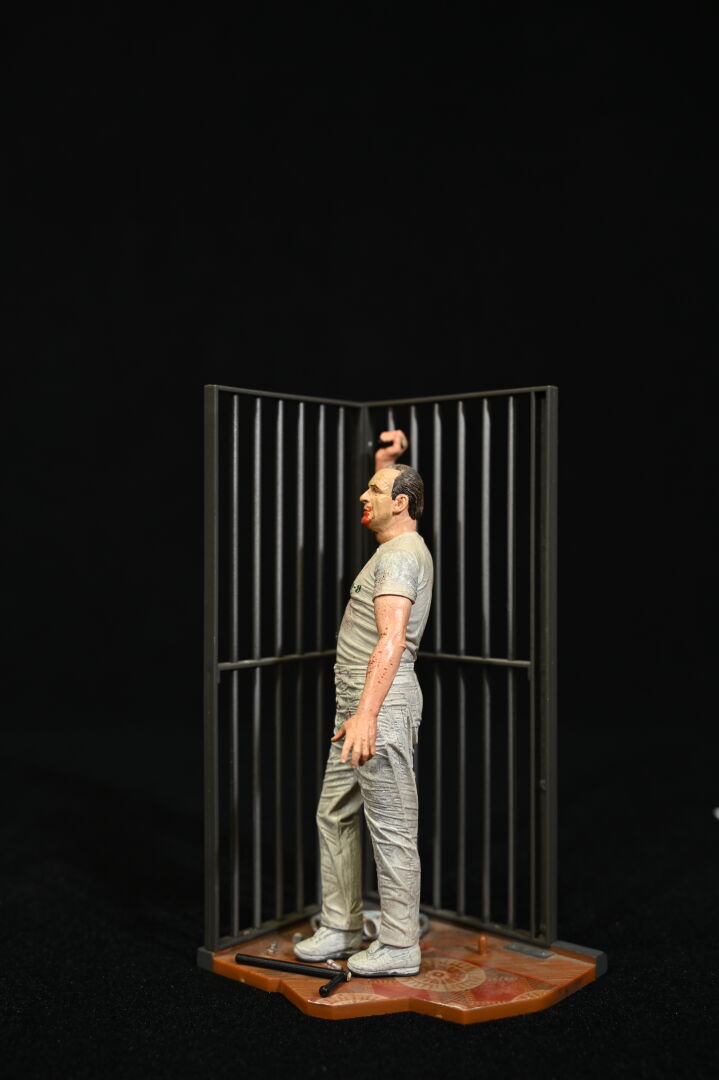 LE SILENCE DES AGNEAUX – THE SILENCE OF LAMBS – NECA. Figurine représentant le Docteur Hannibal Lecter (matraque cassée) dans un décor de cellule. 2007. Haut. : 21 cm.