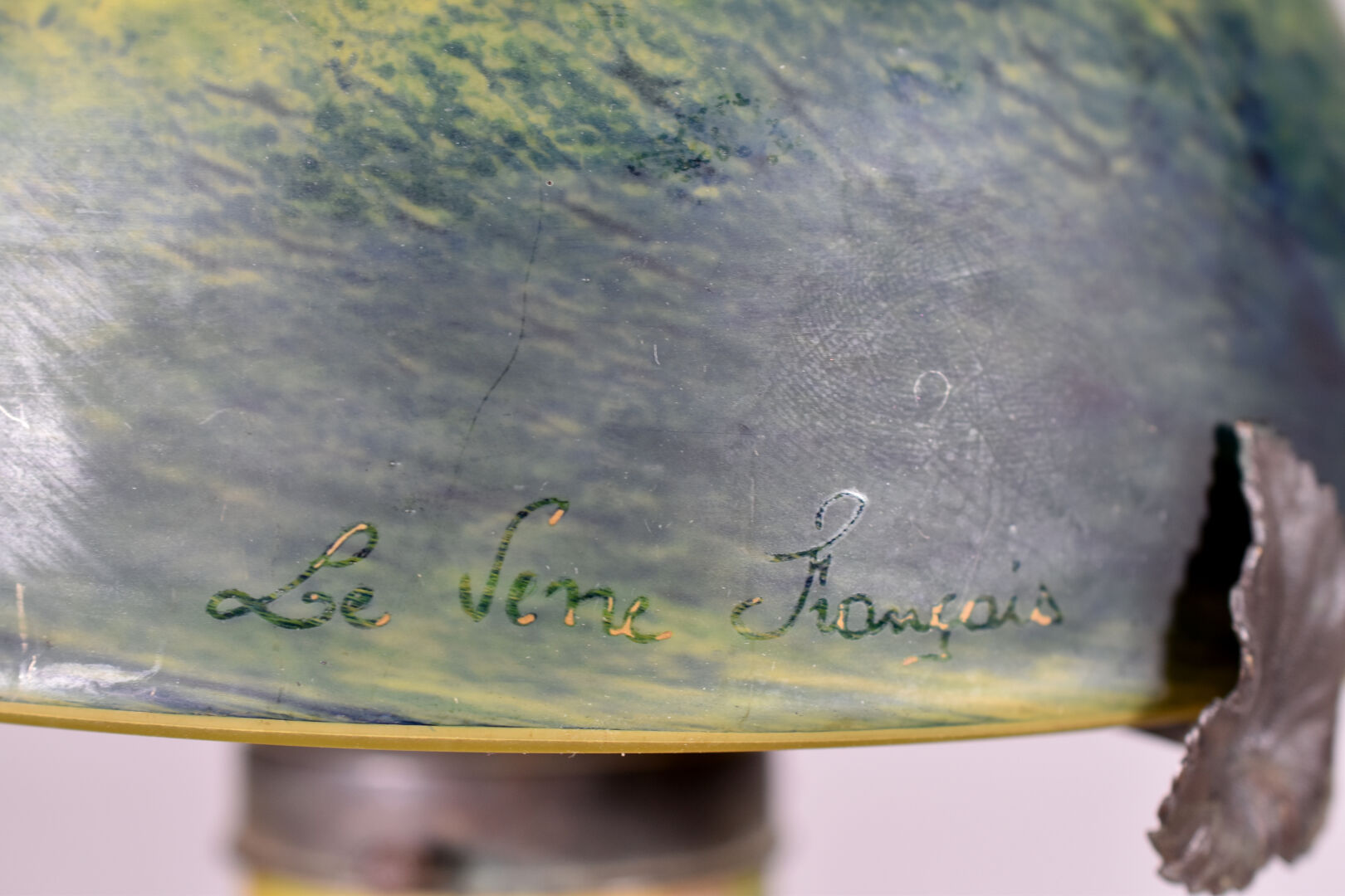 LE VERRE FRANCAIS. Lampe champignon en verre marmoréen jaune et bleu. Signée sur le pied et le chapeau. Haut. : 50 cm.