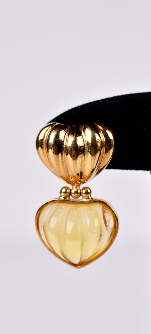 LEGI. Paire de pendants d’oreilles en or jaune 18K 750/1000e à décor de citrines en cabochon godronnés (manque un bouton). Poids brut. : 11,45 g.