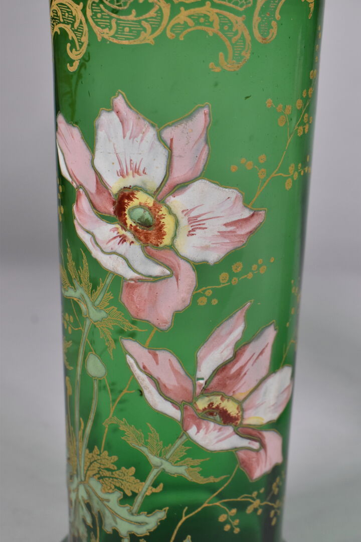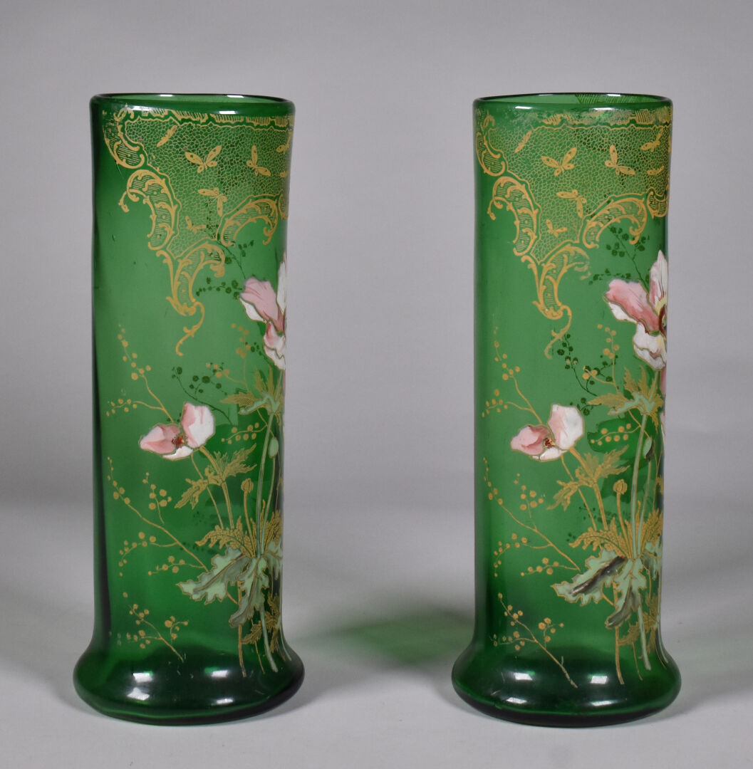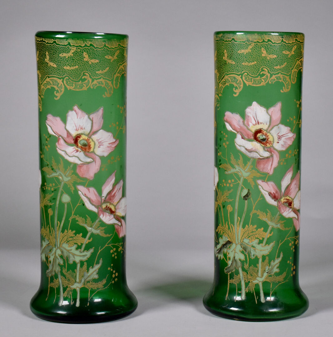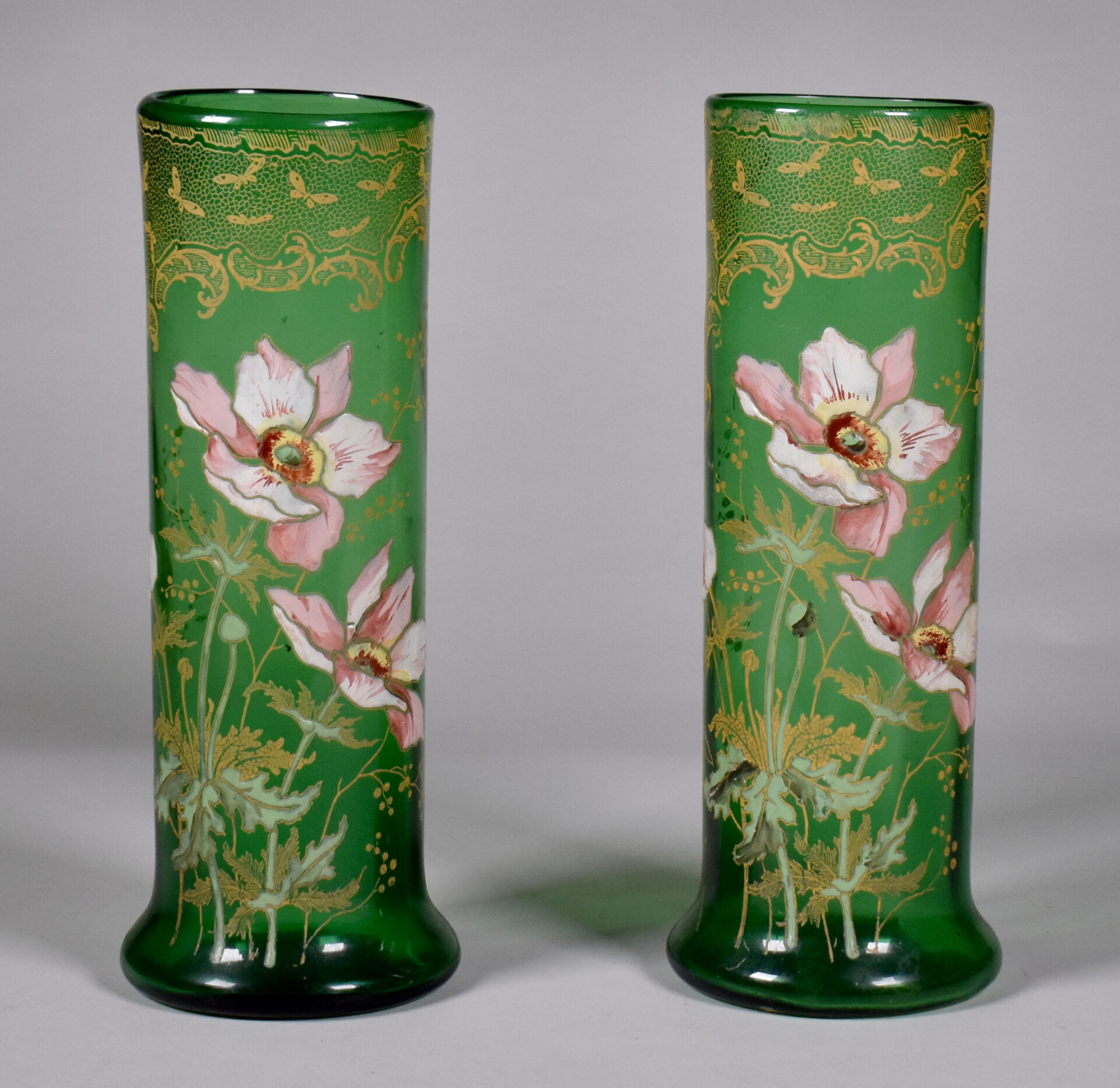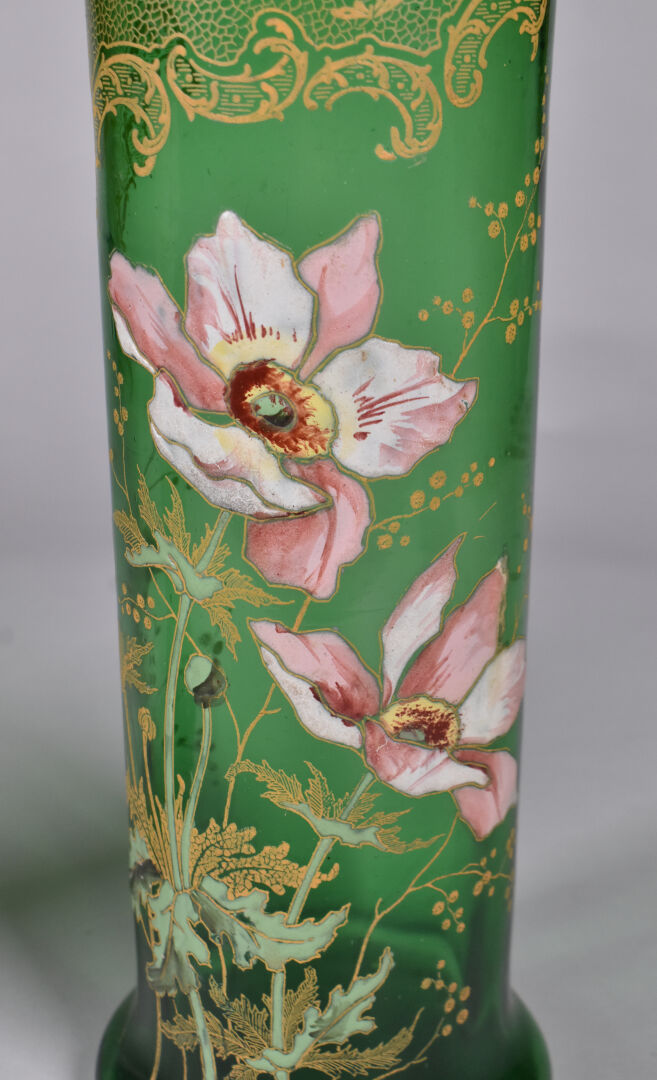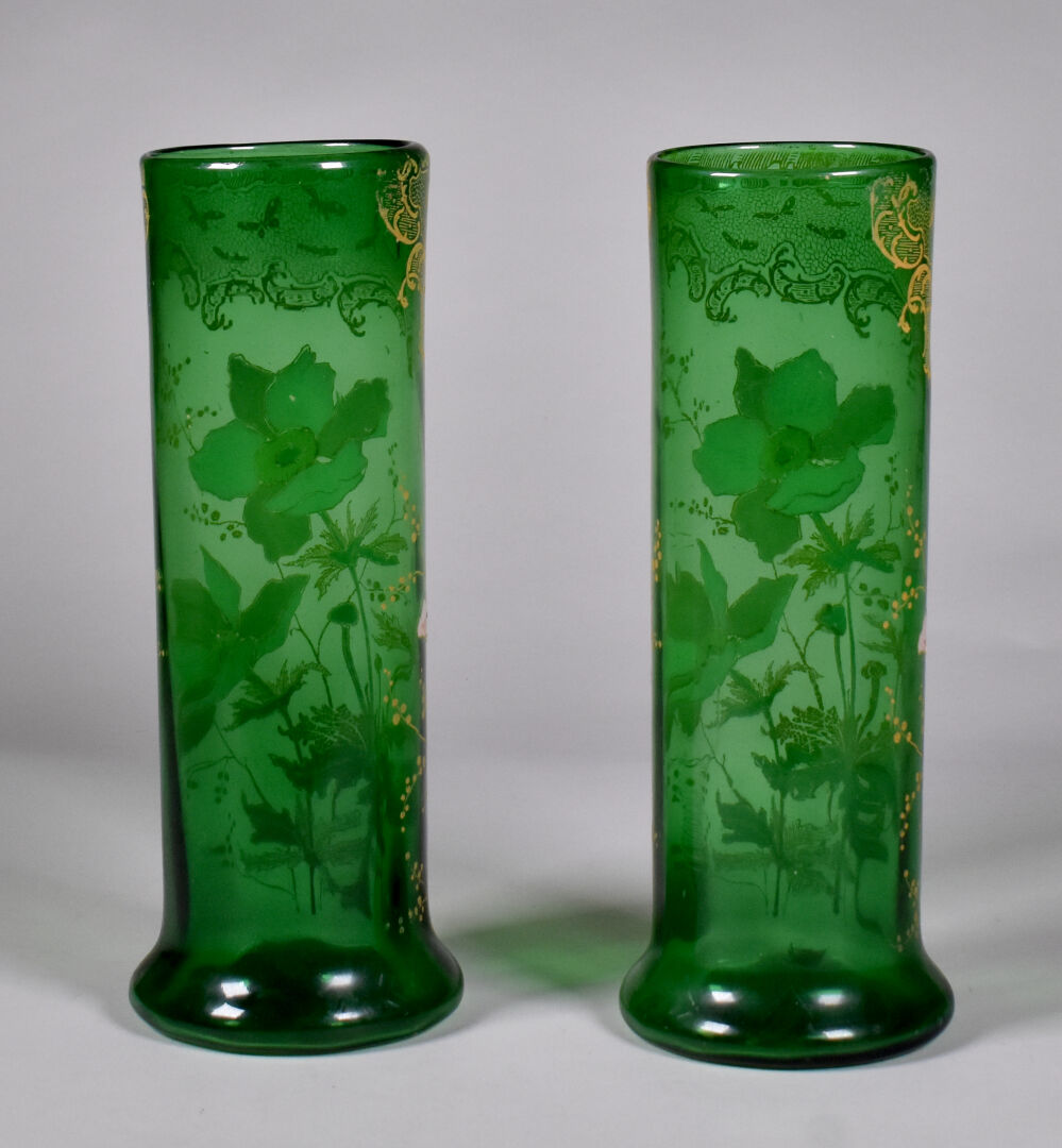 LEGRAS François-Théodore (1839-1916). Paire de vases en verre vert à décor émaillé en polychromie d’anémones et papillons en dorure (quelques usures). Haut. : 31,5 cm.