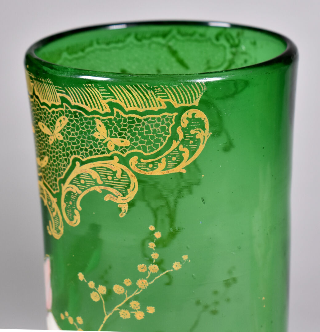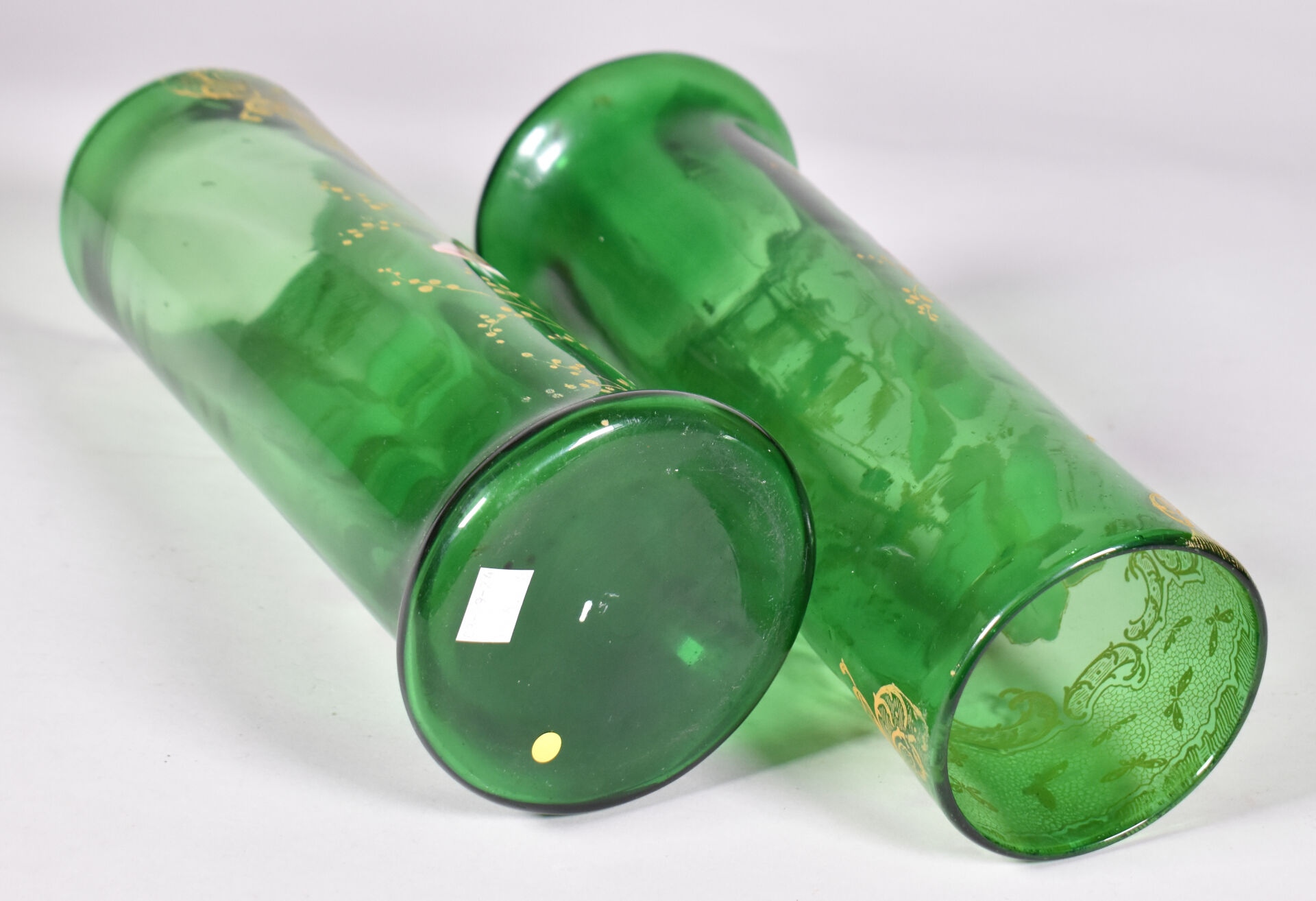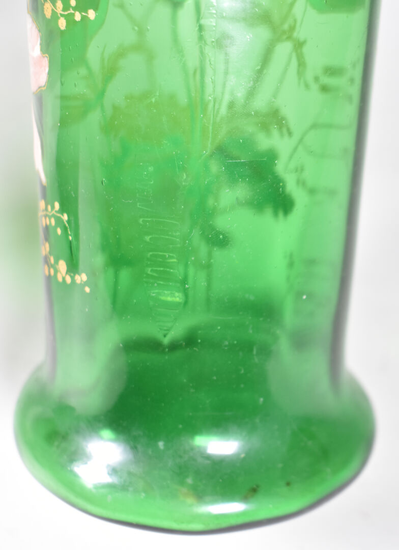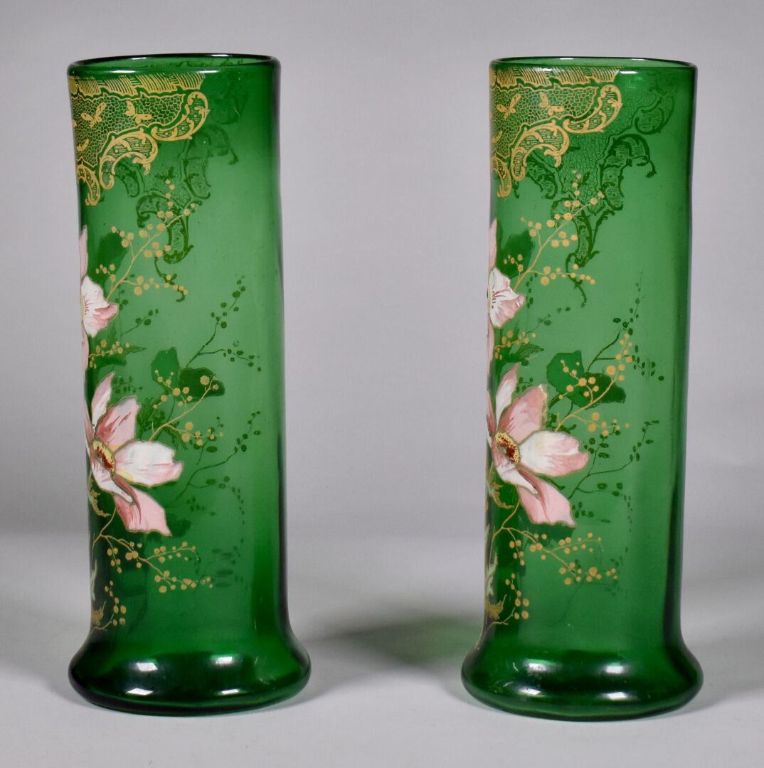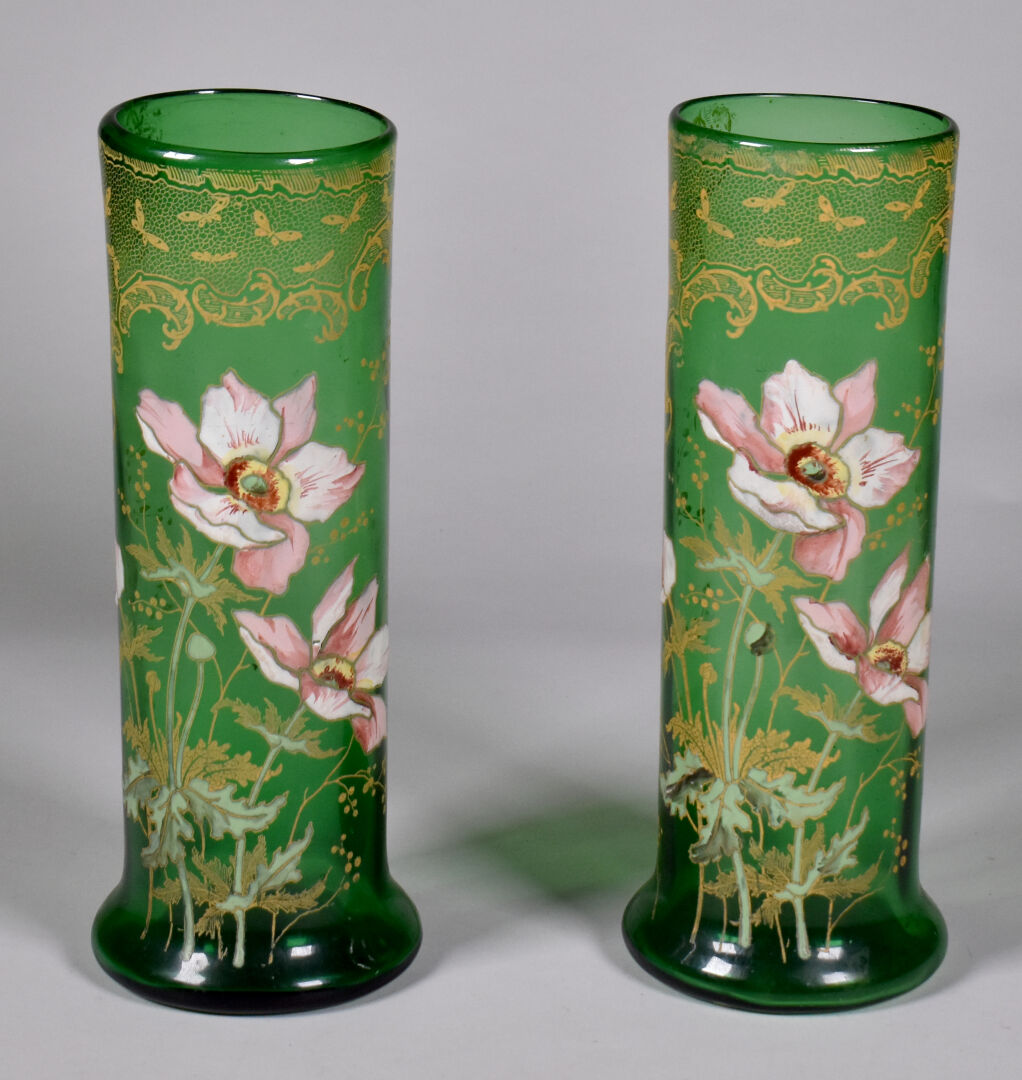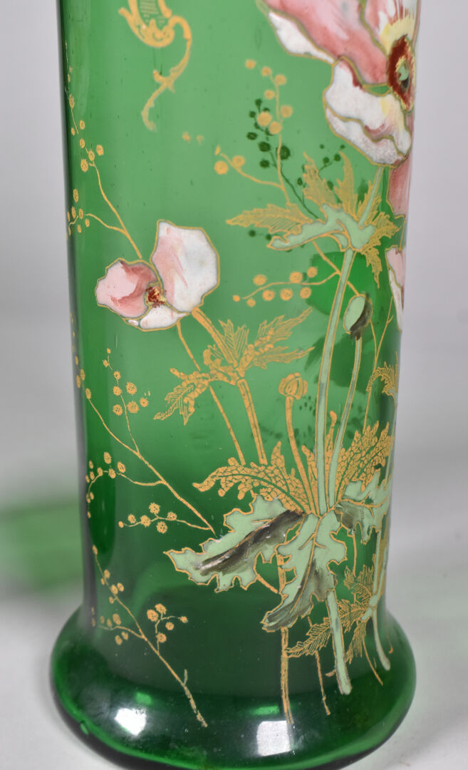 LEGRAS François-Théodore (1839-1916). Paire de vases en verre vert à décor émaillé en polychromie d’anémones et papillons en dorure (quelques usures). Haut. : 31,5 cm.