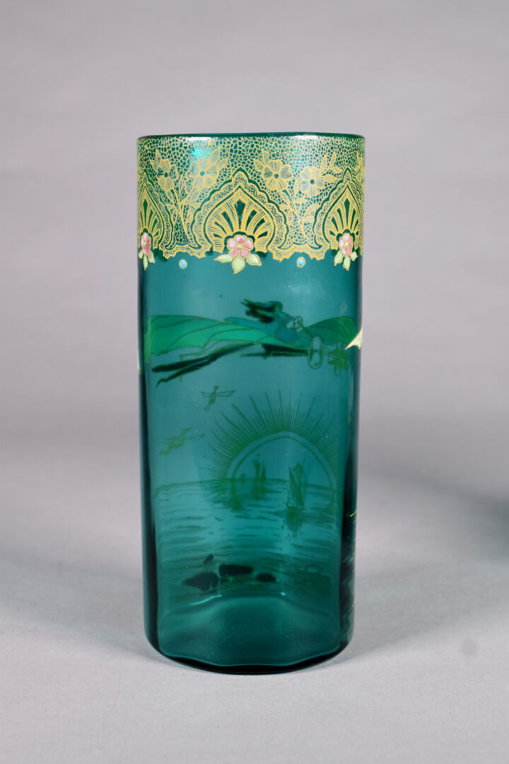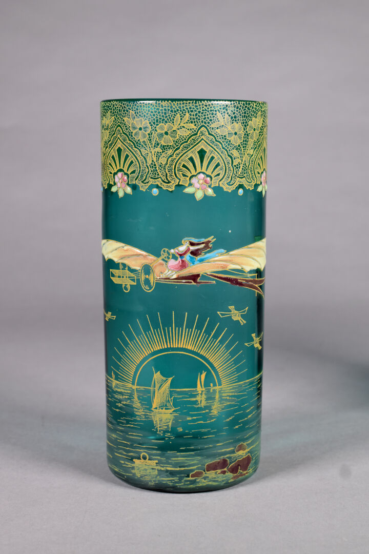 LEGRAS. Harriet Quimby, la traversée de la Manche le 16 avril 1912. Paire de vases rouleaux en verre teinté vert émeraude. Épreuve au décor commémoratif émaillé. Rehauts de dorure dans le décor et dans le motif d’arabesques en pourtour du col. Haut. : 23,5 cm.