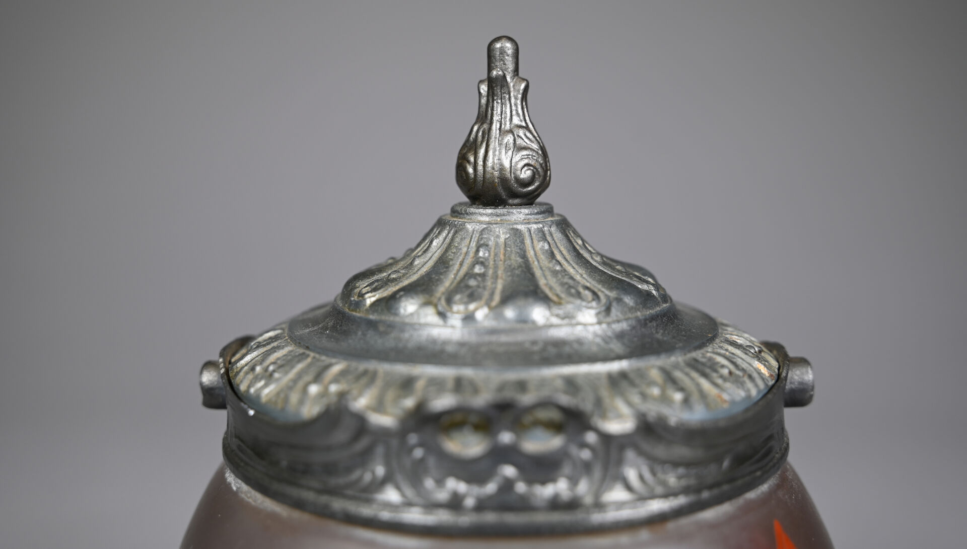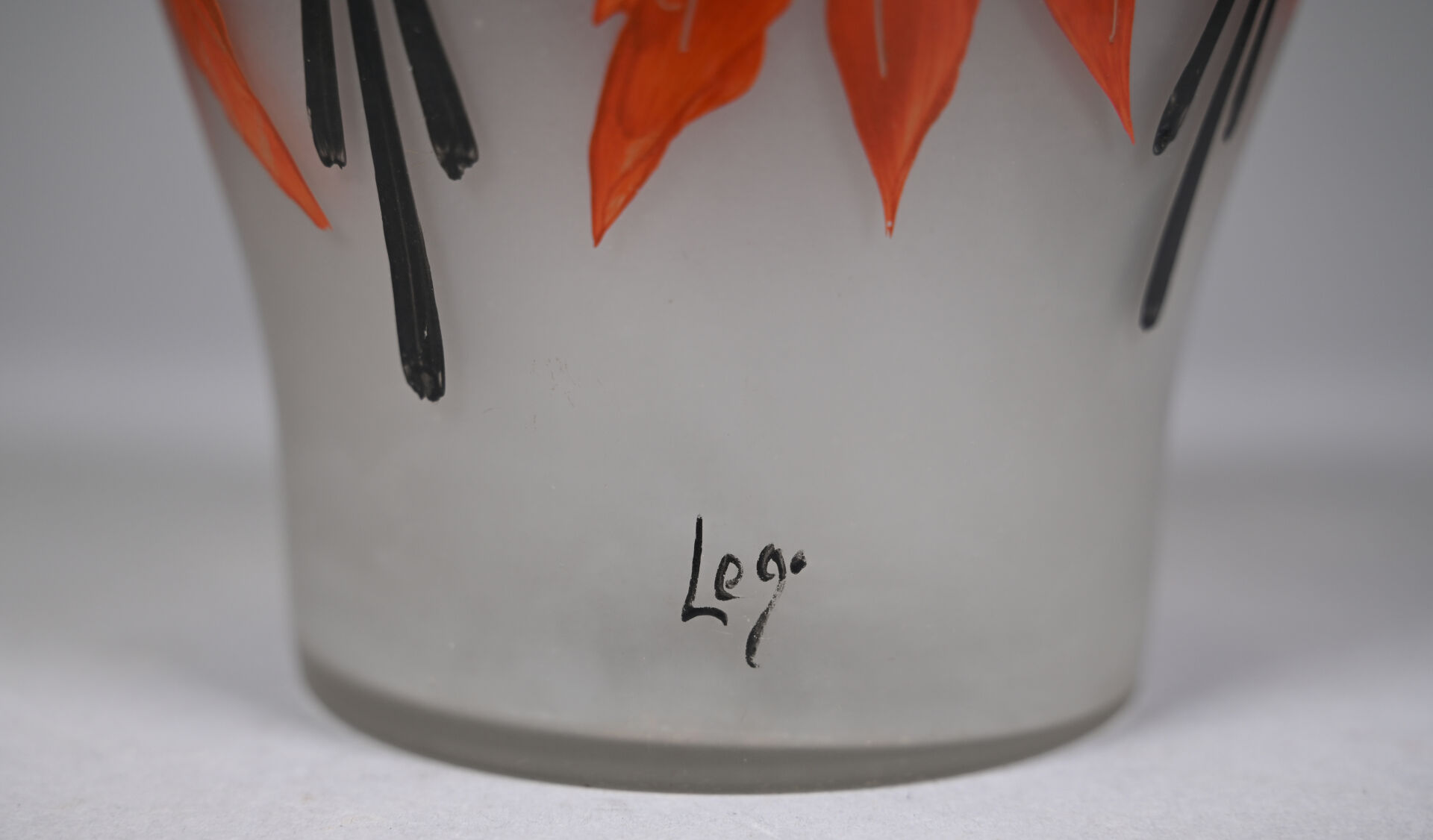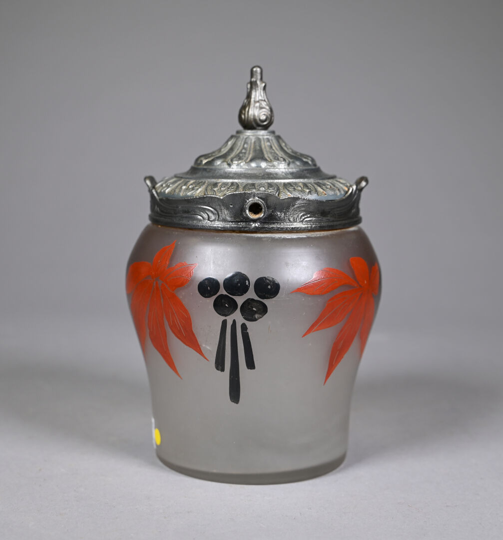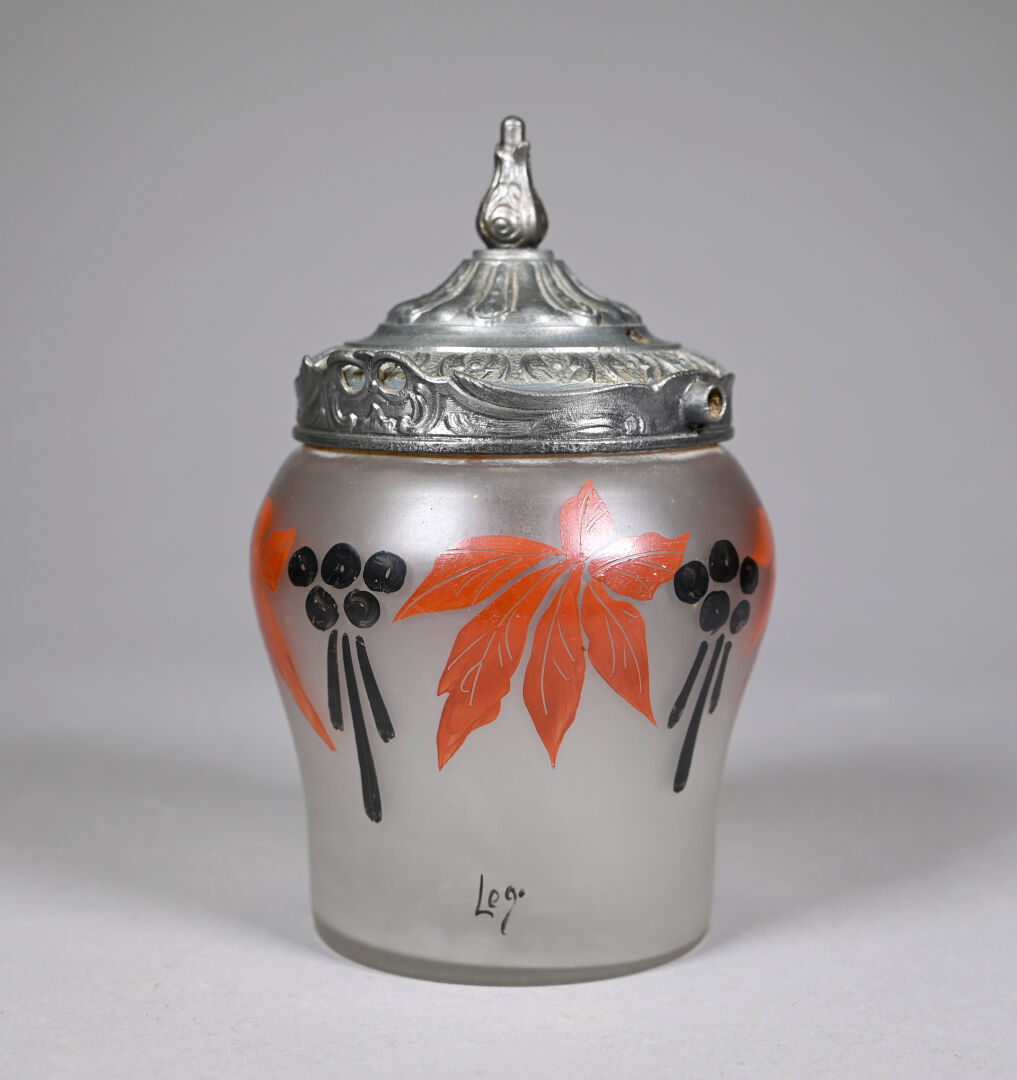 LEGRAS. Pot à biscuit en verre sablé à décor en rouge et noir de feuilles et grappes. Le col et le couvercle en étain (manque l’anse). Signé. Haut. : 21 cm.