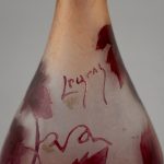 LEGRAS. Vase balustre à haut col en verre multicouche à décor dégagé à l’acide de vigne vierge en mauve sur fond rosé (fèle de cuisson). Signé dans le décor. Haut. : 22 cm.