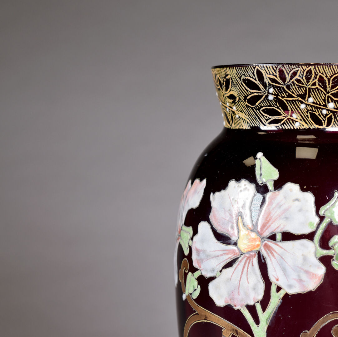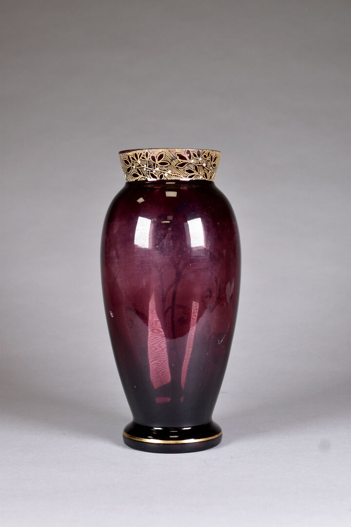 LEGRAS. Vase balustre en verre mauve à décor émaillé en polychromie de fleurs. La bordure en dorure. Non signé. Haut. : 32 cm.