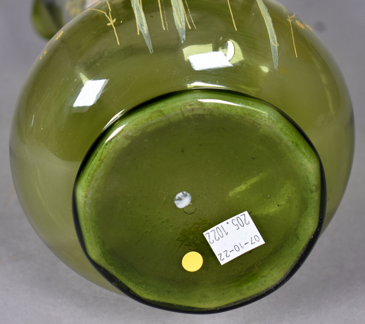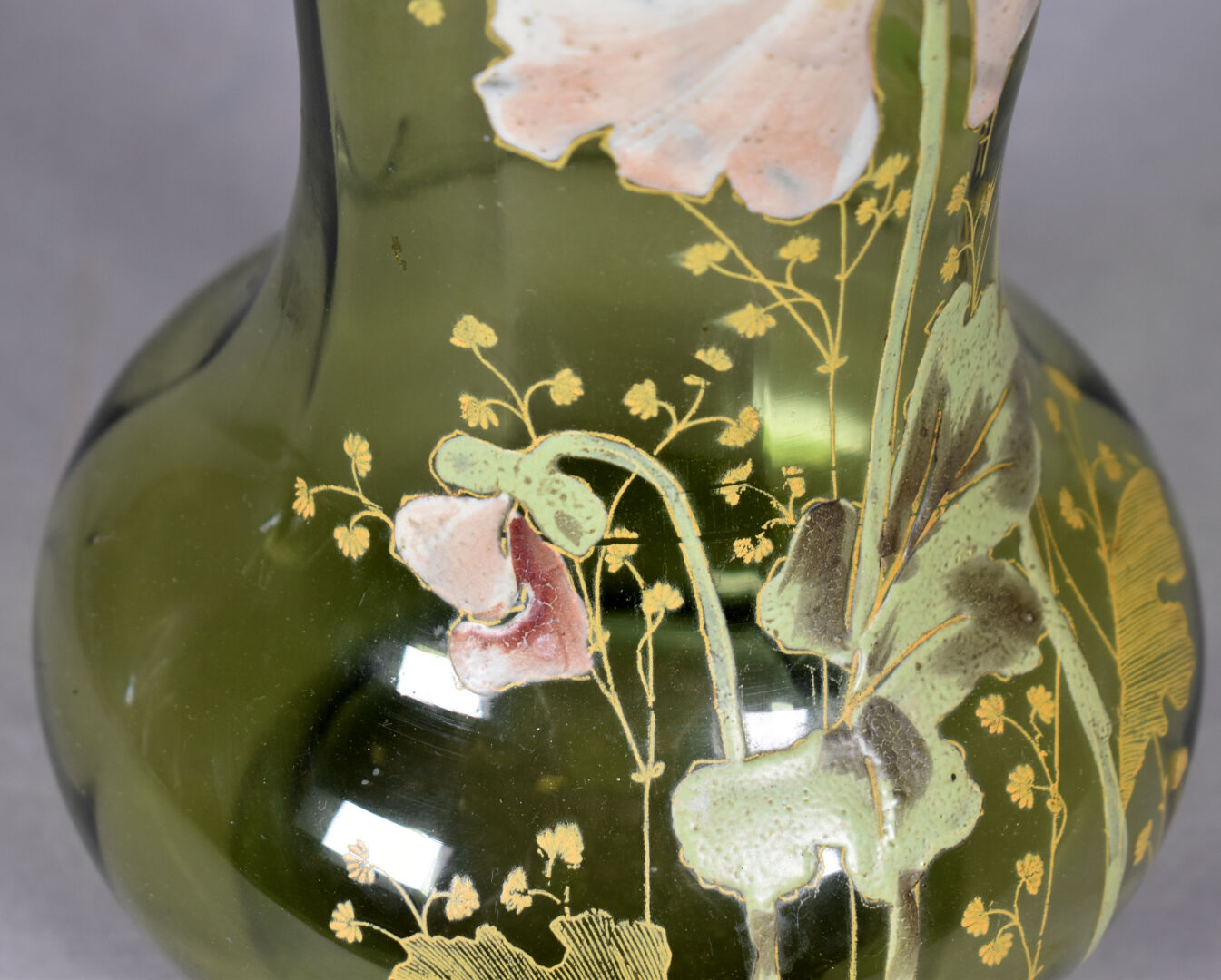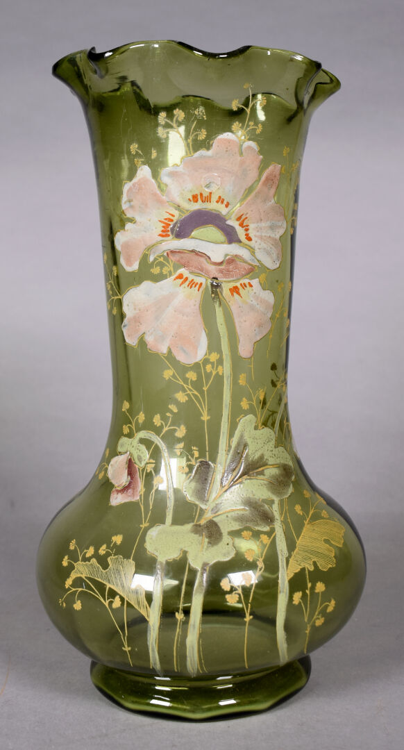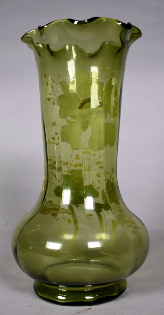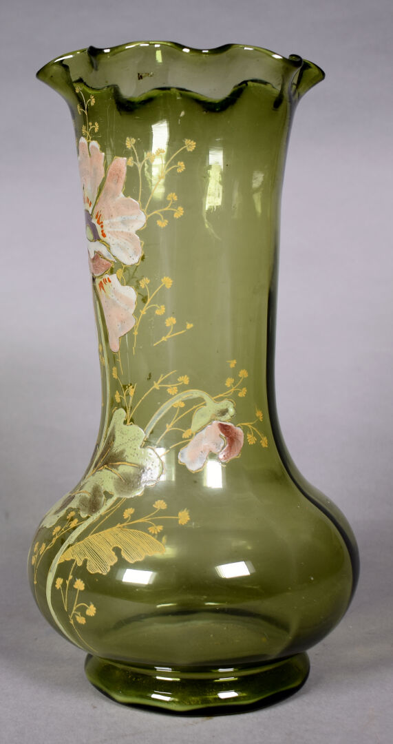 LEGRAS ?. Vase bourelé à haut col à corole en verre vert à décor émaillé en polychromie de fleurs . Haut. : 28 cm.