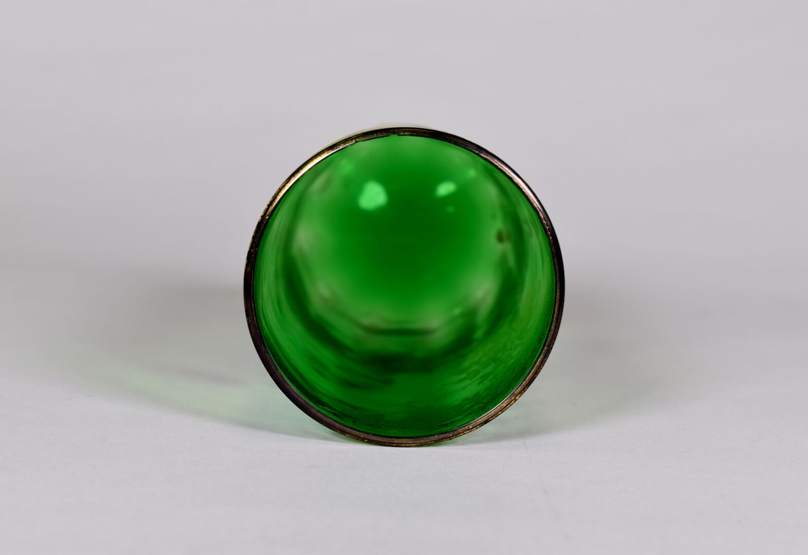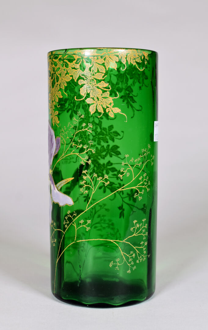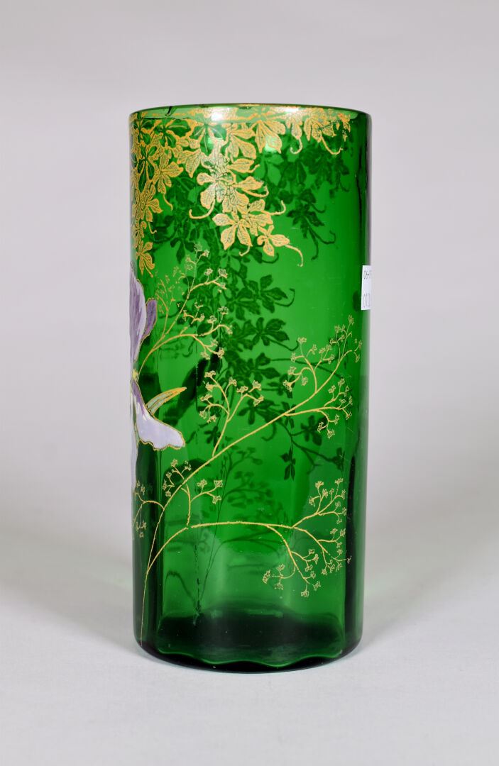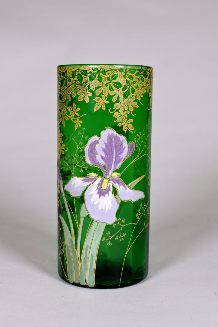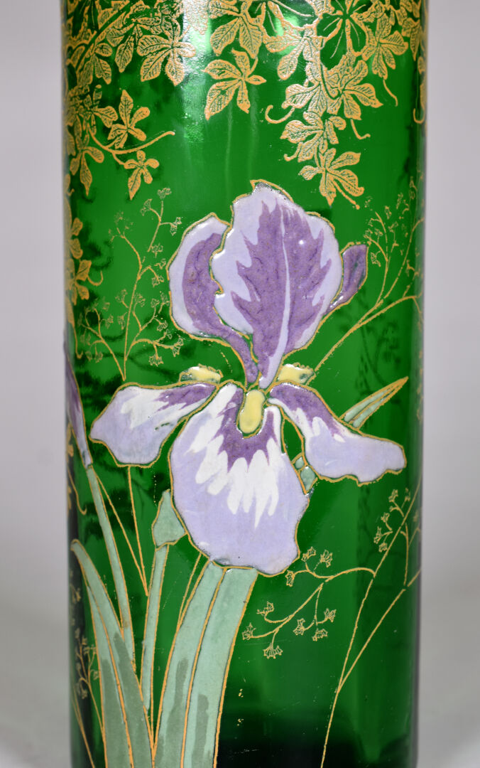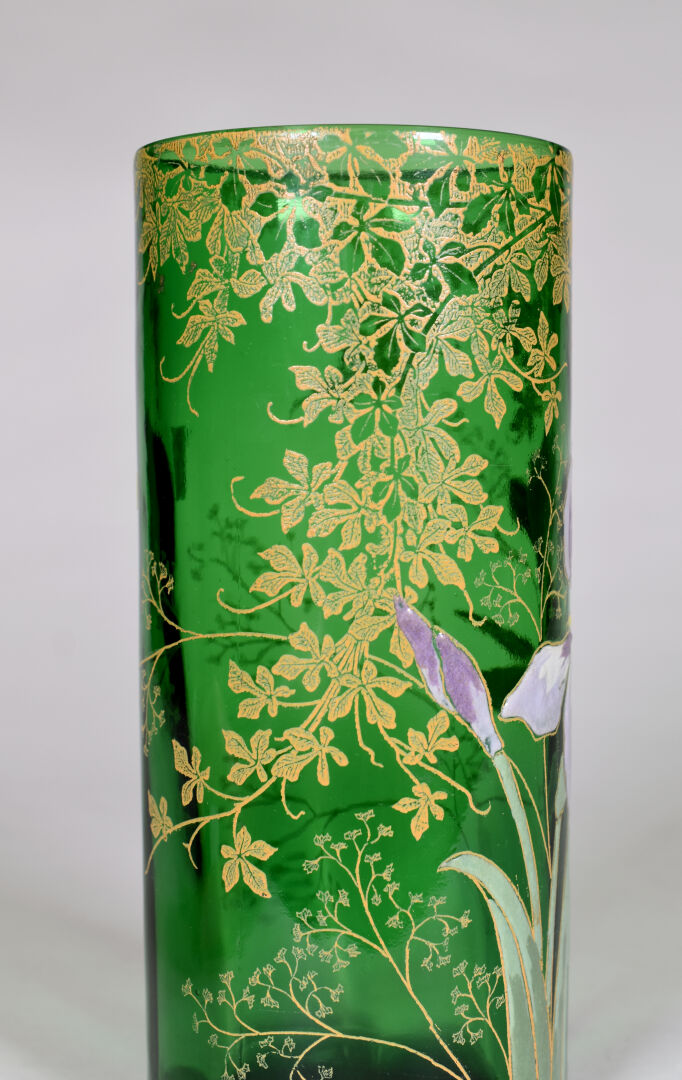 LEGRAS. Vase rouleau en verre vert à décor émaillé en polychromie d’iris et dorure (petit éclat à égrenures à l’ntérieur du col). Haut. : 21 cm.