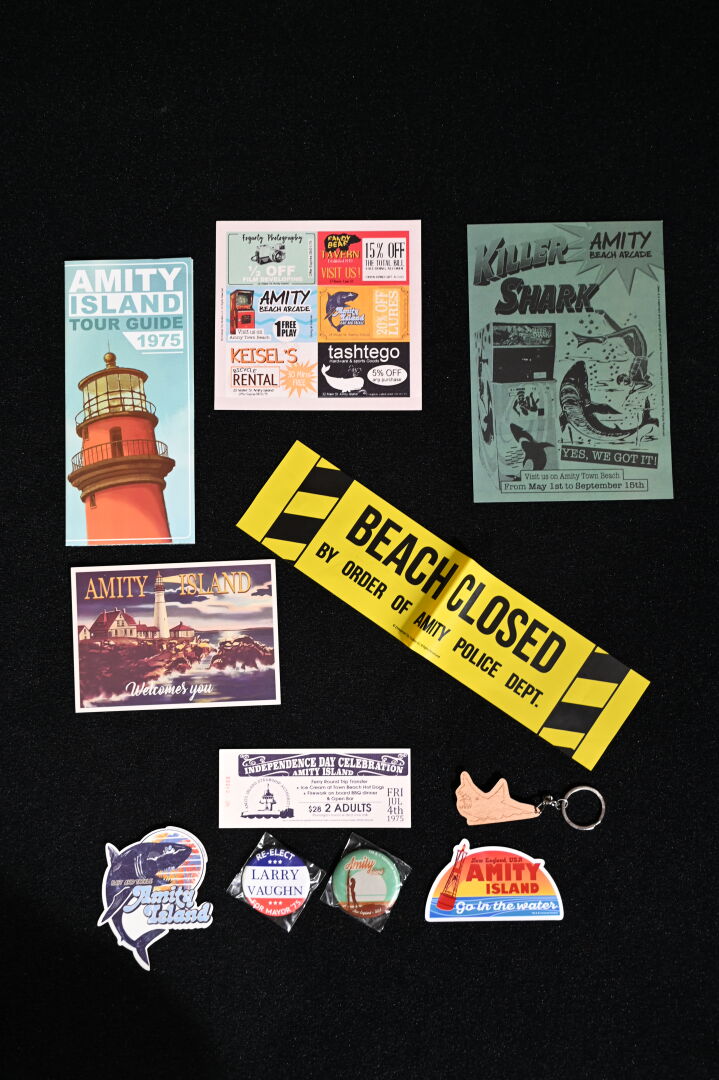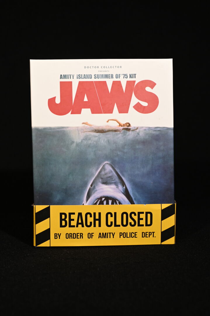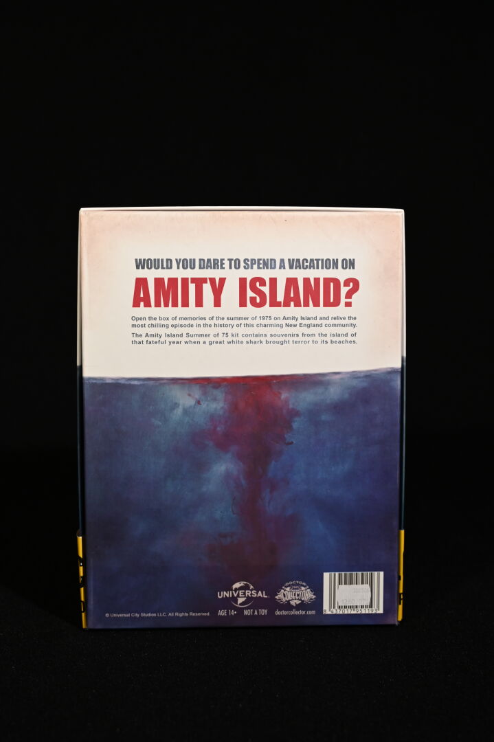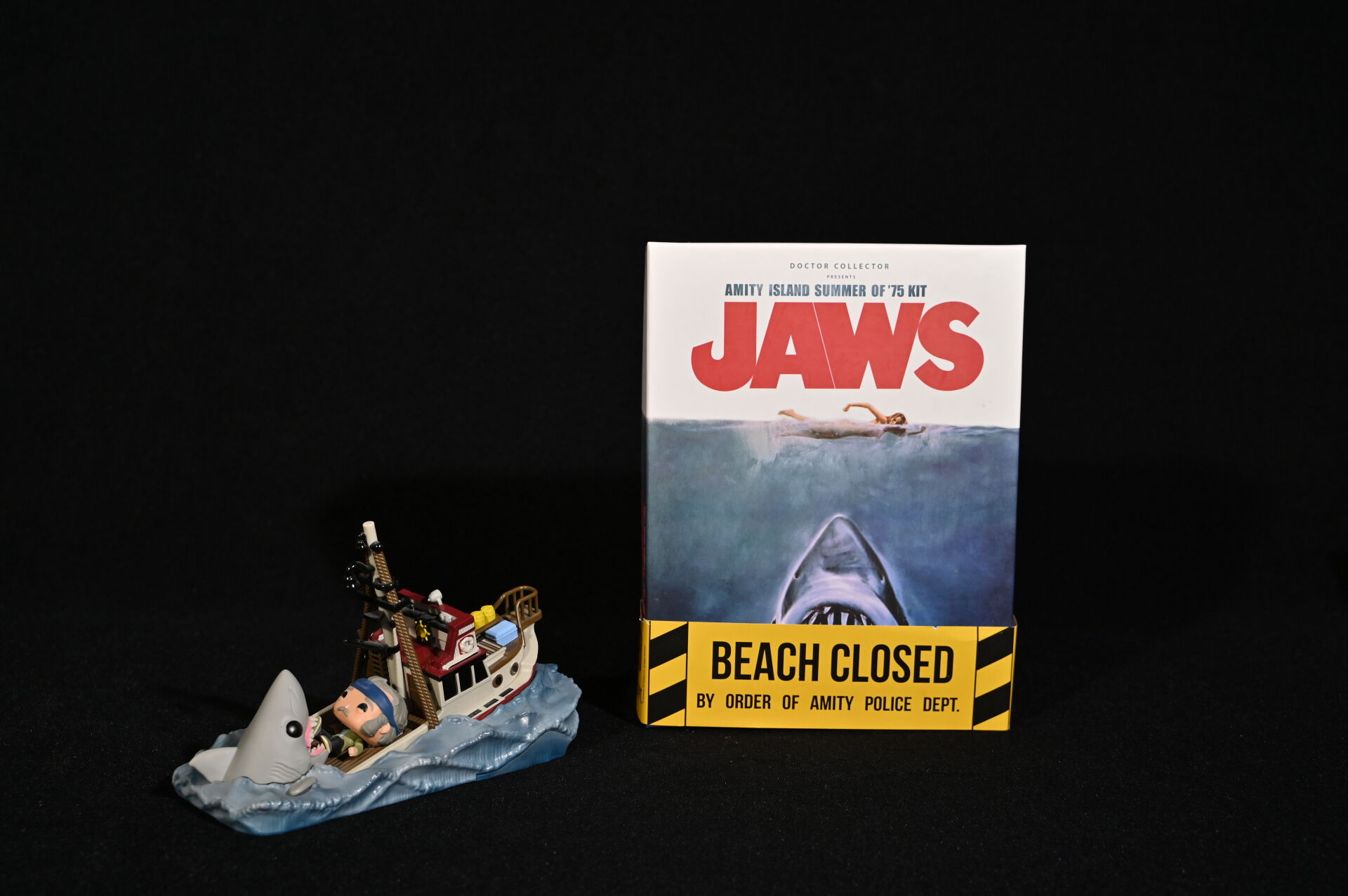 LES DENTS DE LA MER – JAWS – DOCTOR COLLECTOR. Boîte « Amity Island Summer of ’75 Kit » comprenant des articles en rapport avec le film dont carte, serviette de plage, badges etc.. Dim. de la boîte : 26,5 x 16 x 6 cm. On joint une figurine Funko du pêcheur subissant une attaque sur le bateau. 2021. Dim. de la figurine : 16 x 23 x 12 cm.