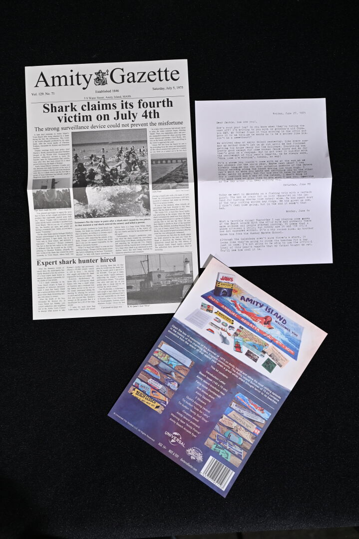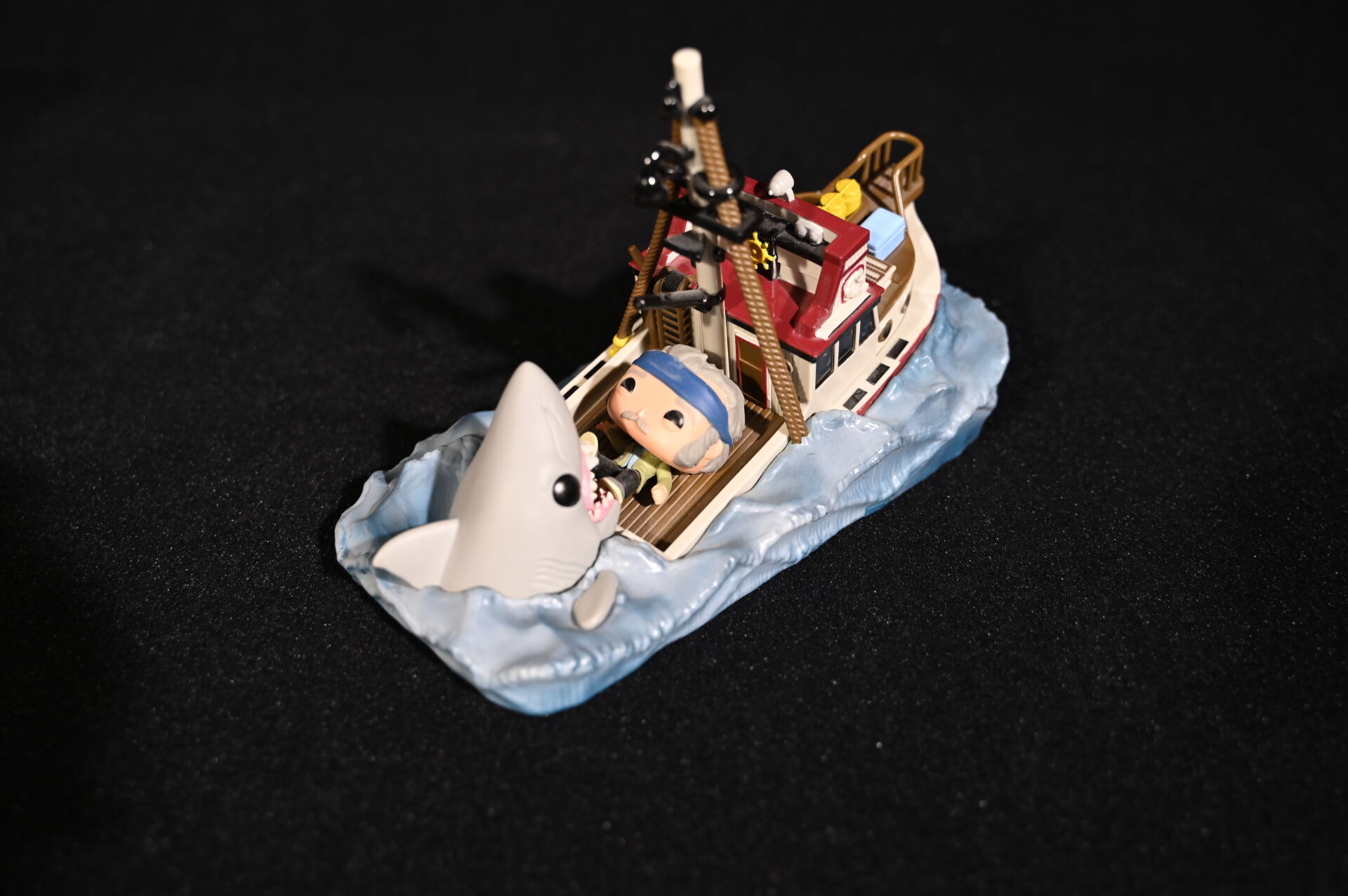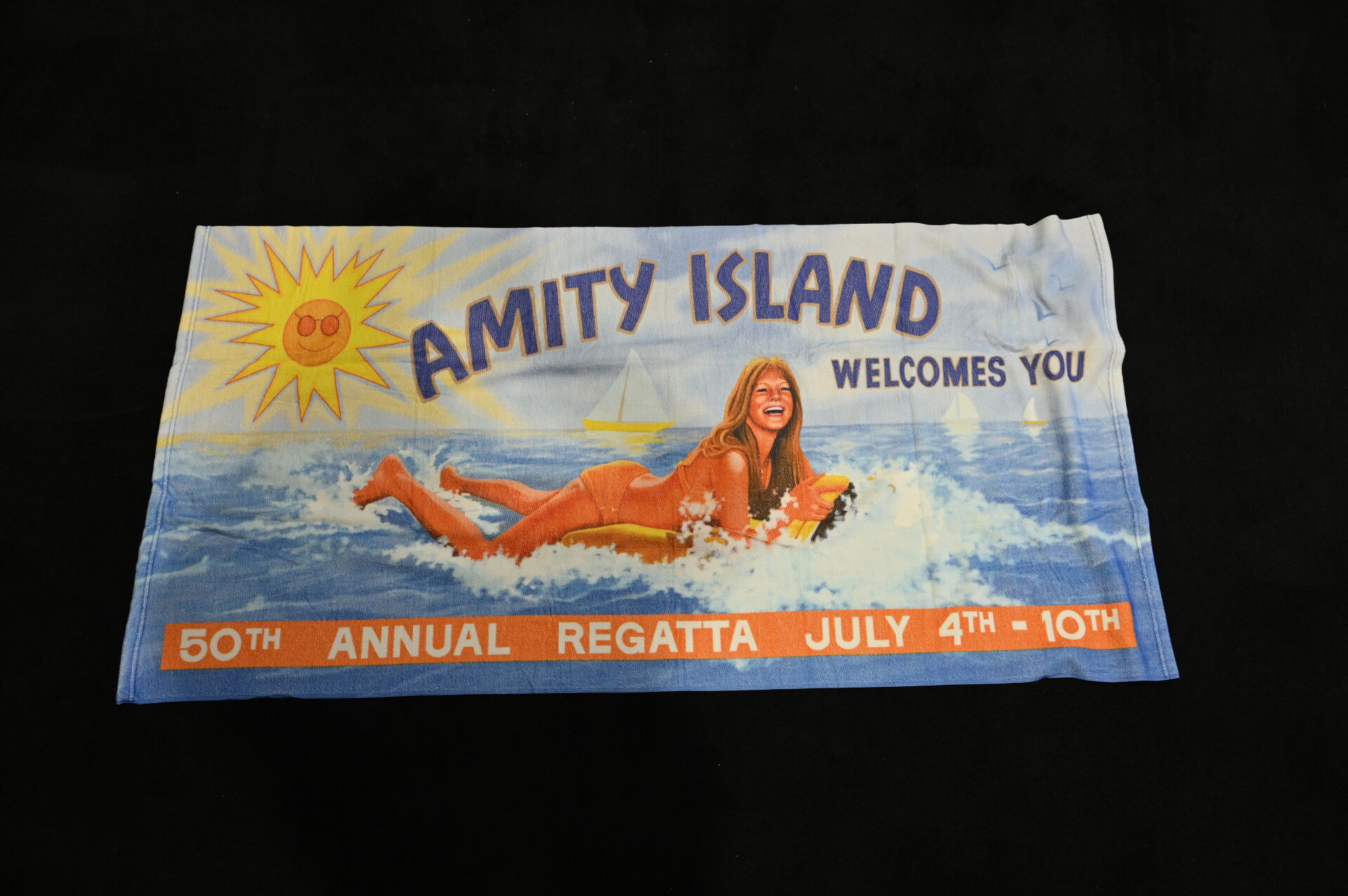 LES DENTS DE LA MER – JAWS – DOCTOR COLLECTOR. Boîte « Amity Island Summer of ’75 Kit » comprenant des articles en rapport avec le film dont carte, serviette de plage, badges etc.. Dim. de la boîte : 26,5 x 16 x 6 cm. On joint une figurine Funko du pêcheur subissant une attaque sur le bateau. 2021. Dim. de la figurine : 16 x 23 x 12 cm.