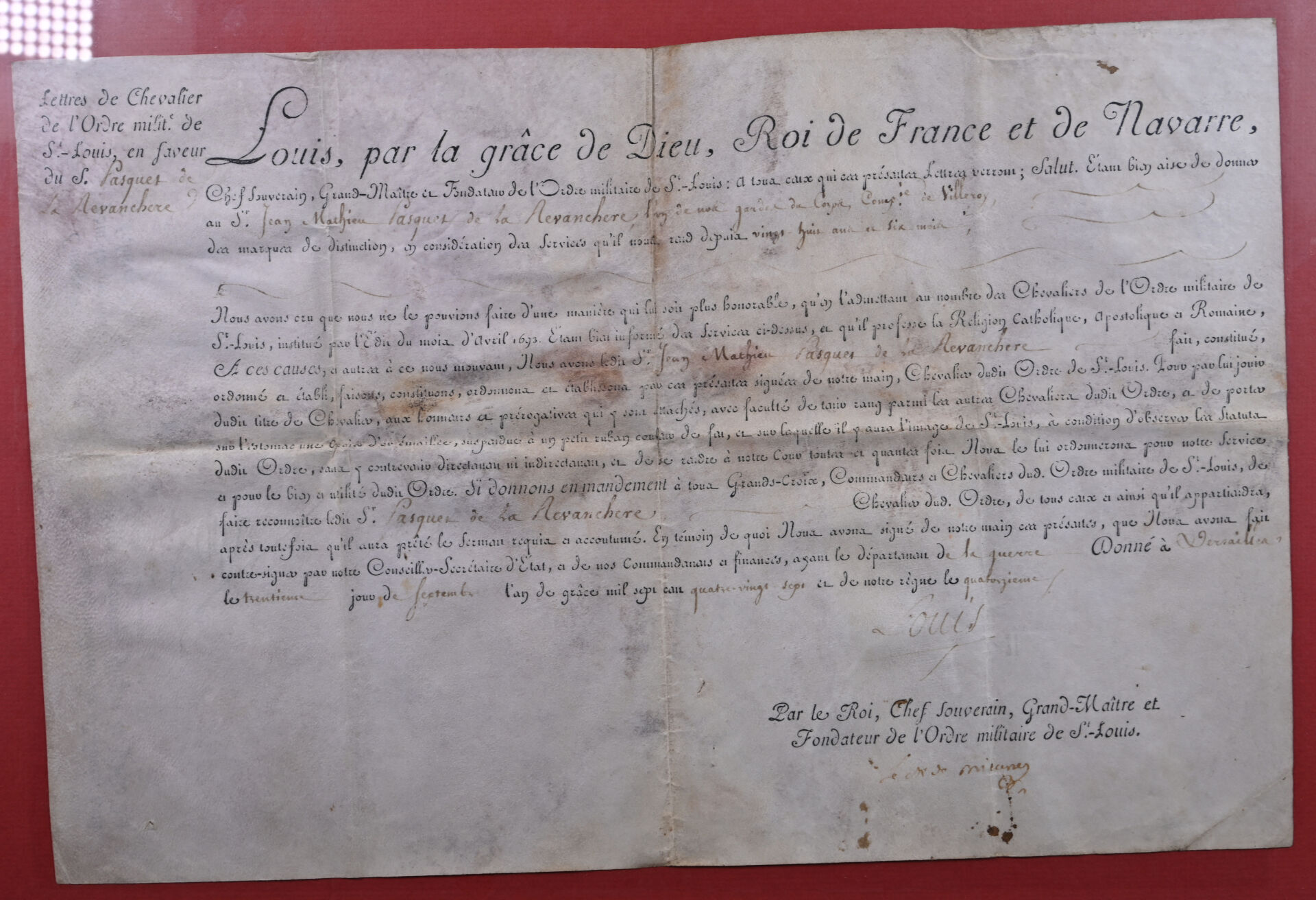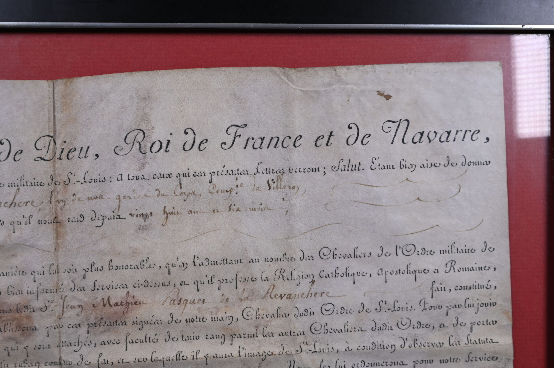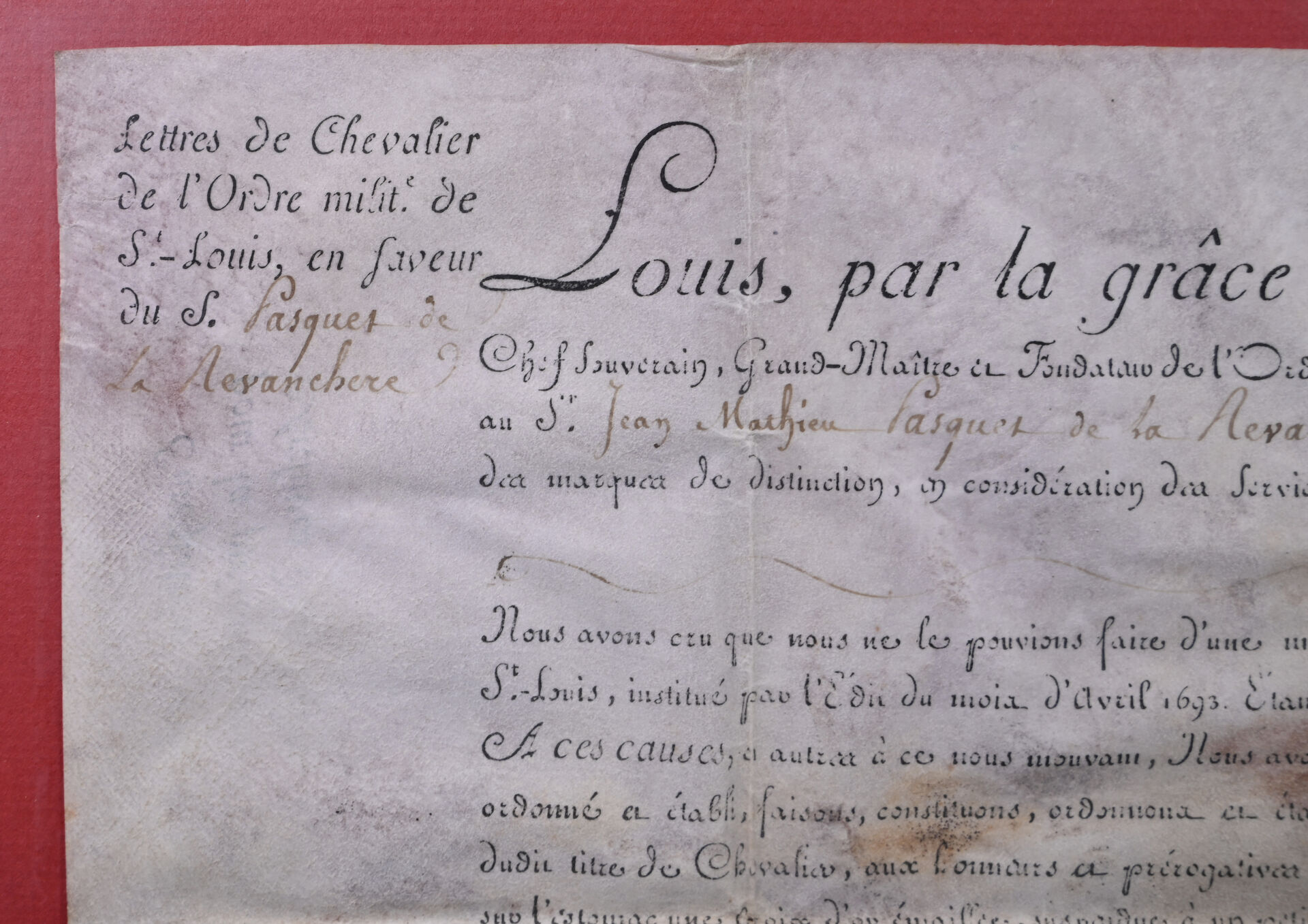 Lettre de Chevalier de l’ordre militaire de St-Louis en faveur de Sieur Pasquet de l’Arevanchere. Vélin, 1787. 27,5 x 42,5 cm. Encadré.