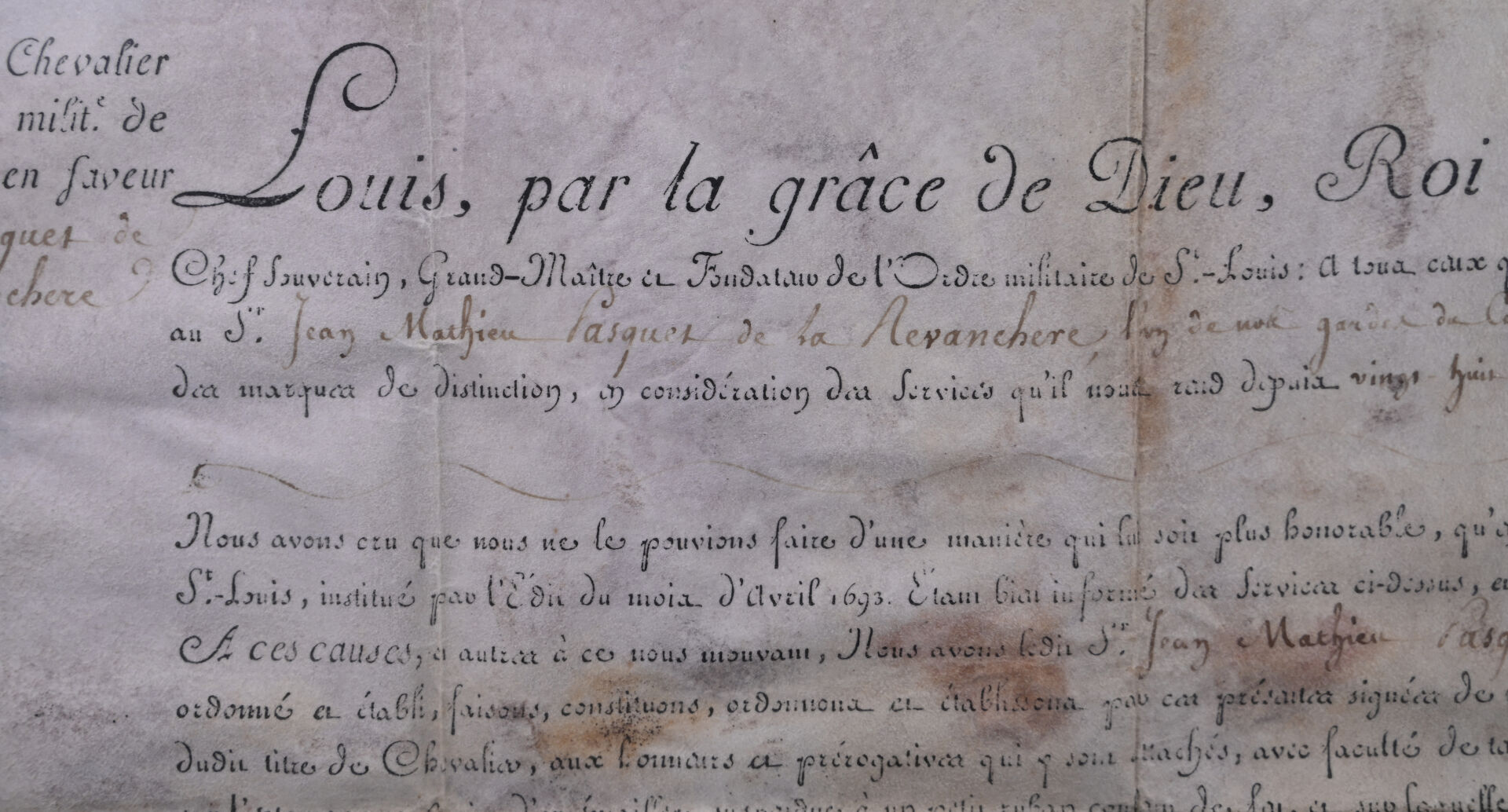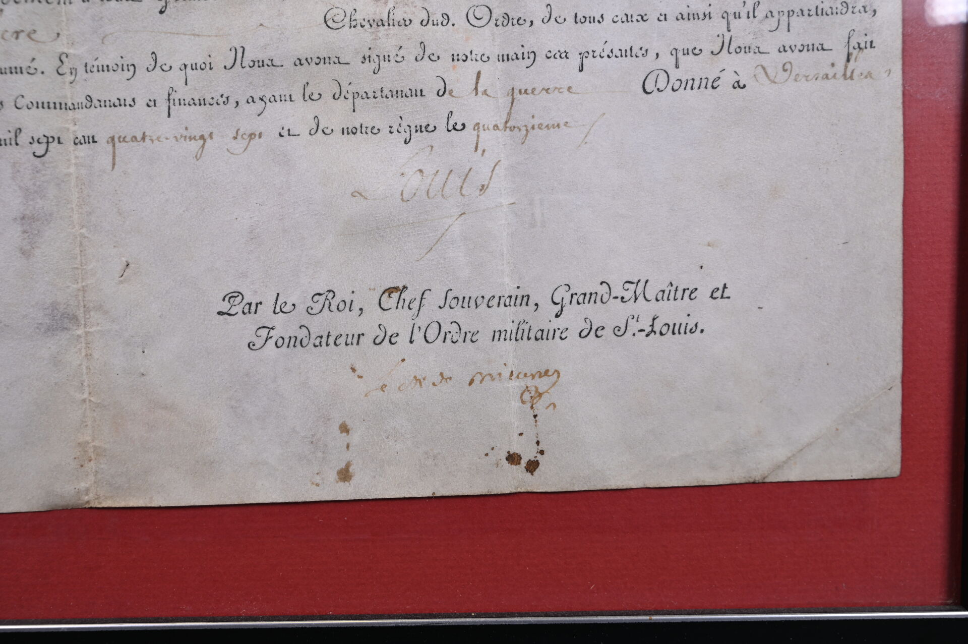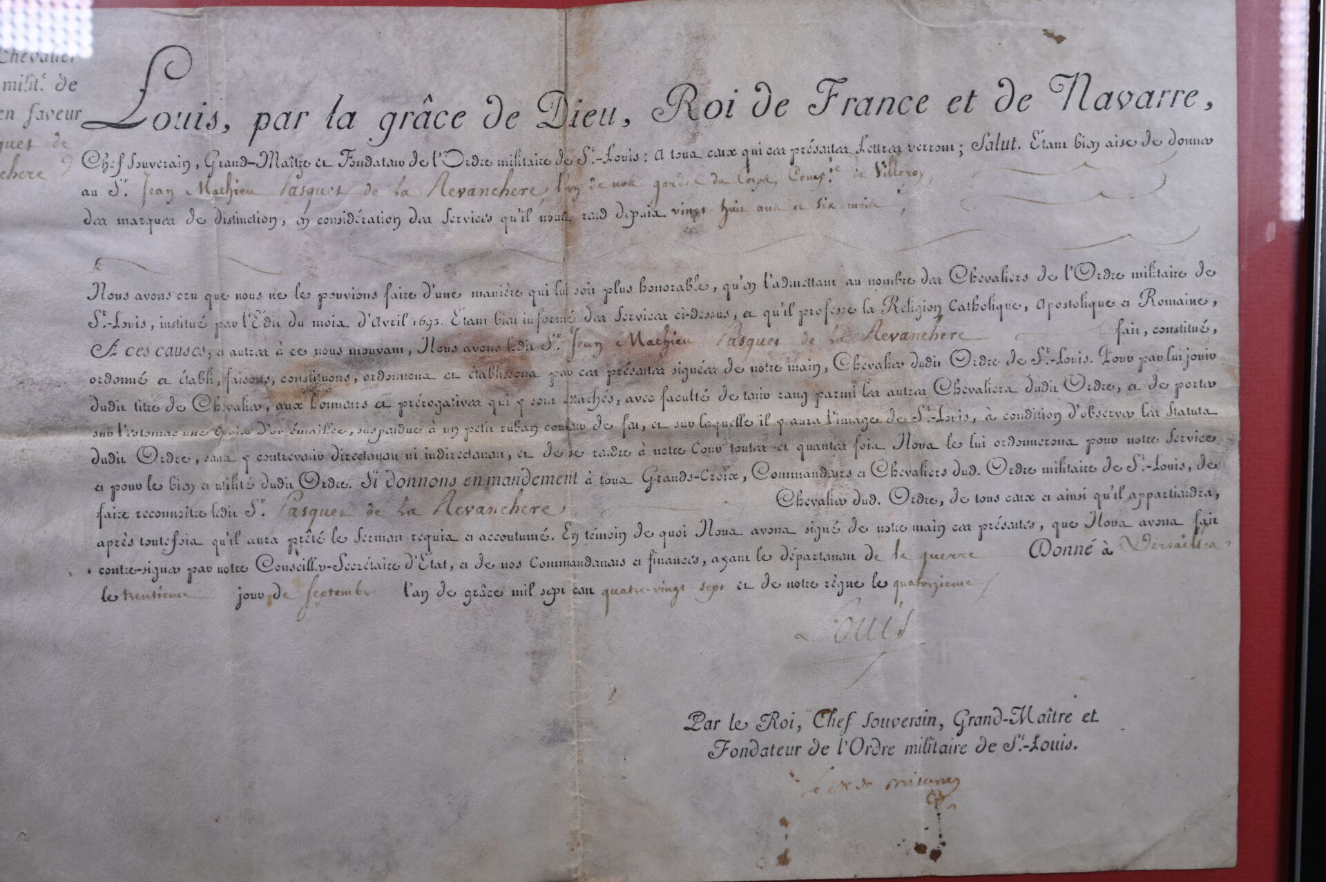 Lettre de Chevalier de l’ordre militaire de St-Louis en faveur de Sieur Pasquet de l’Arevanchere. Vélin, 1787. 27,5 x 42,5 cm. Encadré.