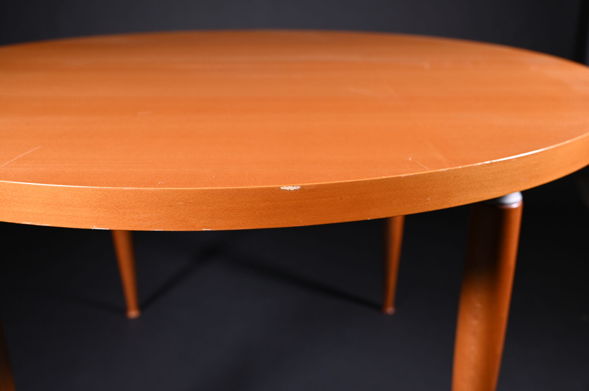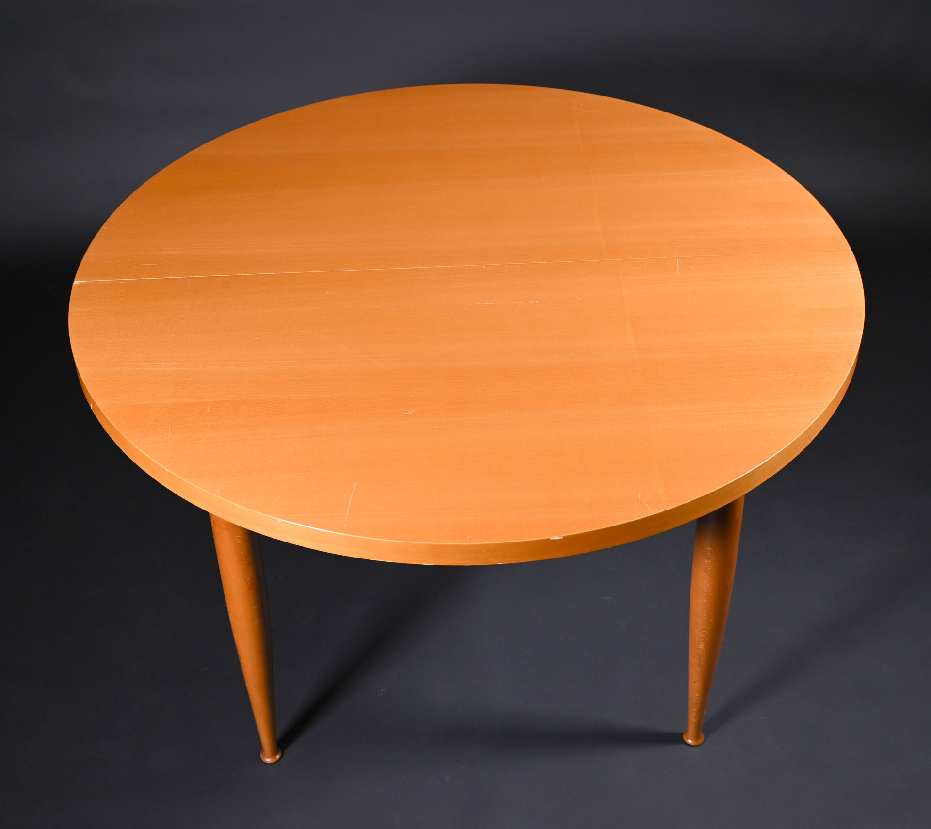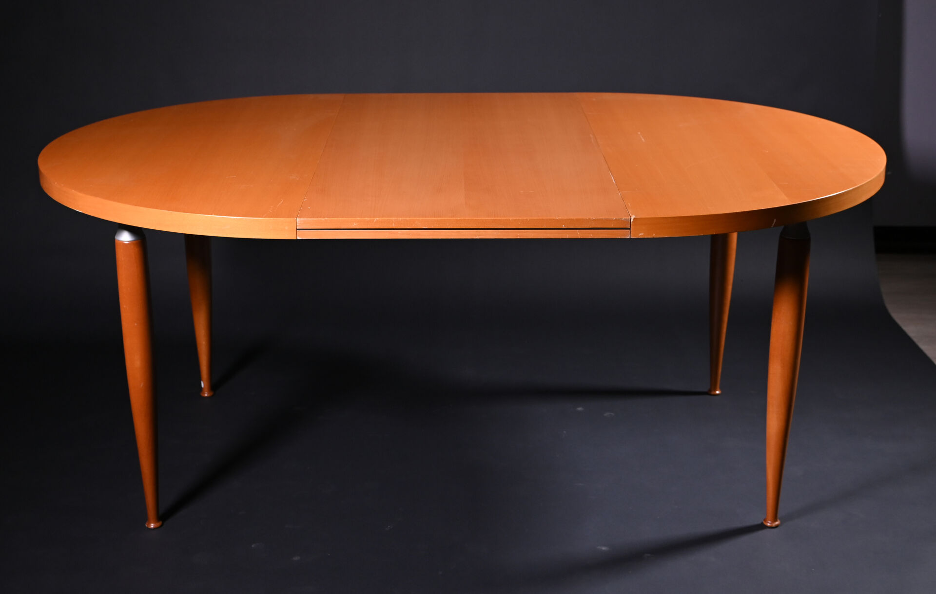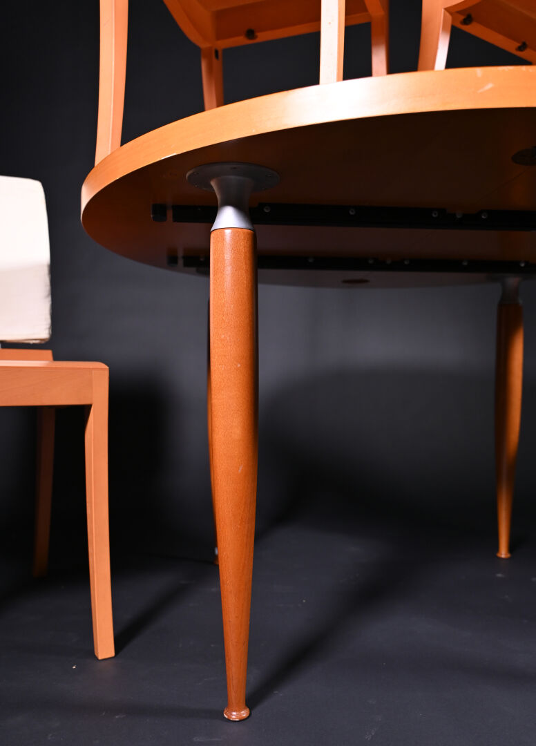 LIGNE ROSET. Mobilier de salle à manger modèle FINN en aggloméré plaqué de bois blond et métal gris comprenant une table, quatre chaises et une allonge (un éclat usures d’usage et taches). haut. des chaises. : 88 cm – Haut. table : 74 cm. Diam. : 120 cm (sans allonge). Long ouverte : cm.