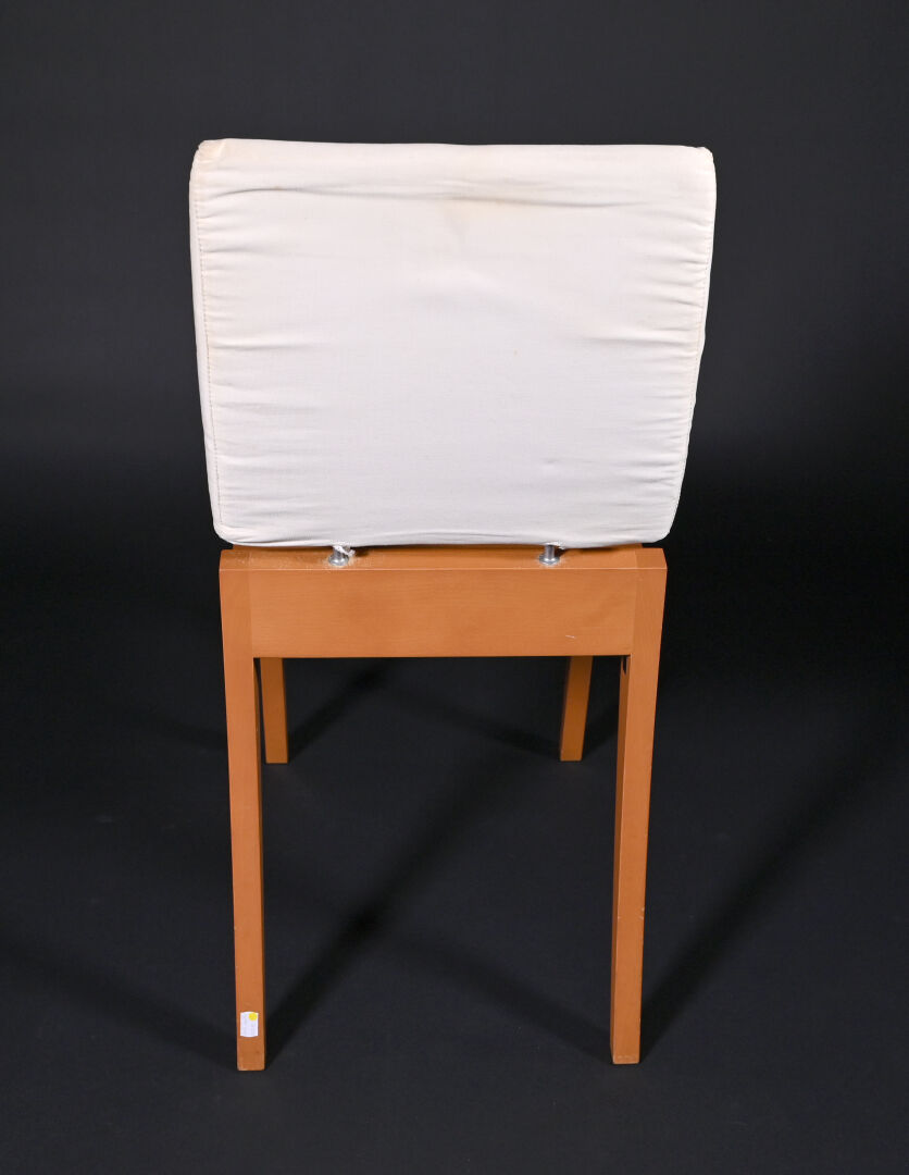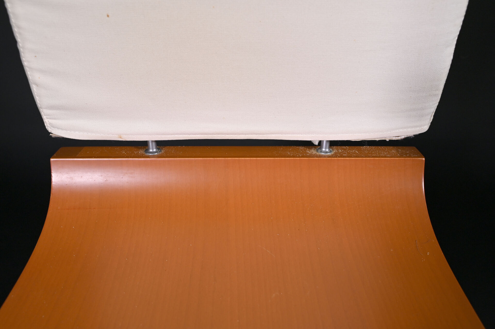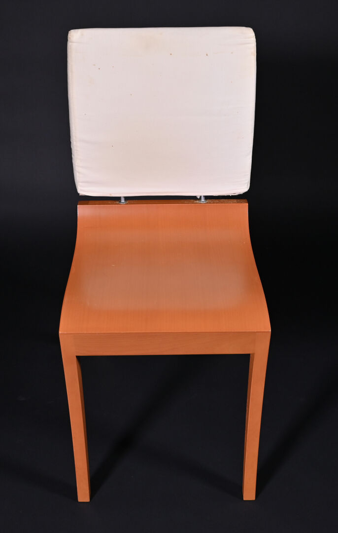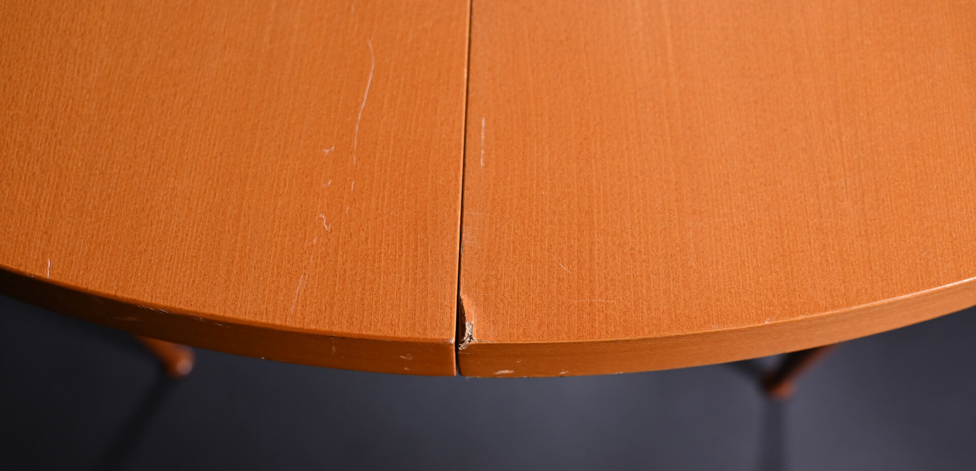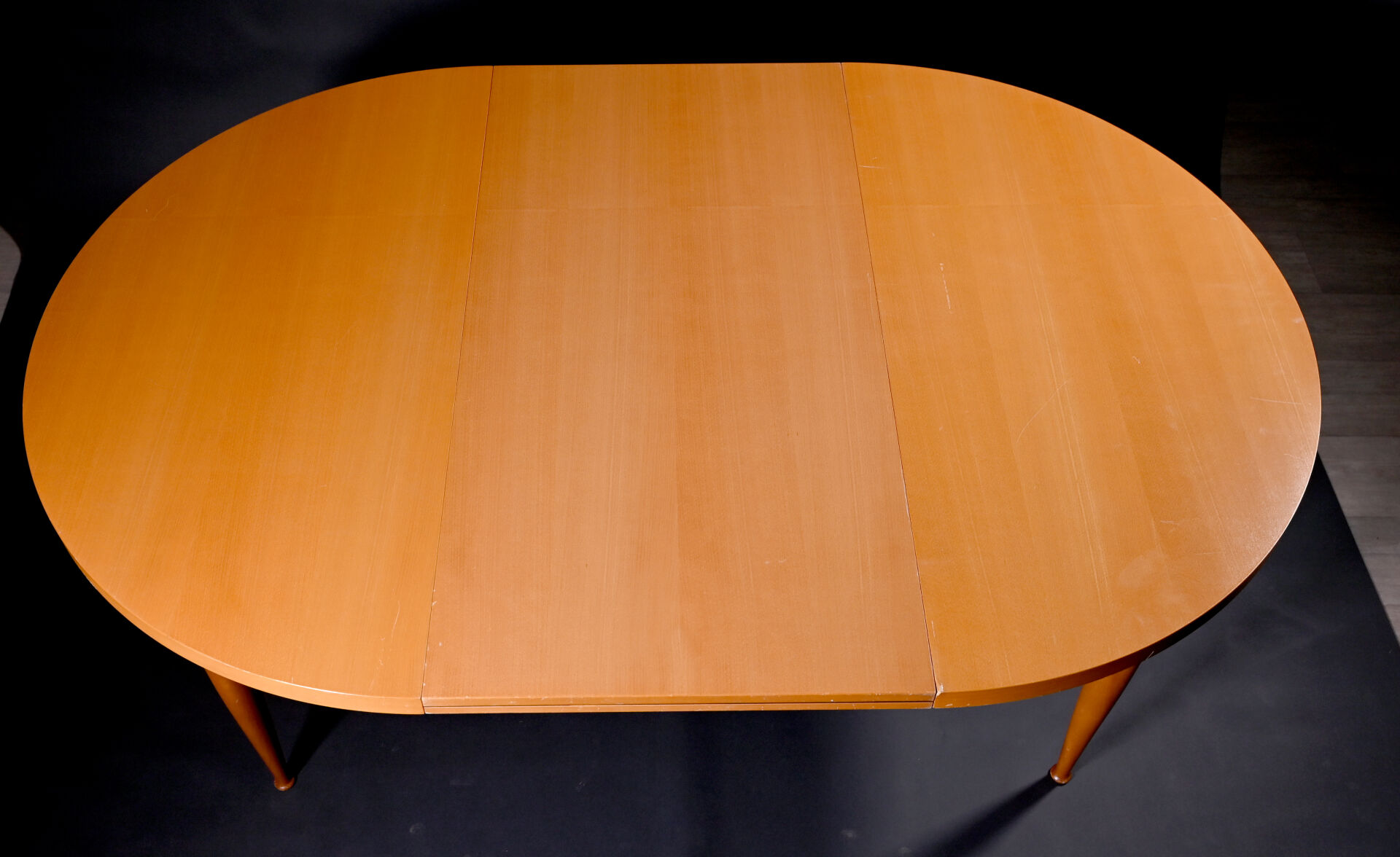 LIGNE ROSET. Mobilier de salle à manger modèle FINN en aggloméré plaqué de bois blond et métal gris comprenant une table, quatre chaises et une allonge (un éclat usures d’usage et taches). haut. des chaises. : 88 cm – Haut. table : 74 cm. Diam. : 120 cm (sans allonge). Long ouverte : cm.