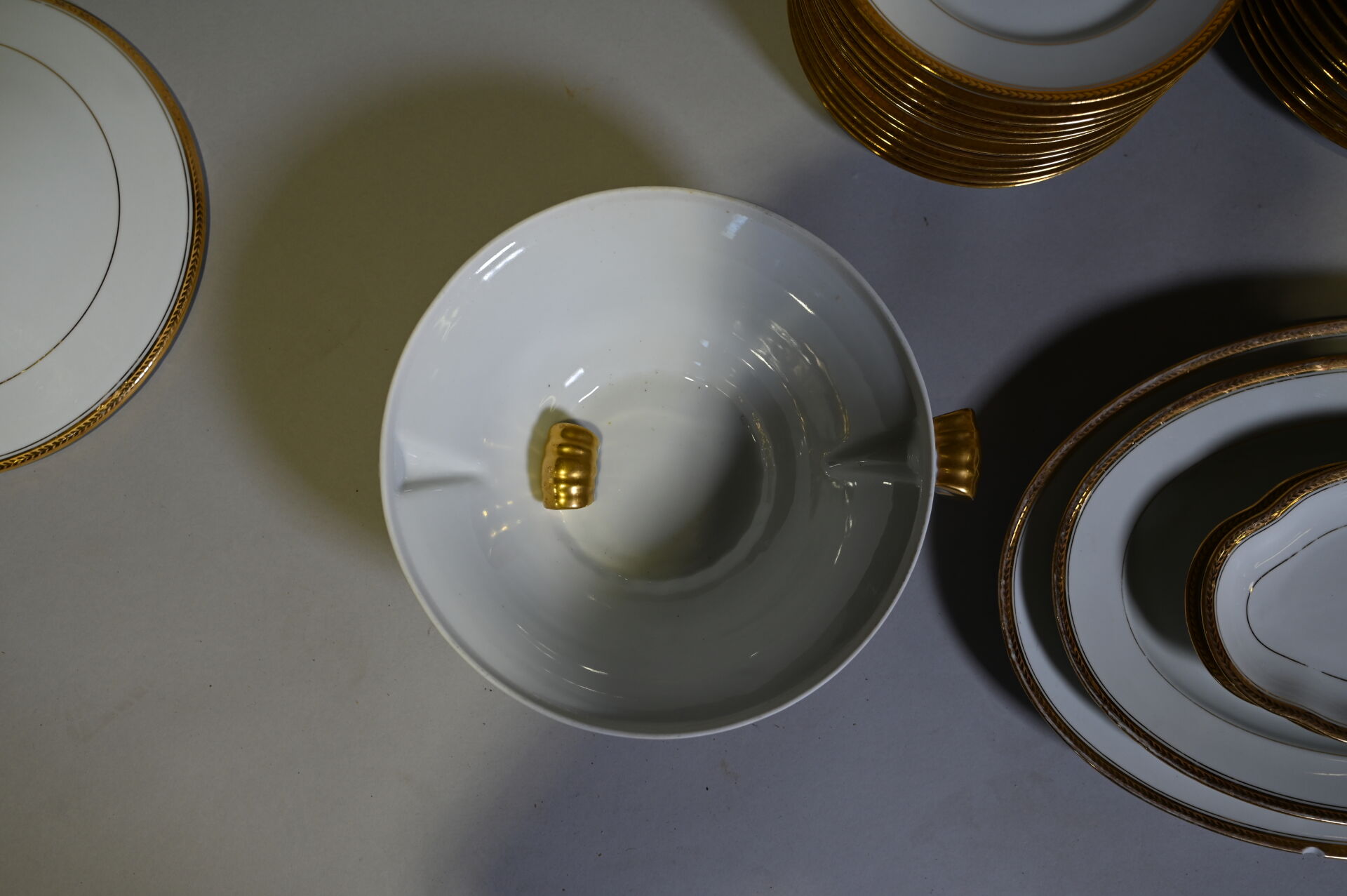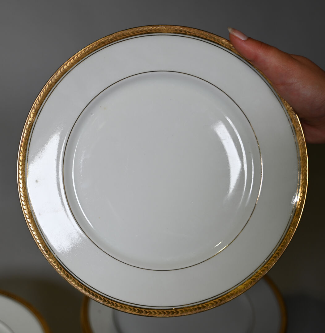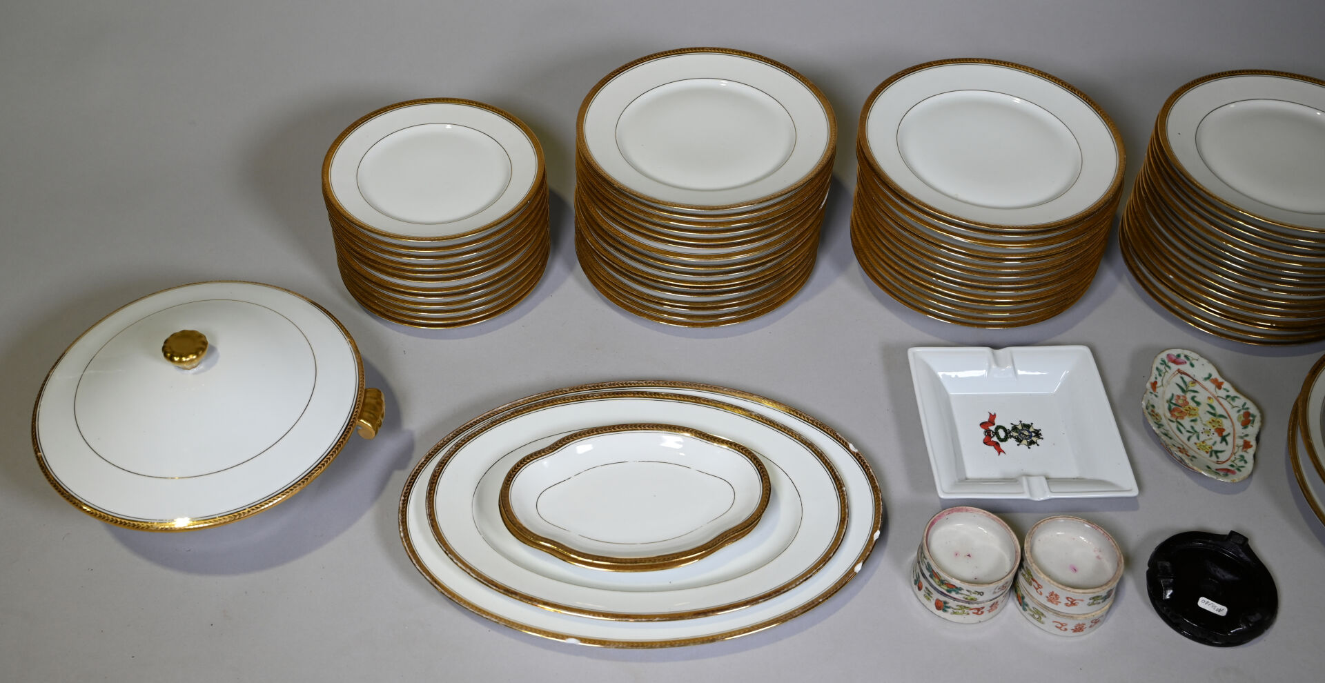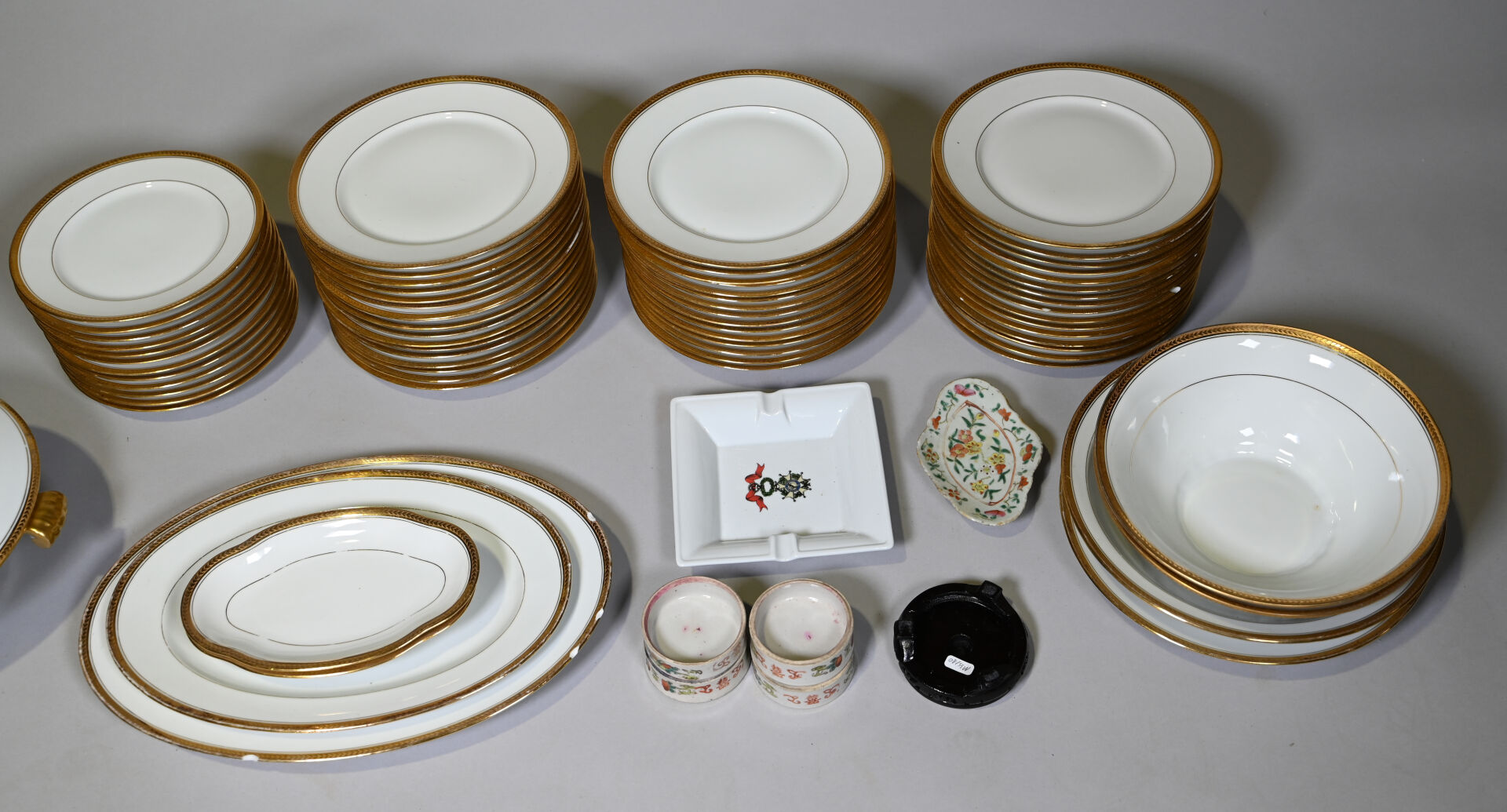 LIMOGES ULIM. Partie de service de table en porcelaine blanche à liseré or comprenant, 35 assiettes plates (éclats) 12 assiettes à entremets (une avec un éclat), 12 assiettes creuses, 2 saladiers, 2 plats de service circulaires (un avec éclat), 2 raviers, 2 plats de service ovale (un avec des éclats), 1 soupière (accident, éclat au couvercle), usures générales. On joint un ravier et trois coupelles en porcelaine de la chine et un cendrier en porcelaine à décor de la légion d’honneur.