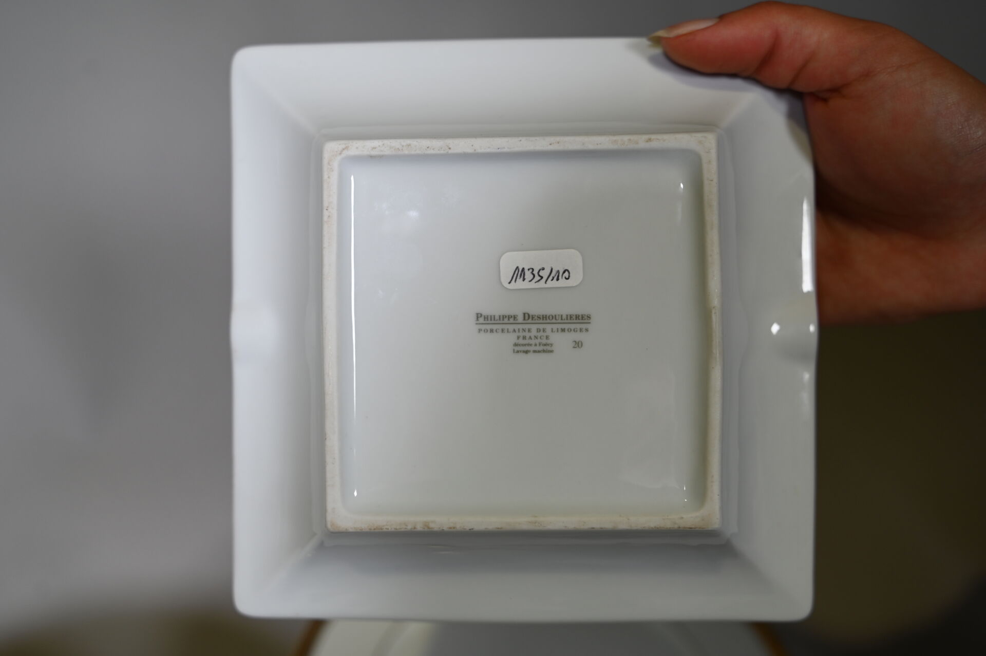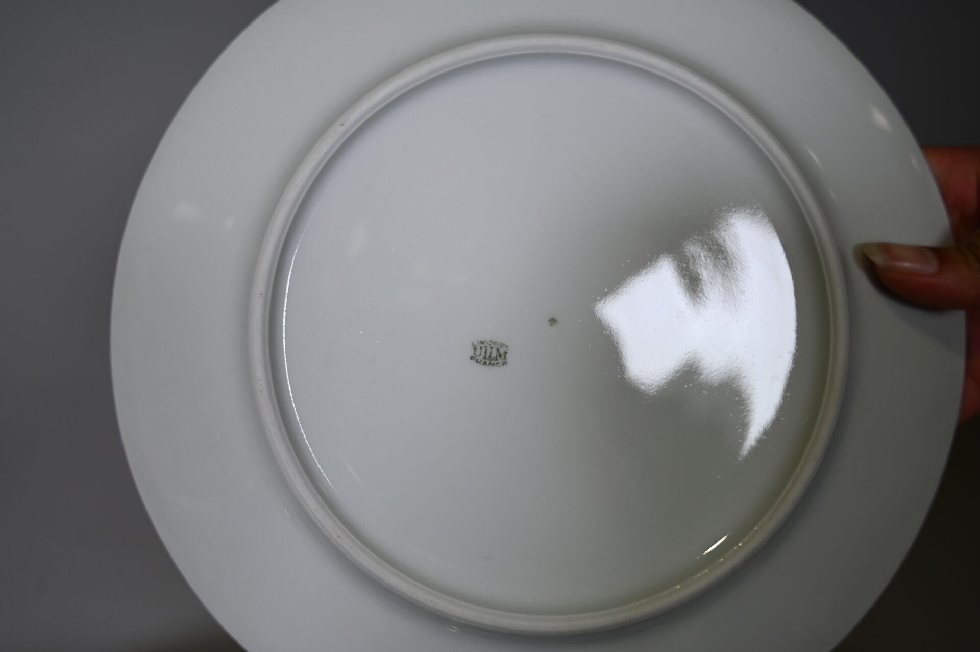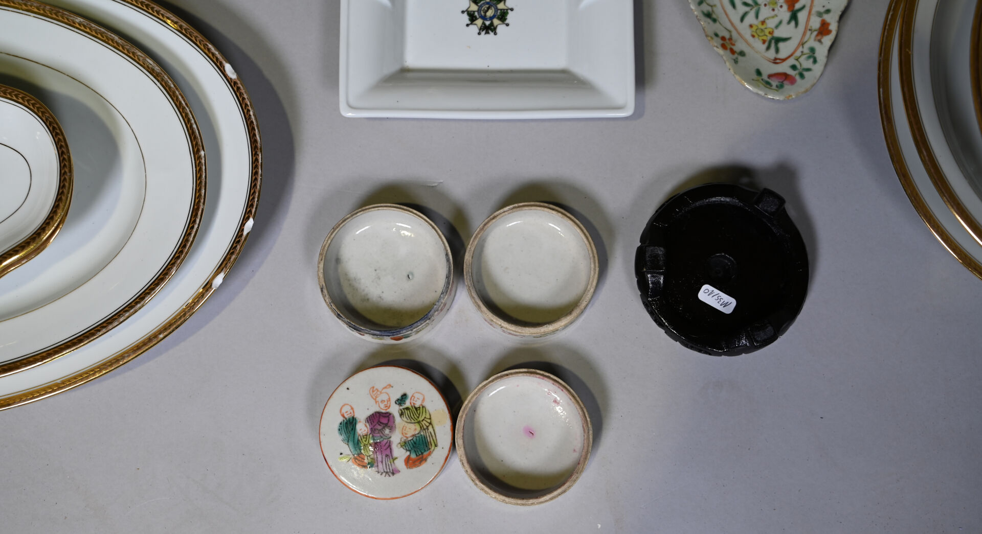 LIMOGES ULIM. Partie de service de table en porcelaine blanche à liseré or comprenant, 35 assiettes plates (éclats) 12 assiettes à entremets (une avec un éclat), 12 assiettes creuses, 2 saladiers, 2 plats de service circulaires (un avec éclat), 2 raviers, 2 plats de service ovale (un avec des éclats), 1 soupière (accident, éclat au couvercle), usures générales. On joint un ravier et trois coupelles en porcelaine de la chine et un cendrier en porcelaine à décor de la légion d’honneur.
