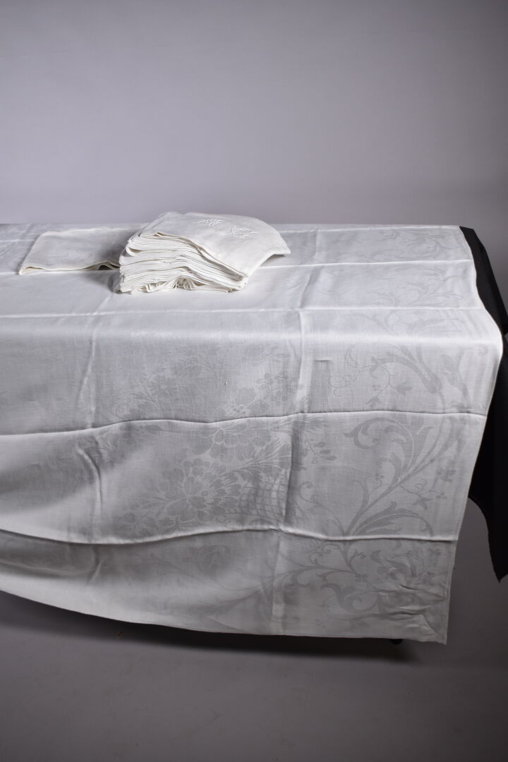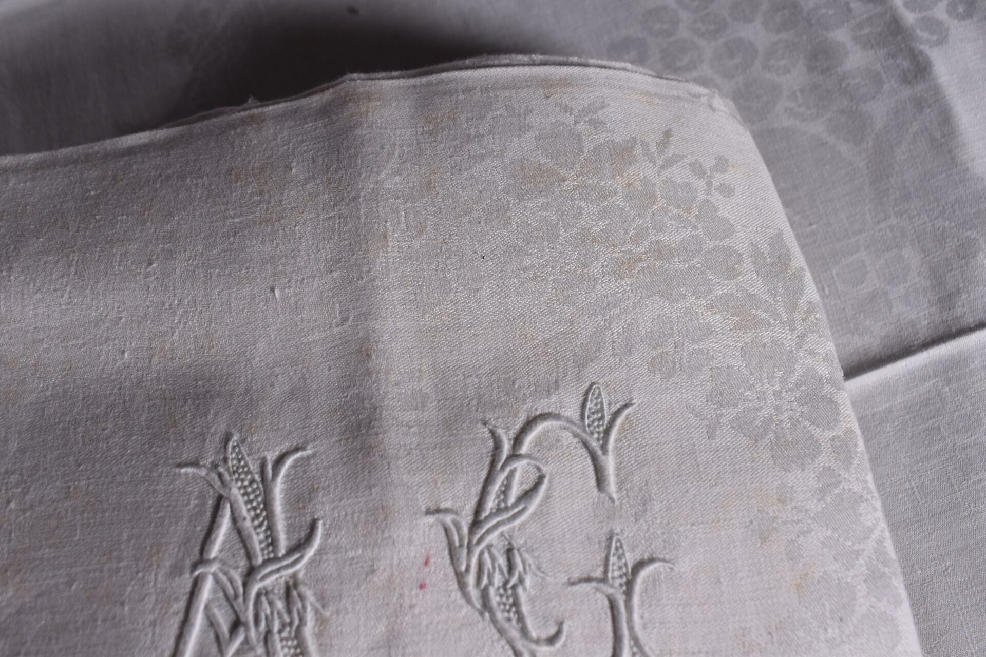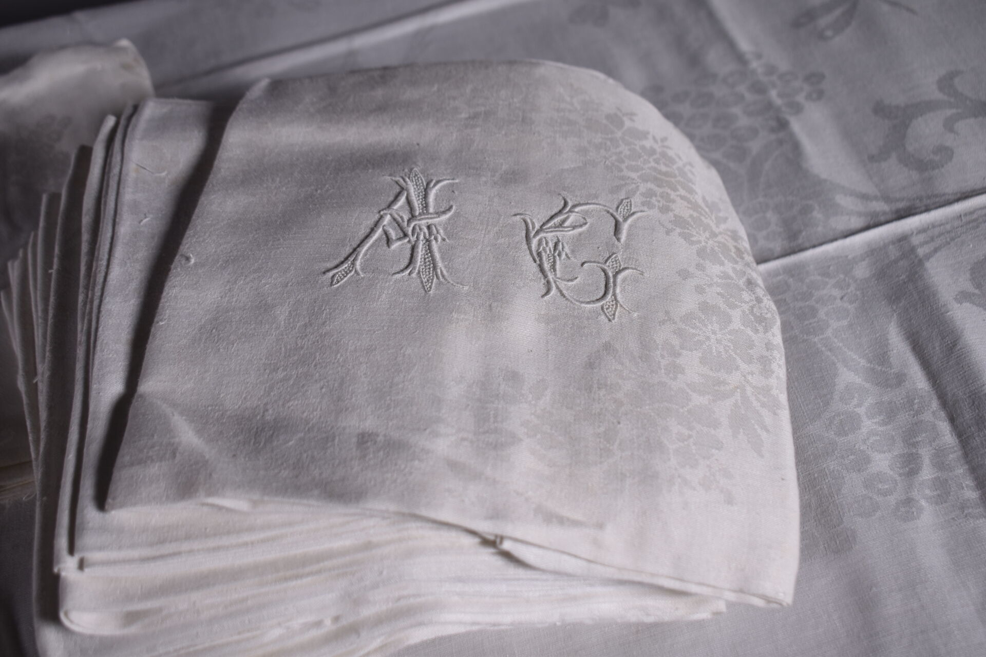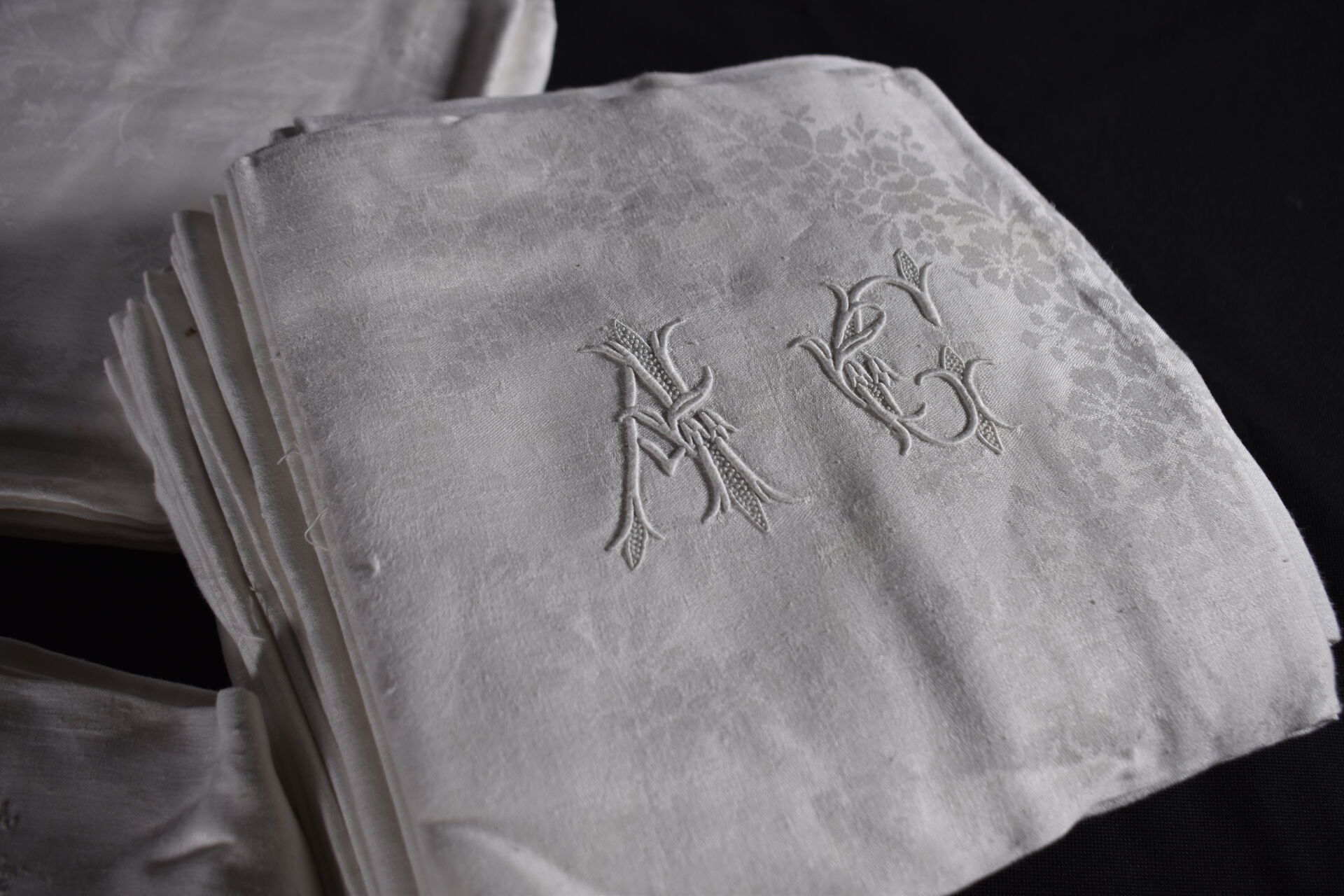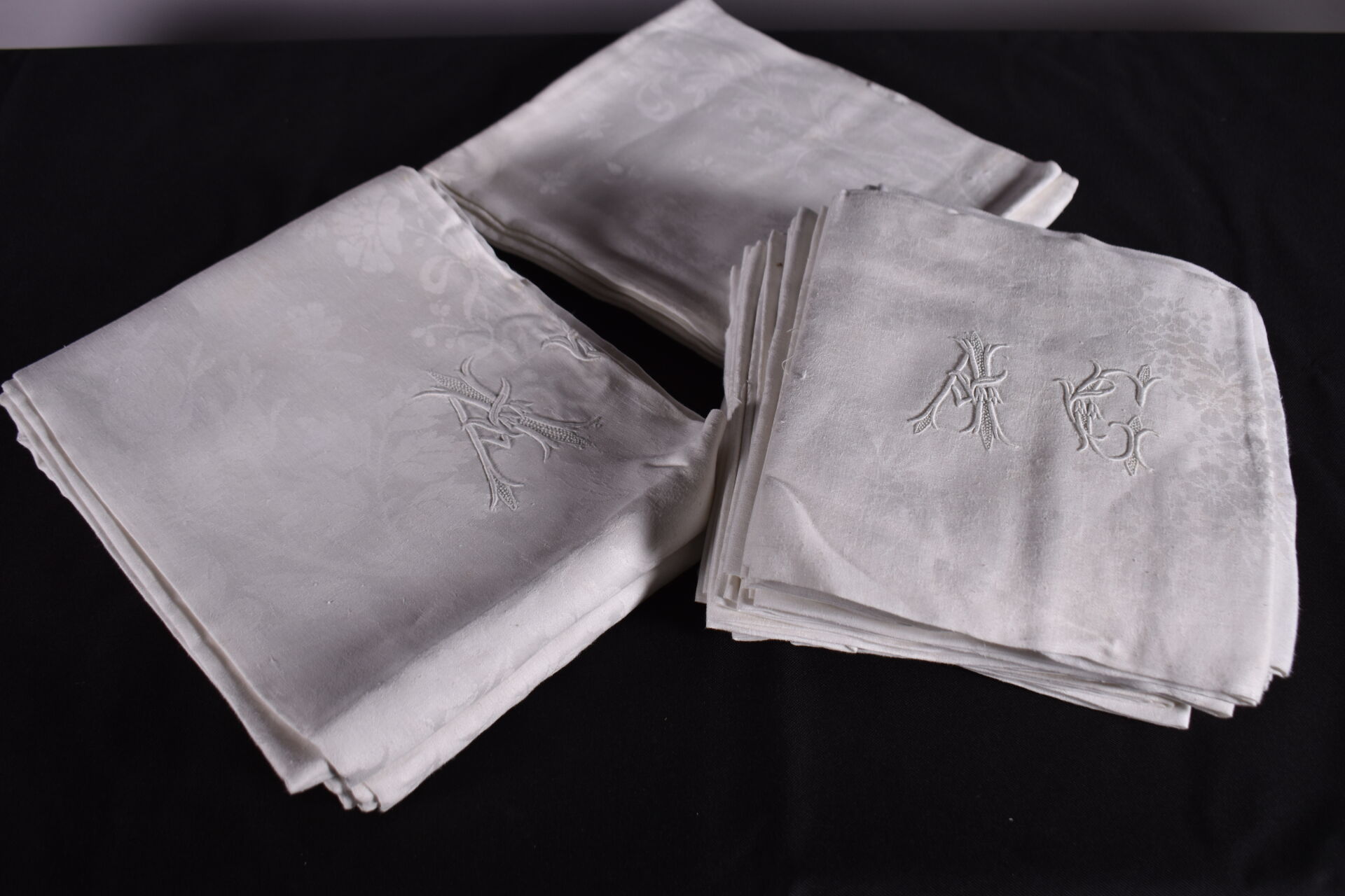 Linge de table en coton brodé chiffré A.G comprenant 18 serviettes, 1 nappe et 1 lingère. Dim. de la nappe : 210 x 200 cm.