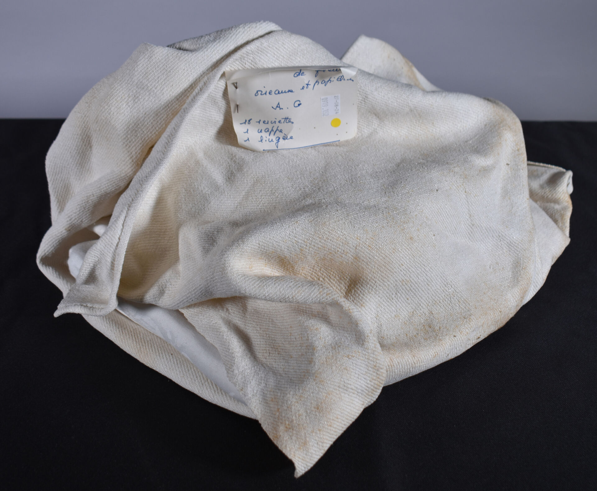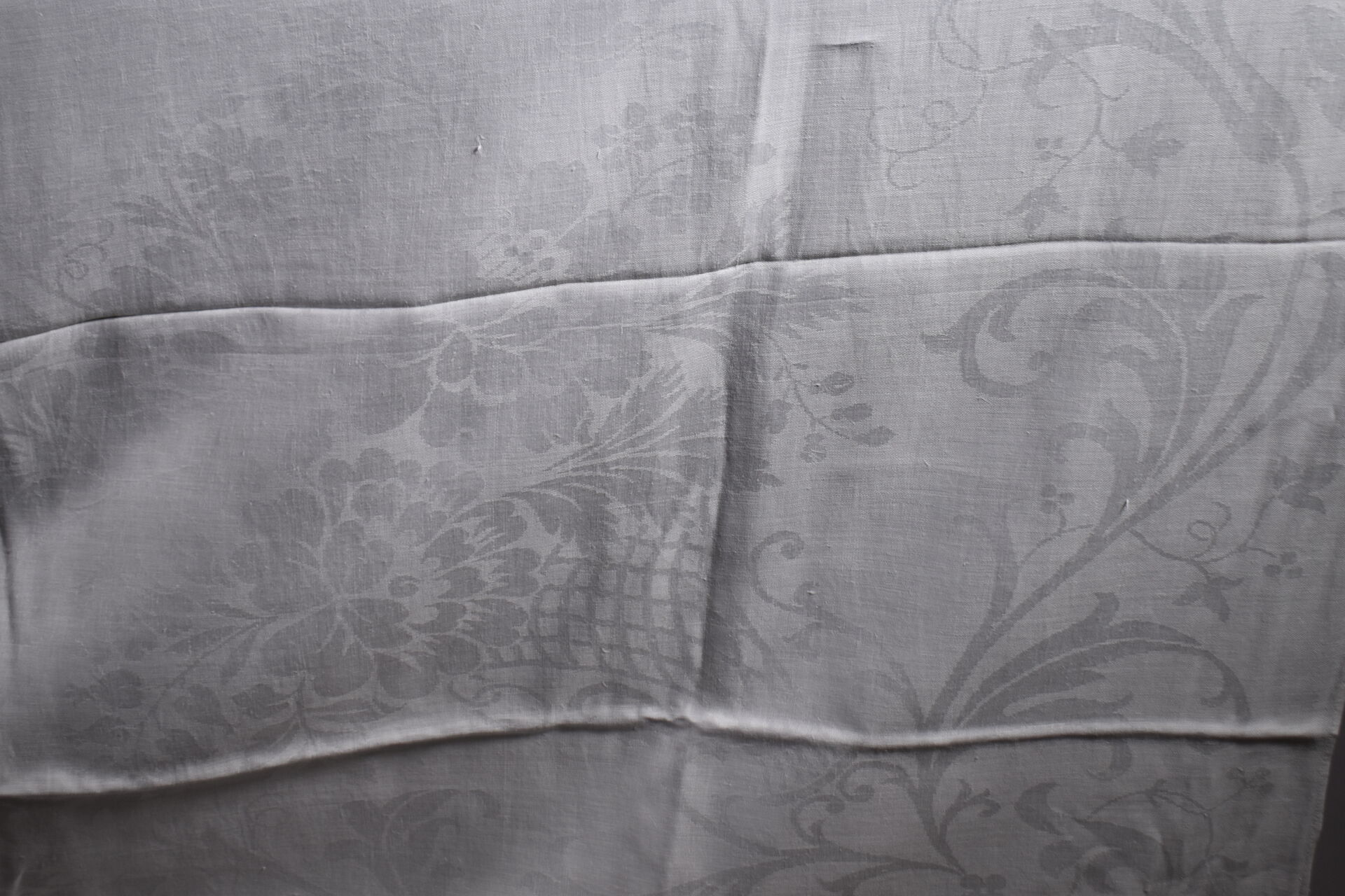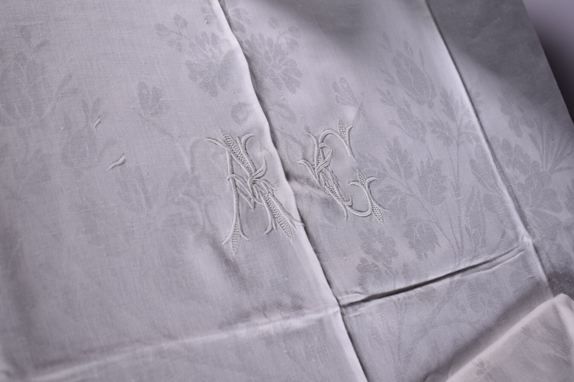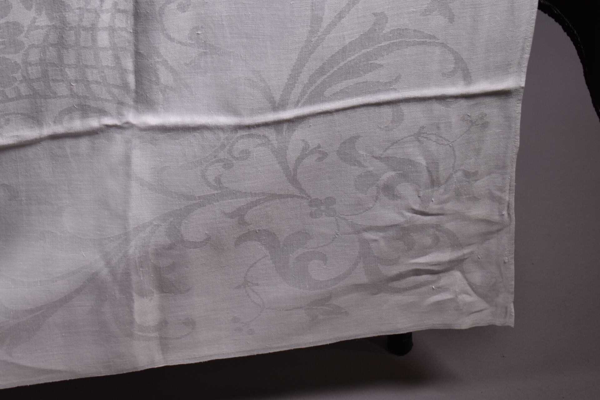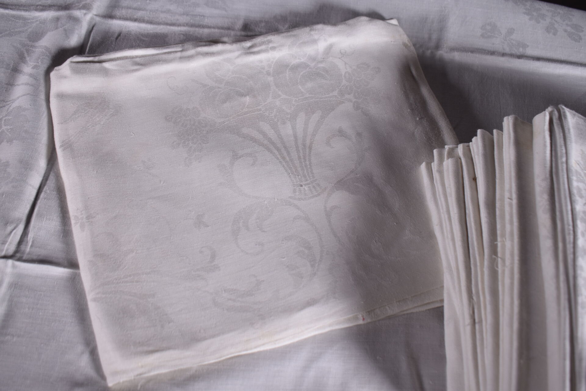 Linge de table en coton brodé chiffré A.G comprenant 18 serviettes, 1 nappe et 1 lingère. Dim. de la nappe : 210 x 200 cm.