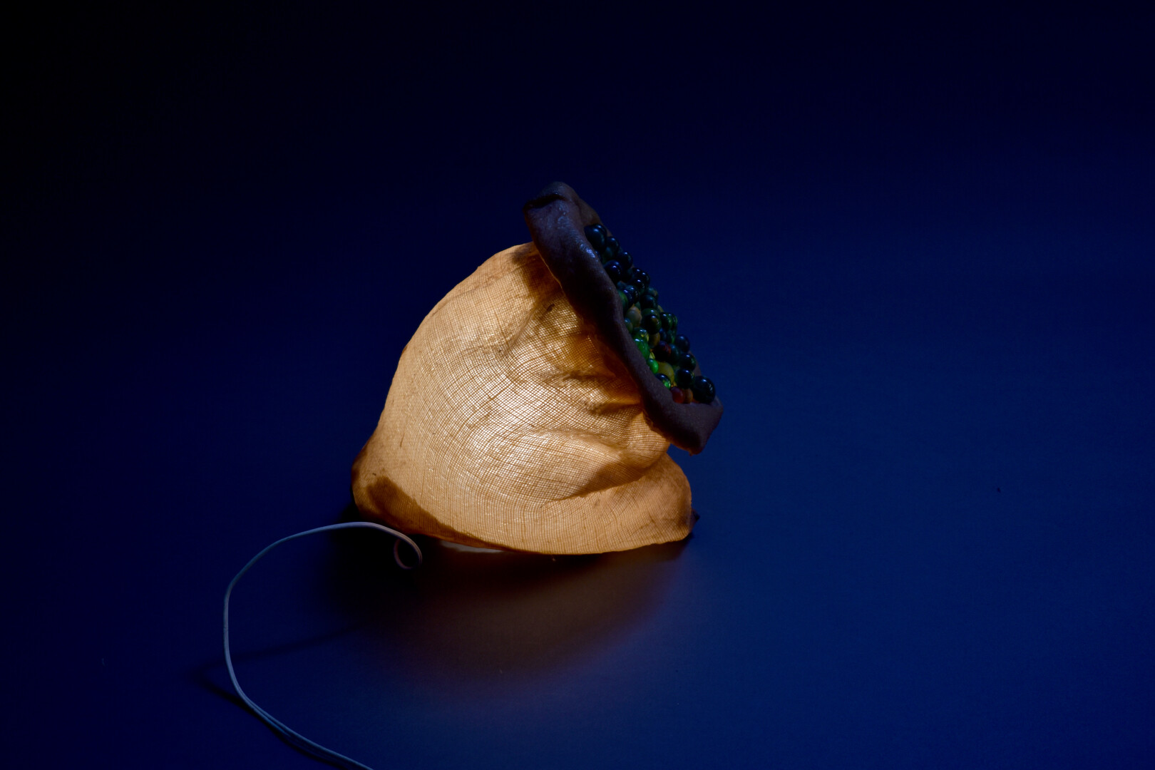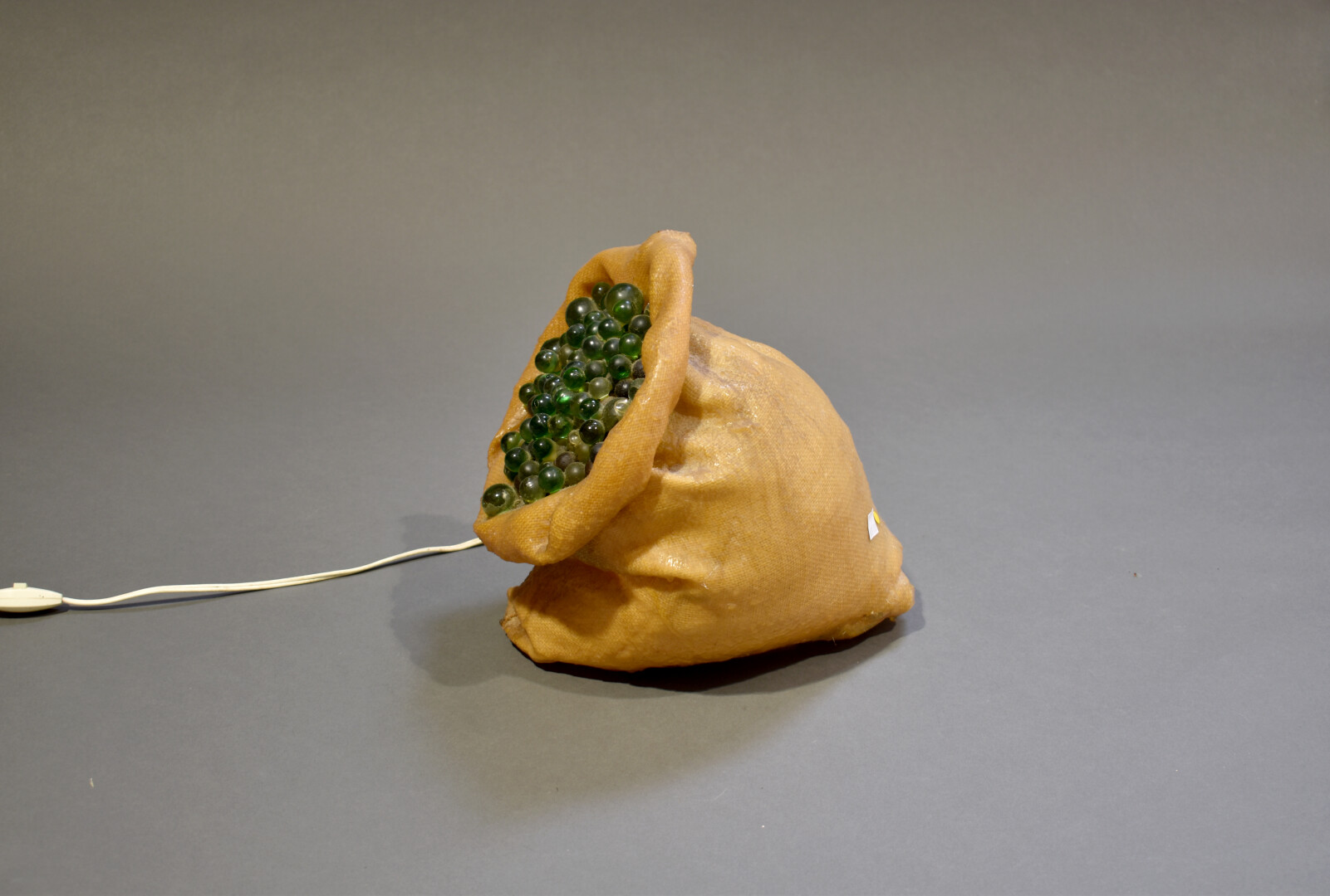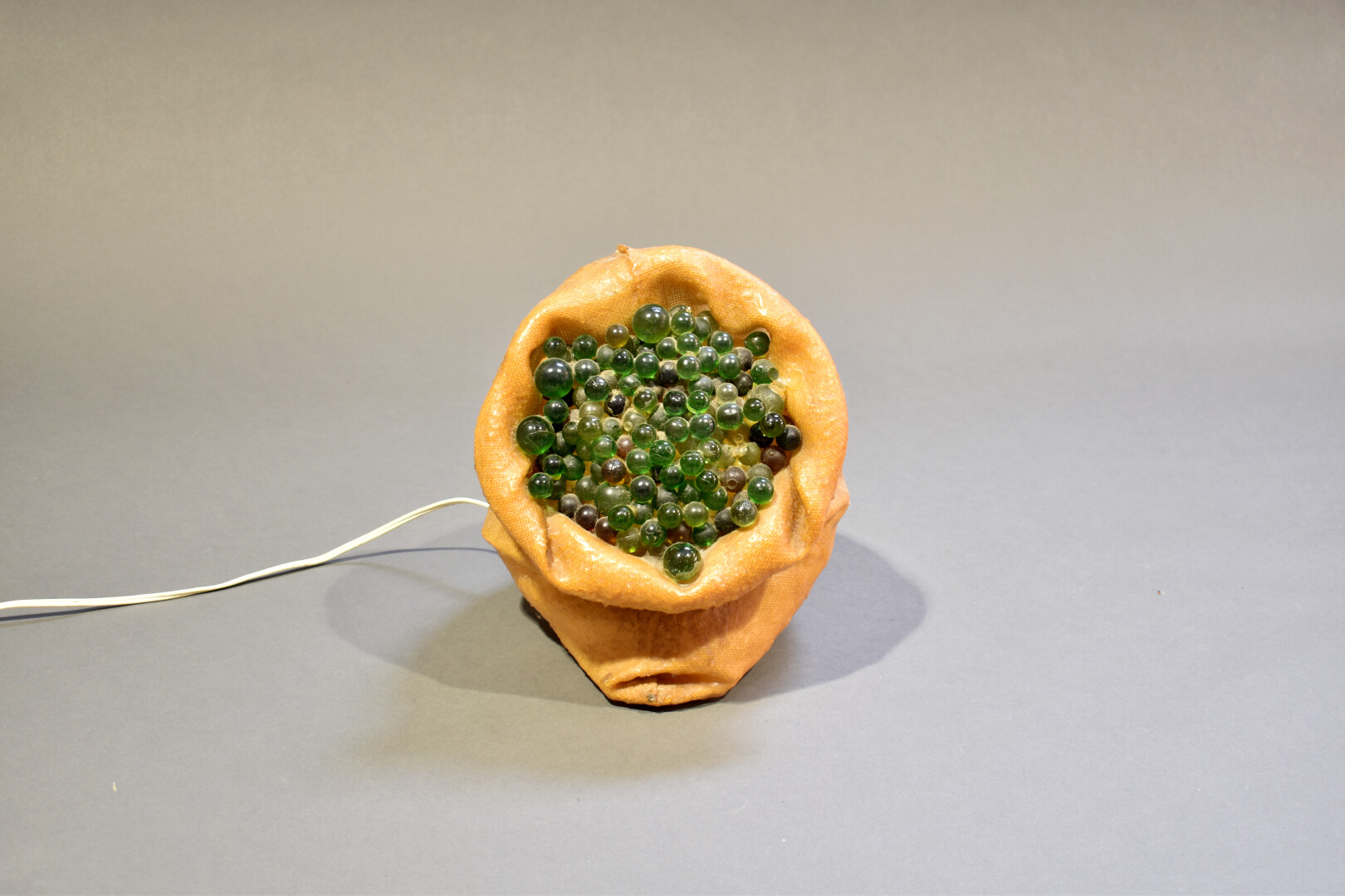 Lionel LESCORNEC (XXe siècle). Lampe à poser « sac de billes » en résine et billes de verre. Haut. : 27,5 cm.