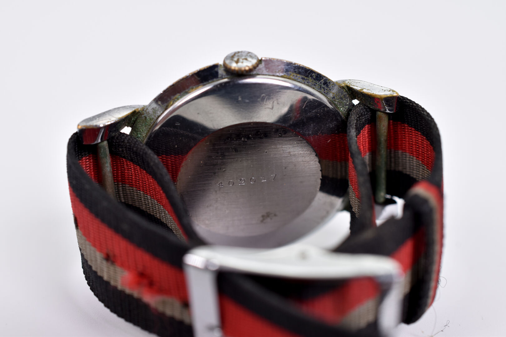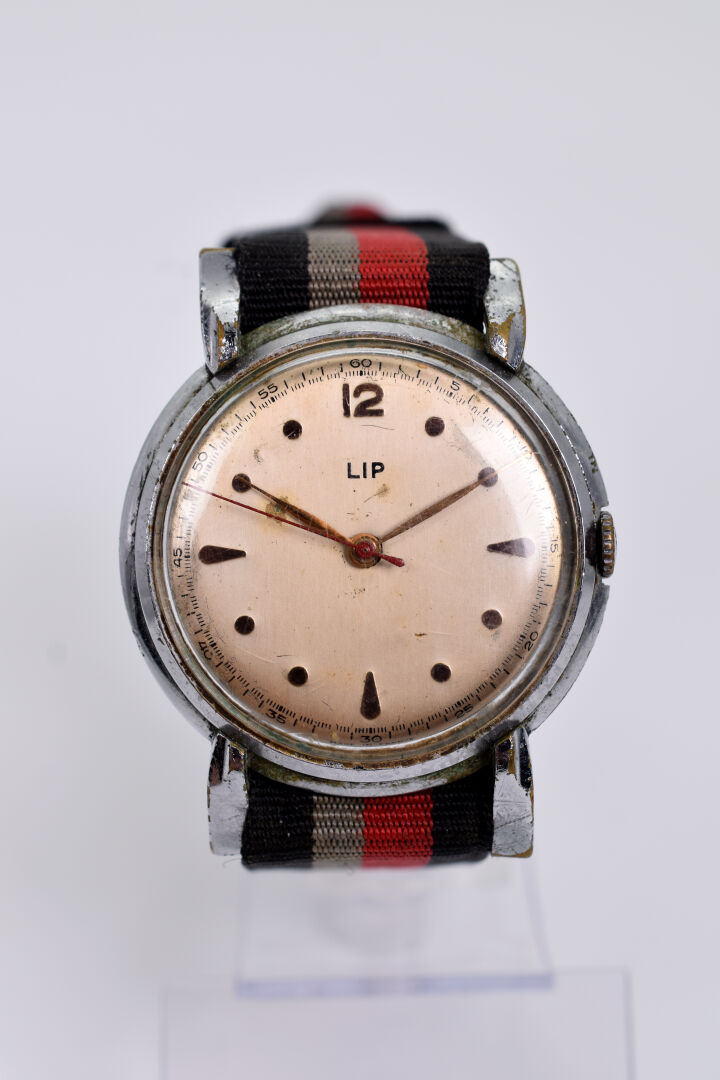 LIP. Montre bracelet à boitier rond en métal (rayé, usé, oxydé). Le cadran nacré doré usé. Aiguilles des secondes en rouge. Ne fonctionne pas. Bracelet en tissu trois couleurs. Dim. du boitier : 35 mm.