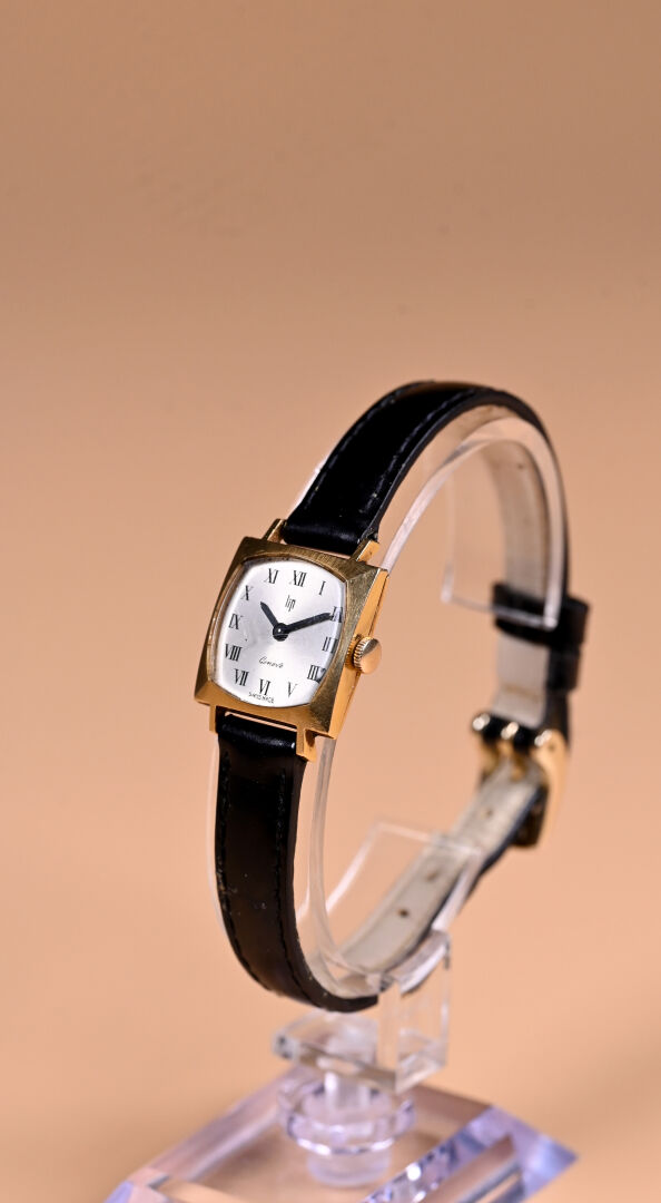 LIP. Montre bracelet de dame à boitier carré en or jaune 18K 750/1000e, mouvement mécanique à remontage manuel. Bracelet rapporté en simili-cuir. Fonctionne. Verre rayé. Poids brut; : 10,2 g.