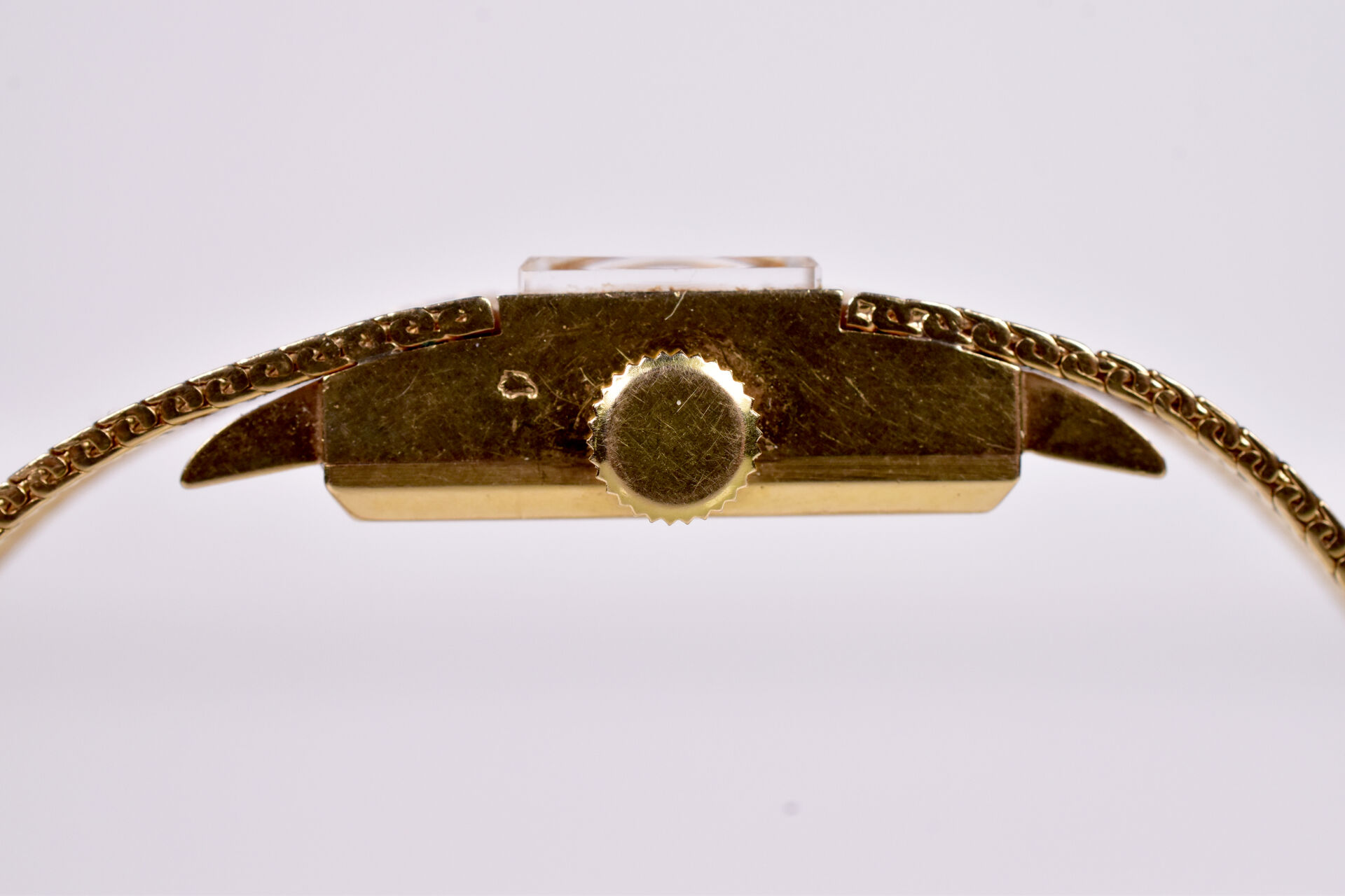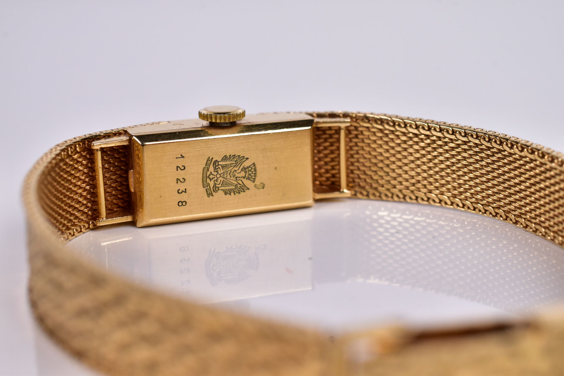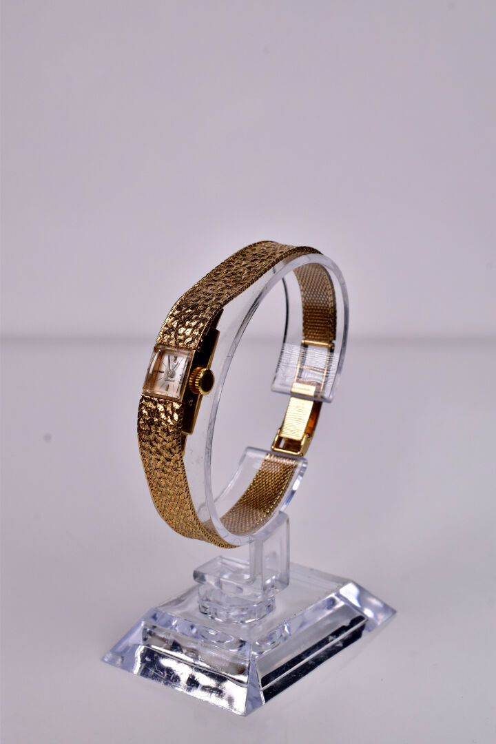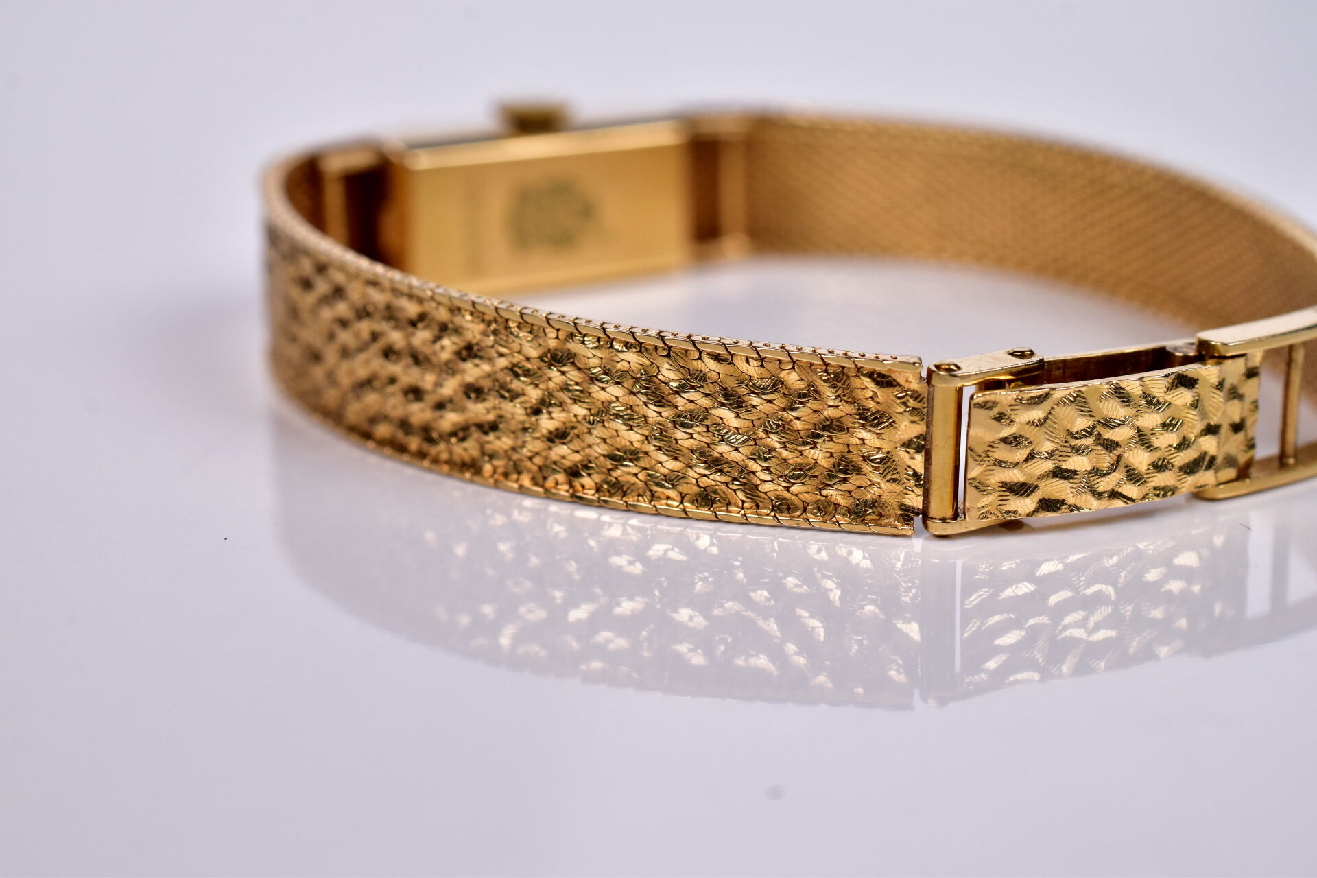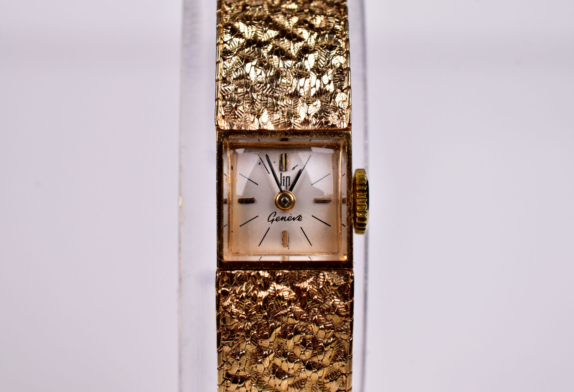 LIP. Montre bracelet de dame en or 18K 750/1000e texturé, petit boitier carré (10mm). Mouvement mécanique à remontage manuel (fonctionne). Poids brut. : 26,4 g.