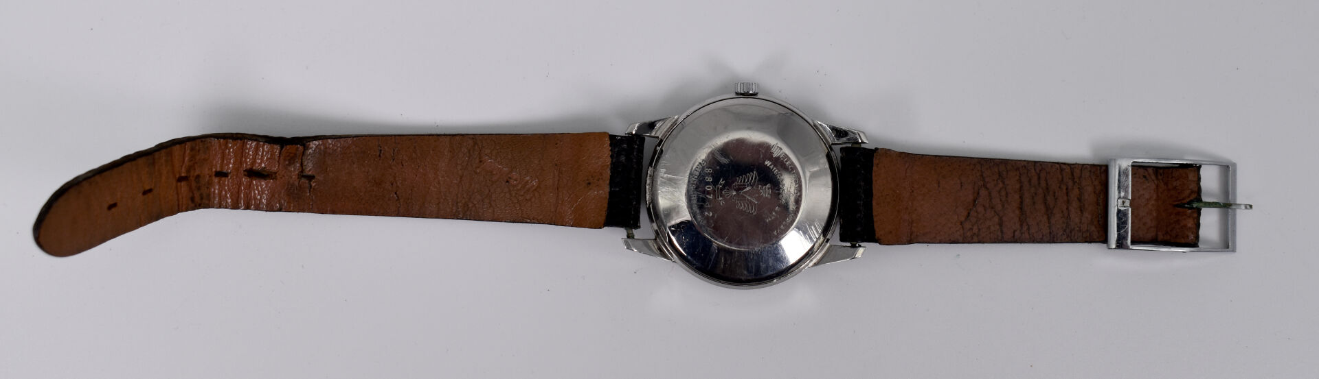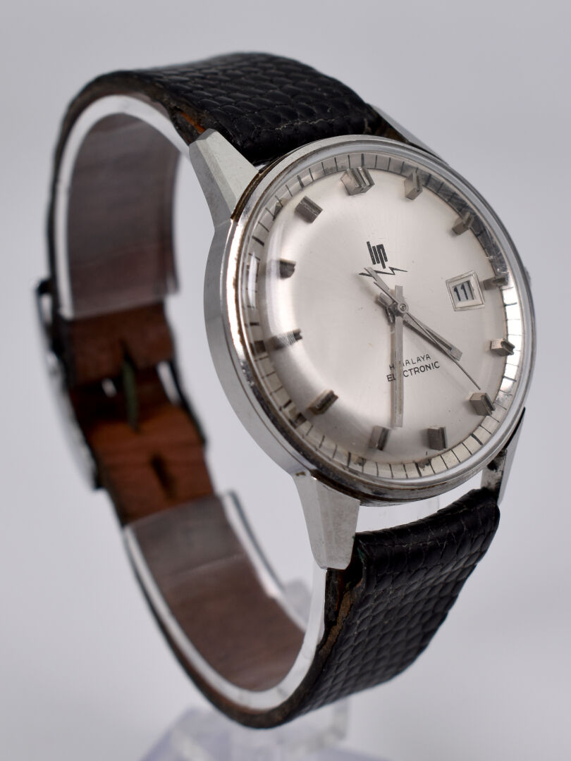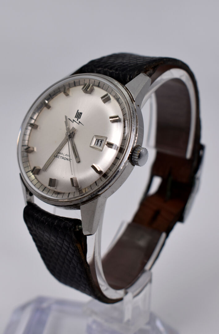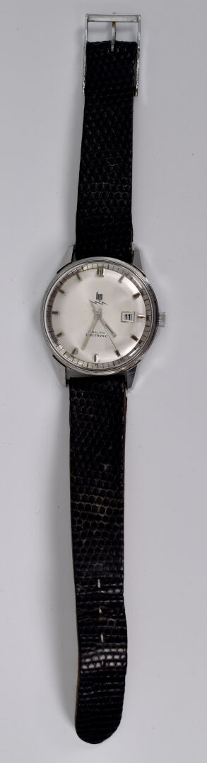 LIP. Montre bracelet d’homme à boitier en métal gris modèle « Himalaya électric ». Cadran circulaire signé sur fond argenté, guichet date à 3 heures. Numérotée 880782. Bracelet en skaï noir.