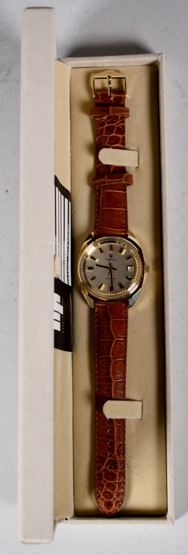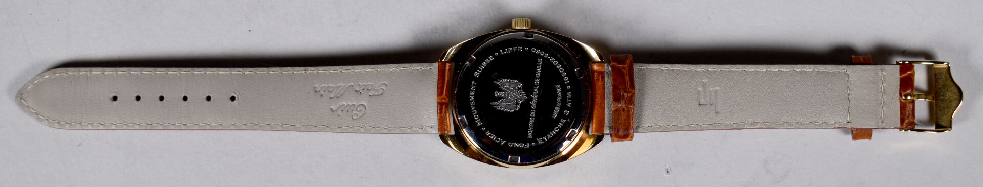 LIP. Montre bracelet réédition de la montre du Général de Gaulle. Série Electronic. Boitier de forme tonneau en métal doré, guichet date à 3h. Numérotée 1880602-6060. Bracelet en cuir d’origine. Fonctionne. Avec boîte d’origine.