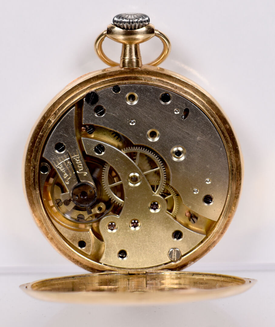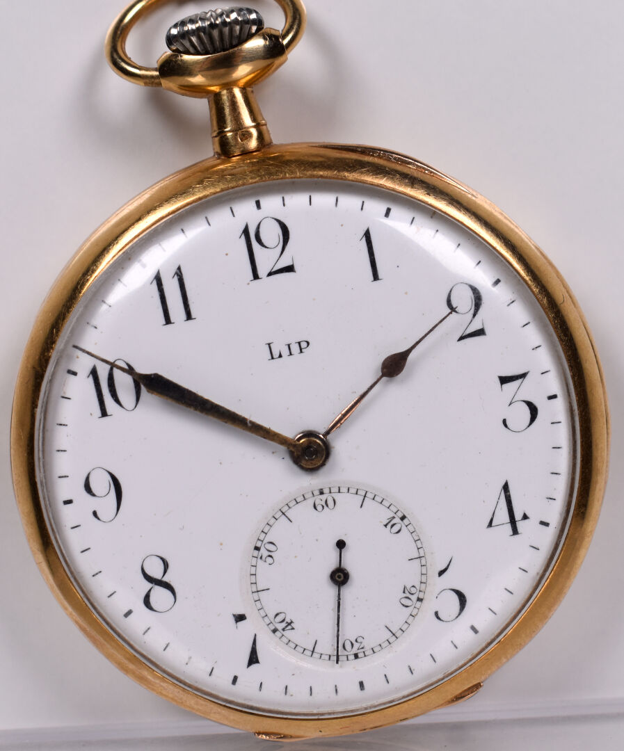 LIP. Montre de gousset en or jaune 18K 750/1000e. Cache-poussière en or jaune. Bouton remontoir en métal. Fonctionne. Poids brut. : 67 g.
