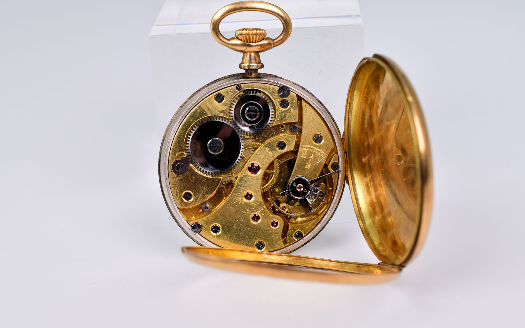 LIP. Montre de gousset en or jaune 18K 750/1000e (poinçon tête de cheval). Le cache-poussière en or. Cadran signé à chiffres arabes pour les heures. Le verre à refixer. Poids brut (sans le verre). : 50 g.