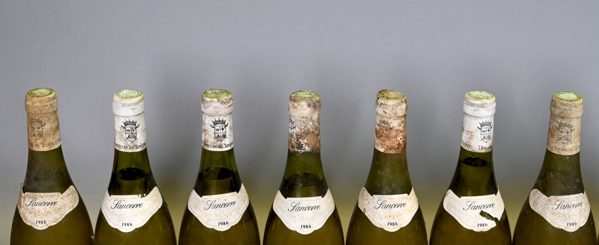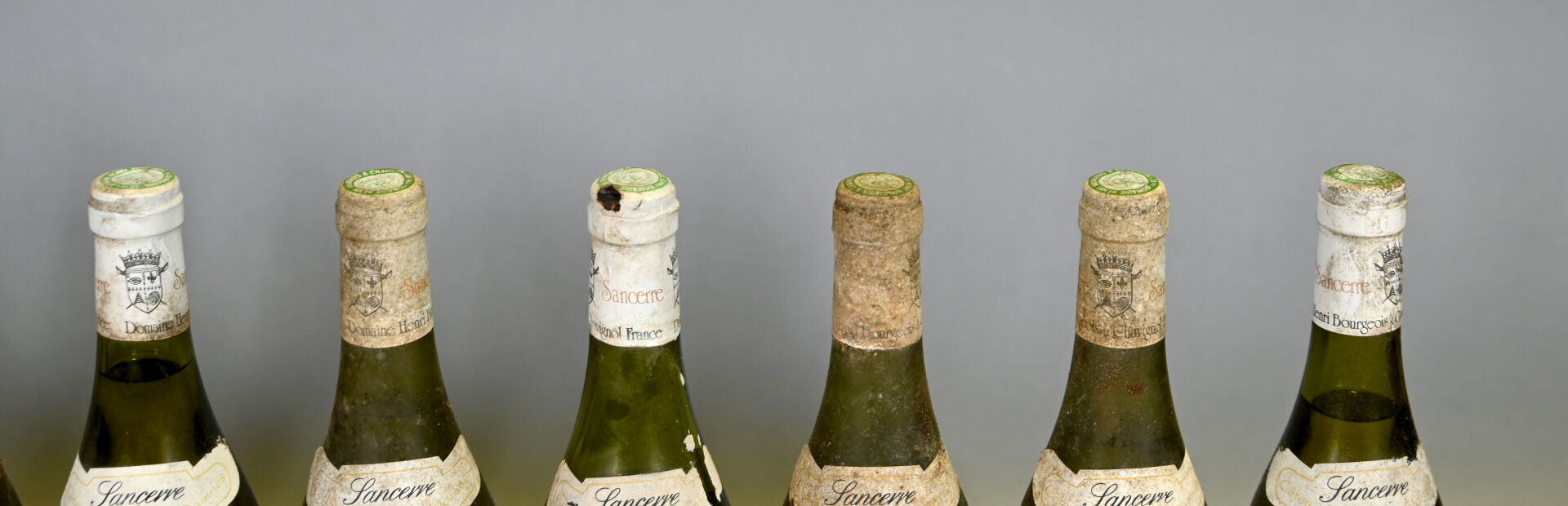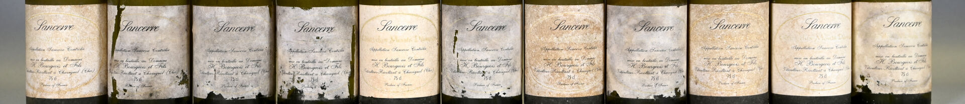 LOIRE – 11 bouteilles, Sancerre, Henri Bourgeois et fils, 1986. Niveaux à 4,7 cm ou mieux. Capsules sales à très sales dont deux sont abimées. Collerettes sales, abimées avec des points de décollement. Etiquettes sales à très sales dont sept sont légèrement abimées à abimées.
