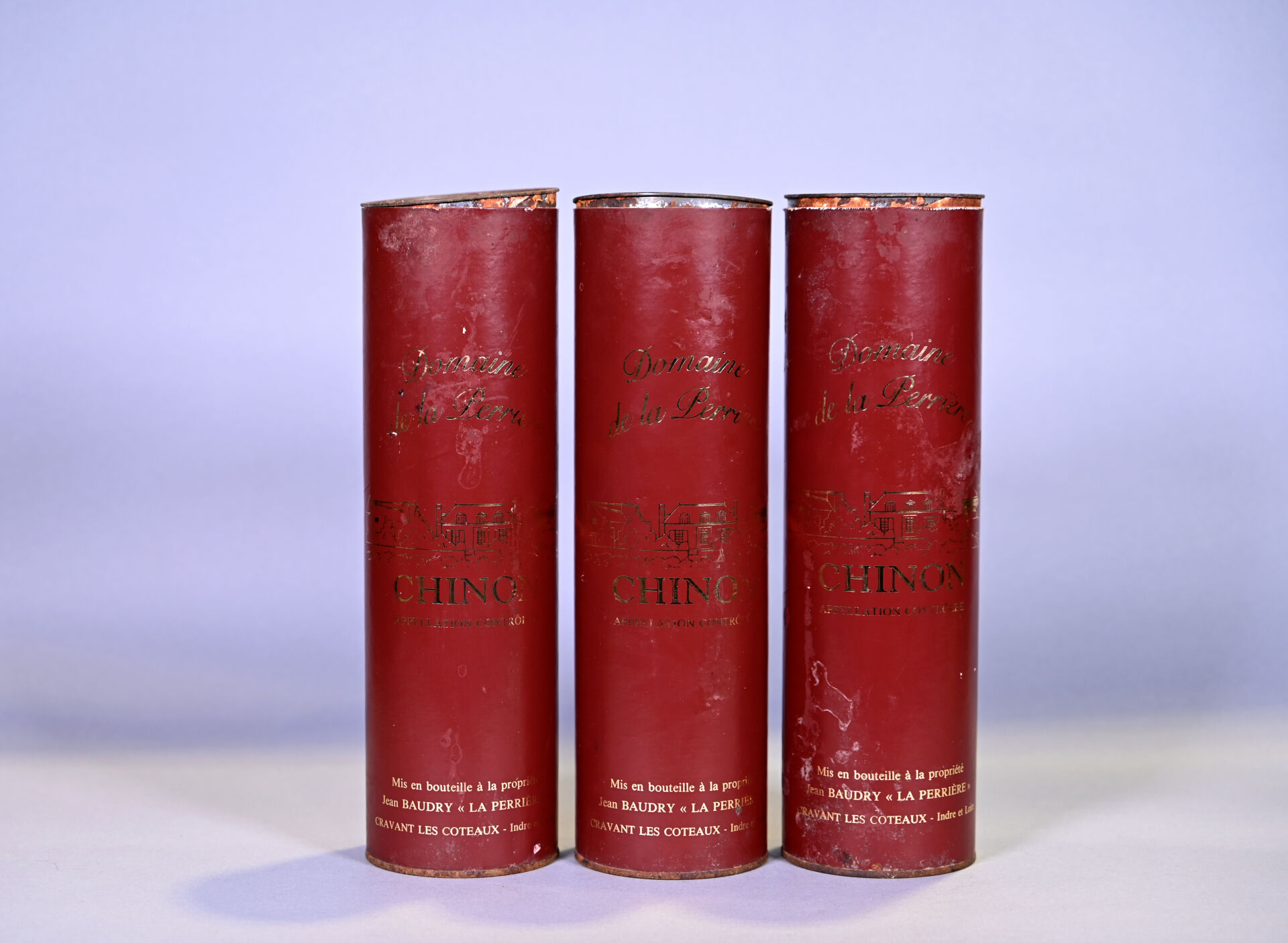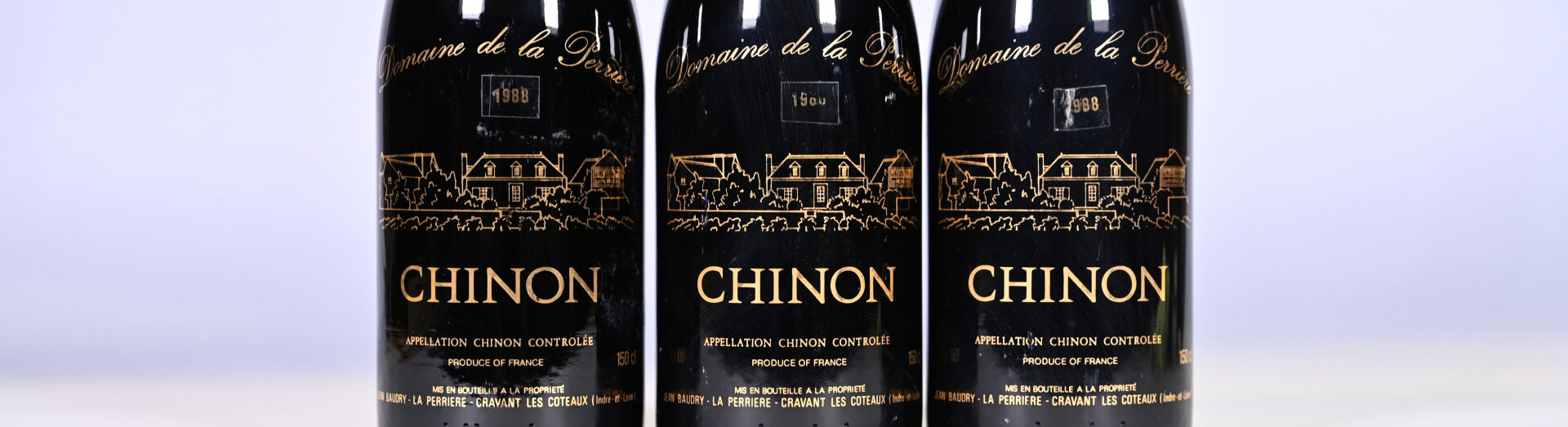 LOIRE – 3 magnums, Chinon, Domaine de La Perrière, 1988 (dont un magnum présumé de ce millésime). En étuis individuels d’origine. Capsules en cire légèrement sales à sales, craquelées et avec des éclats. Un niveau légèrement bas et un niveau bas.