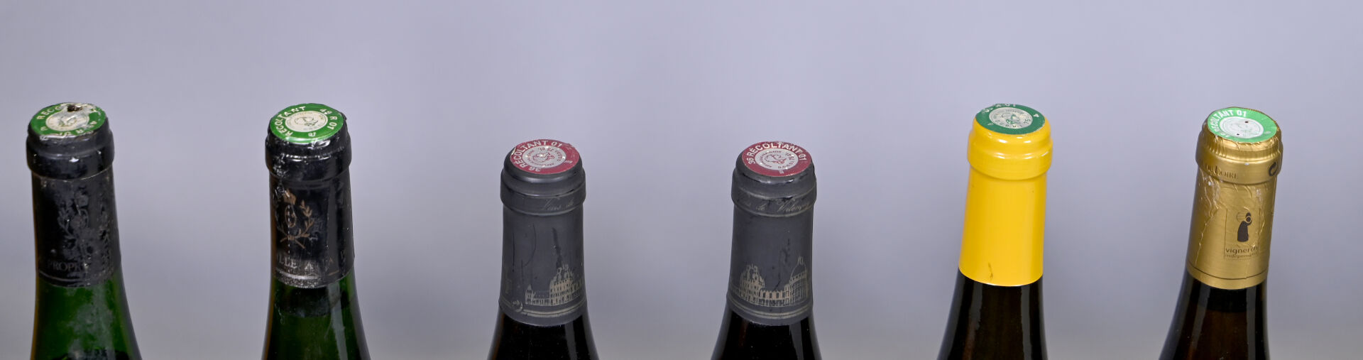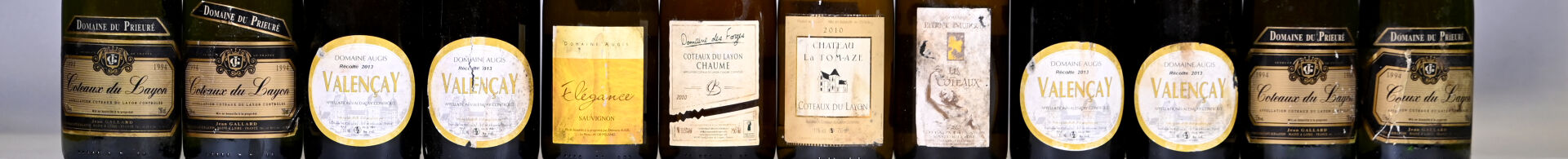 LOIRE – Ensemble de 12 bouteilles composé de : 4 bouteilles, Coteaux du Layon, Domaine du Prieuré, 1994. Un niveau à 4,3 cm. Capsules légèrement sales à sales dont une est abimée et une autre très abimée. Etiquettes légèrement sales à sales et légèrement abimées à abimées. 1 bouteille, Coteaux du Layon ‘Chaume’, Domaine des Forges, 2010. Etiquette légèrement sale. 1 bouteille, Coteaux du Layon, Domaine Patrick Baudouin, 2010. Capsule avec des traces et légèrement abimée en son sommet. Etiquette sale et abimée. 1 bouteille, Coteaux du Layon, Château La Tomaze, 2010. Etiquette légèrement sale à sale et légèrement abimée. 1 bouteille, Touraine, Domaine Augis, Elégance, Sauvignon, 2012. Etiquette légèrement sale et abimée. 4 bouteilles, Valençay, Domaine Augis, 2013. Capsules très légèrement sales. Etiquettes légèrement sales à sales et légèrement abimées à abimées.