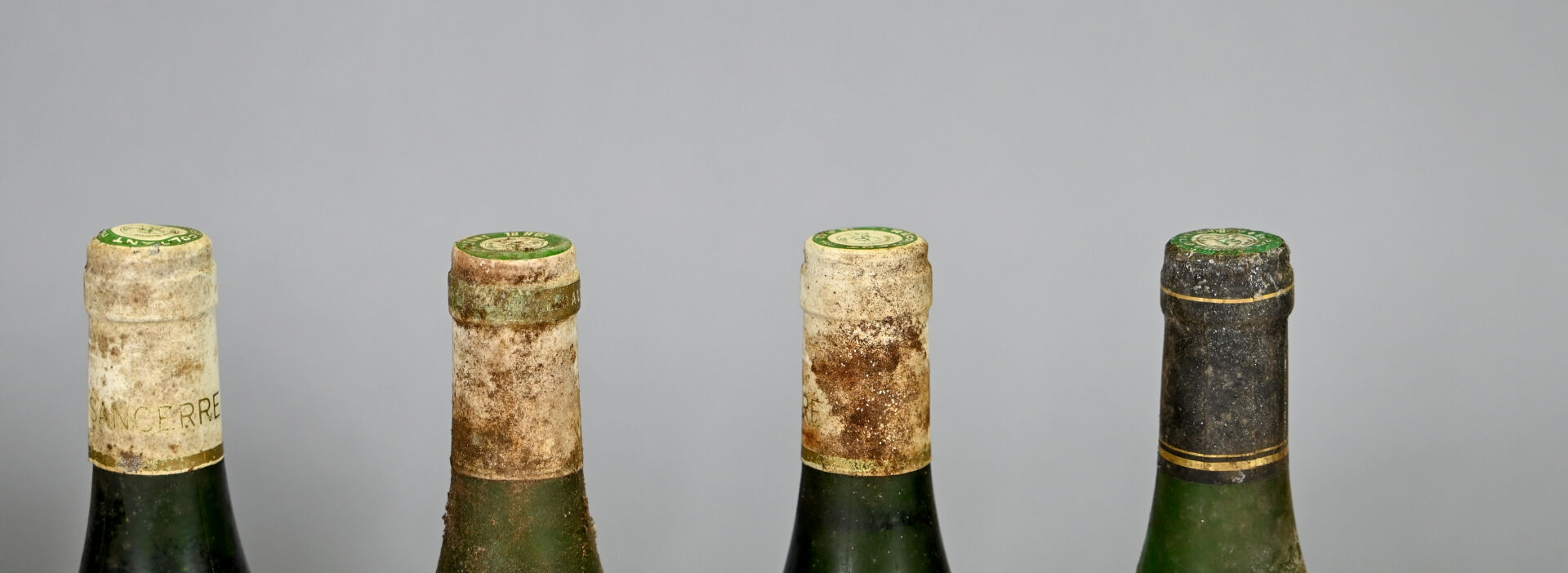 2 bouteilles, Sancerre ‘Clos du Chêne Marchand’, Jean Paul Picard, 1983 (1) et 1989 (1). 2,5 cm (2). Capsules et collerettes très sales. Etiquettes très sales dont une présente une petite déchirure au niveau de sa partie inférieure.