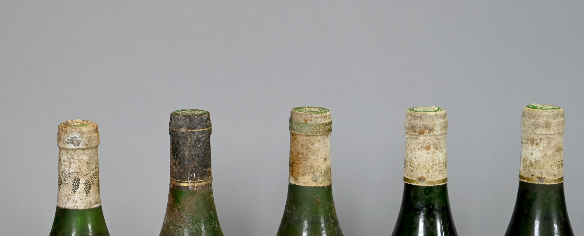 1 bouteille, Sancerre, Albert Besombes, 1977. 2 cm. Capsule et collerette très sales. Etiquette très sale, décollée dans son angle gauche inférieur avec une déchirure dans sa partie inférieure.