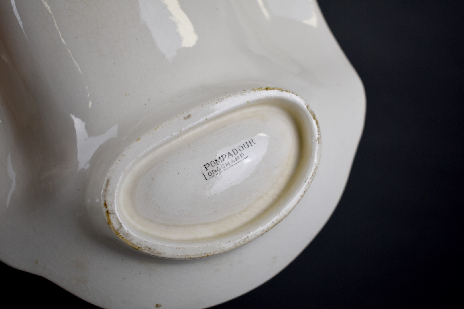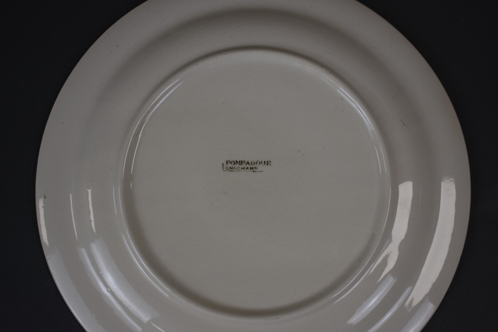 LONGCHAMP. Suite de 12 assiettes et un plat à asperges en faïence à décor de semi-de fleur modèle Pompadour (quelques petits éclats en bordure). Marquées sous la base.