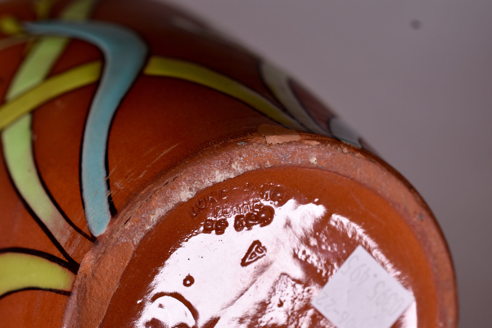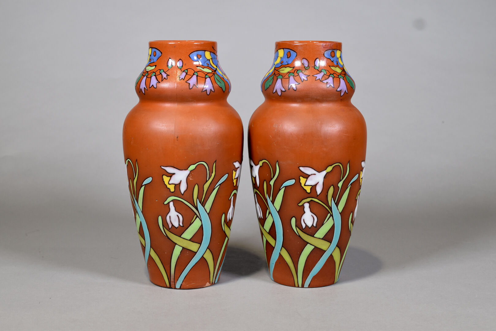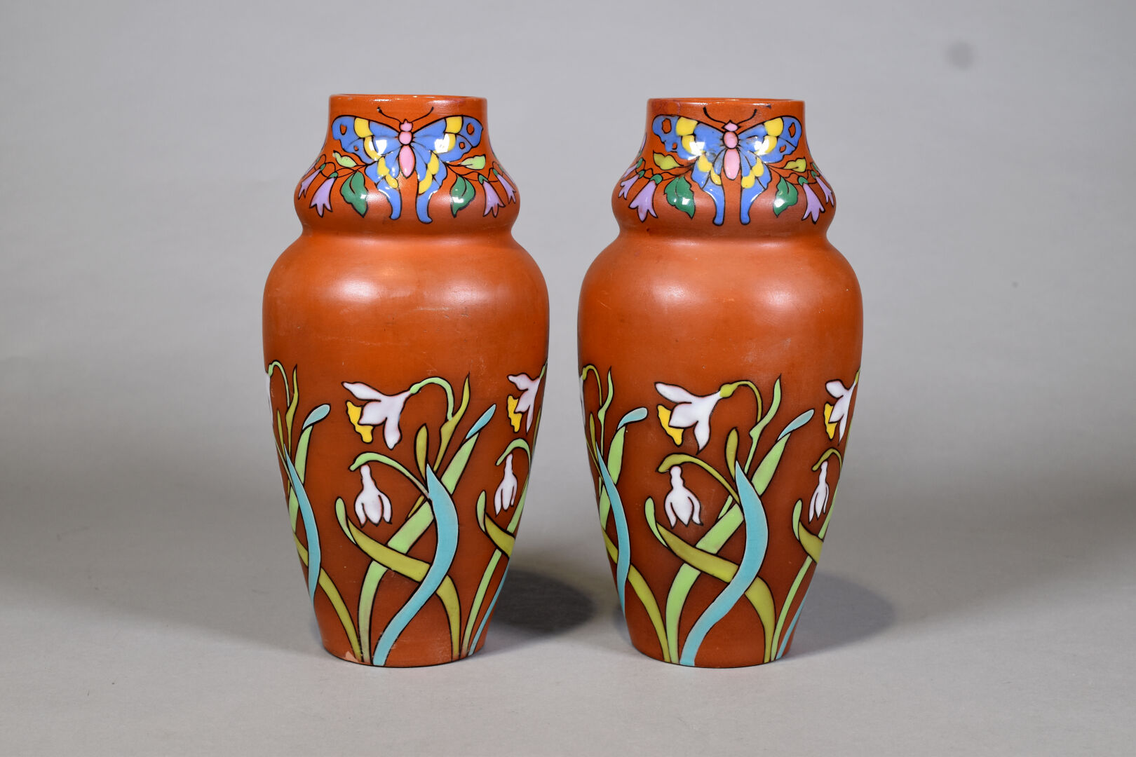 LONGCHAMPS TERRE DE FER. Paire de vases balustre en terre cuite à décor émaillé de fleurs et papillons (restauration). Marqués au dessous. Haut. : 31 cm.