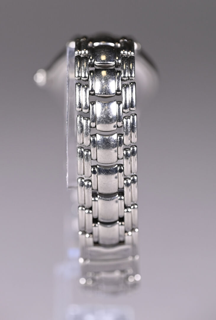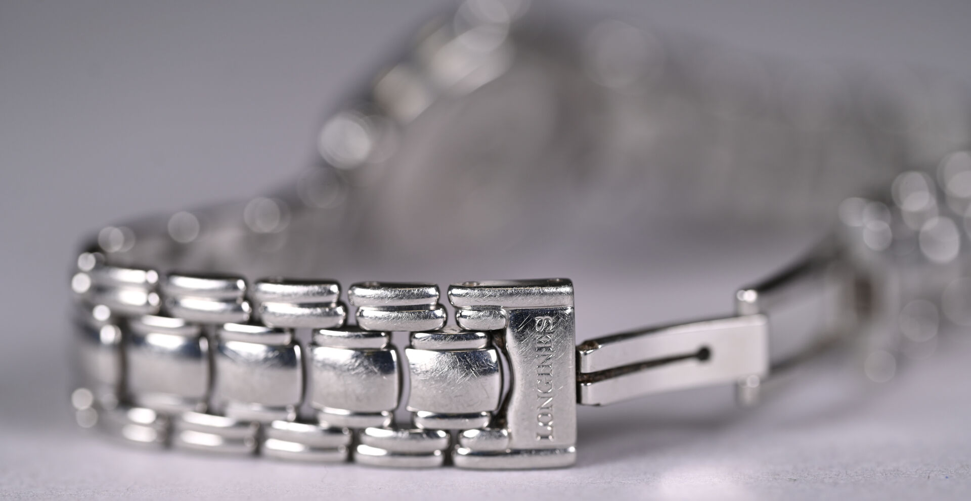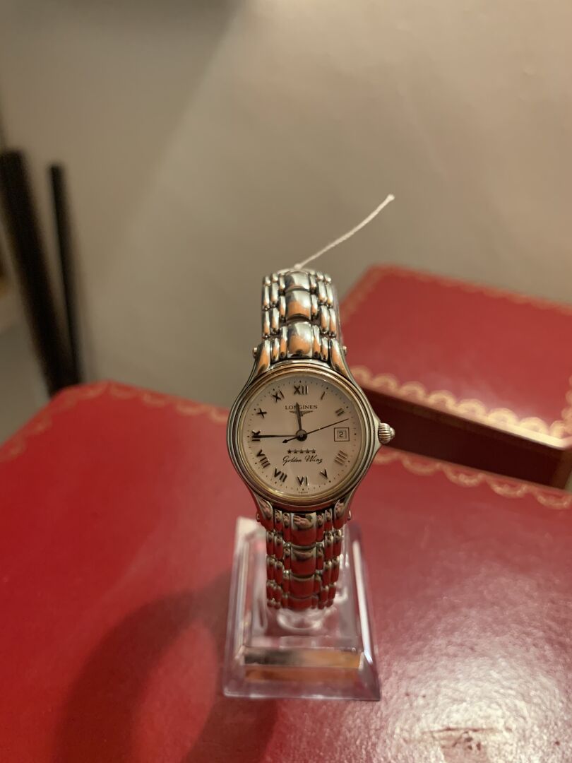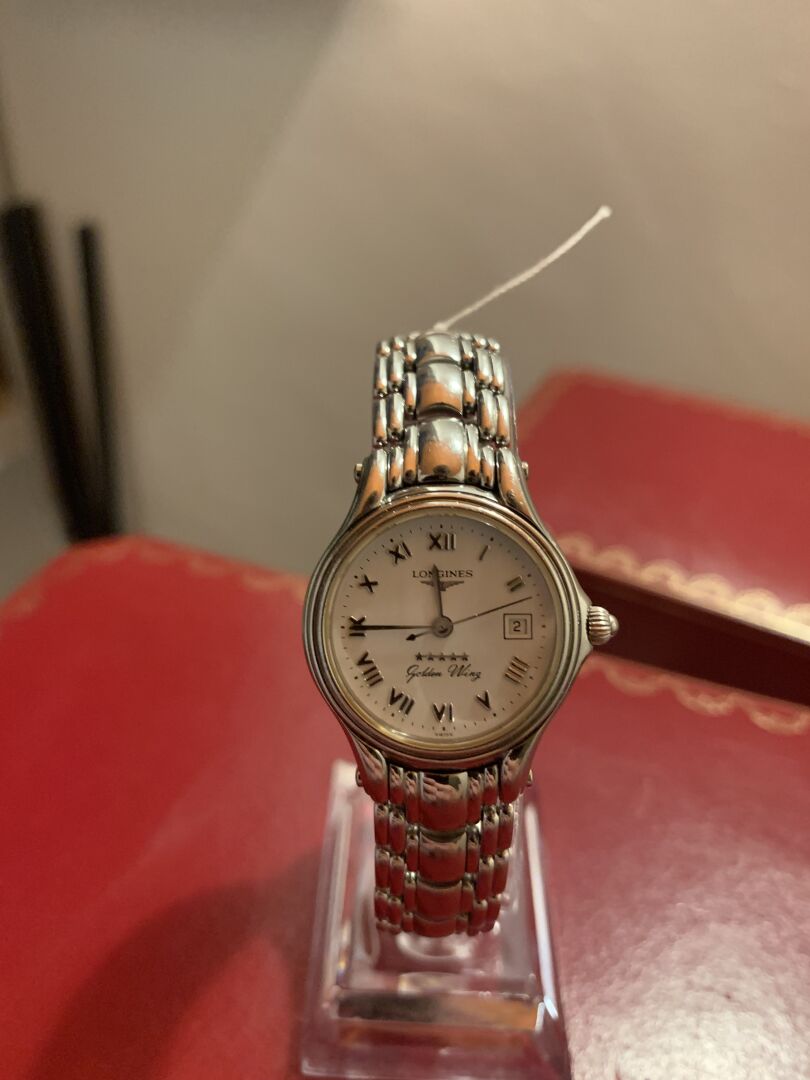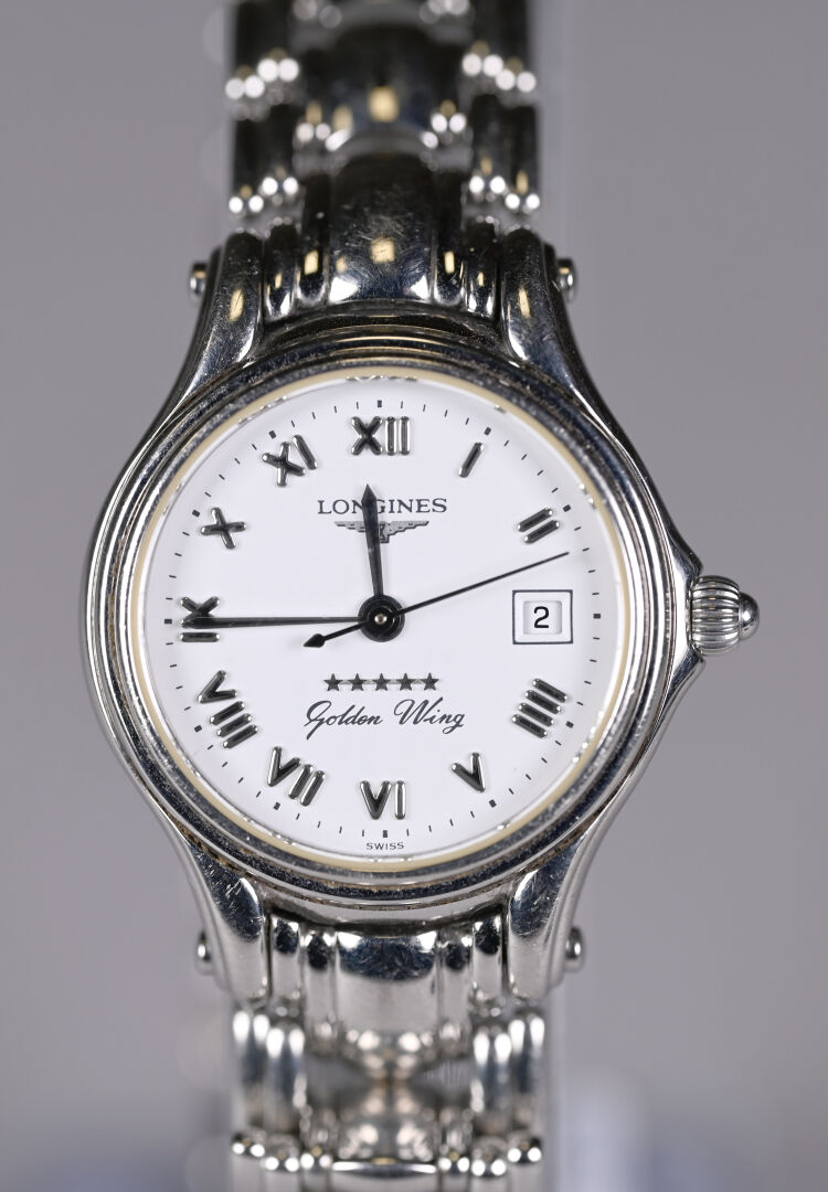 LONGINES Golden Wing, montre de dame en acier. Boîtier rond avec cadran signé à fond blanc, index des heures en chiffres romains argentés et guichet dateur à 3h. Mouvement quartz. Bracelet articulé sur boucle déployante. Boitier : 25 mm. A réviser. Long. de la montre avec boucle déployante fermée : 17 cm. Long. de la montre avec boucle déployante ouverte : 19 cm.