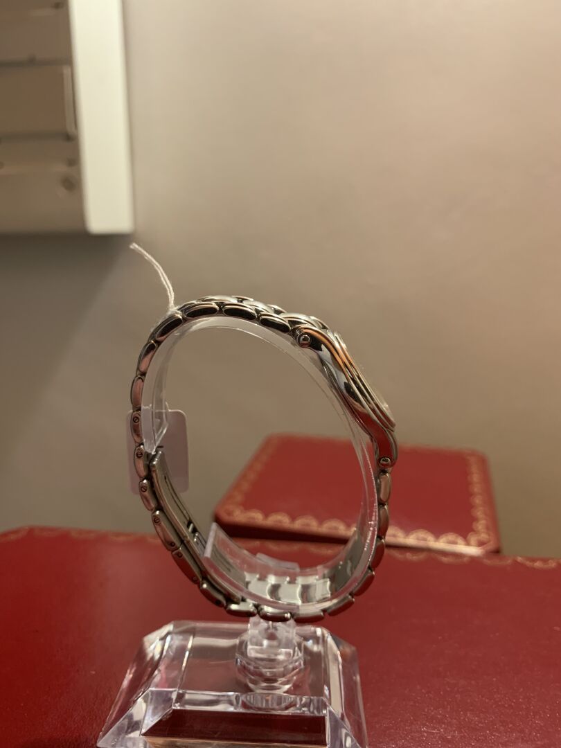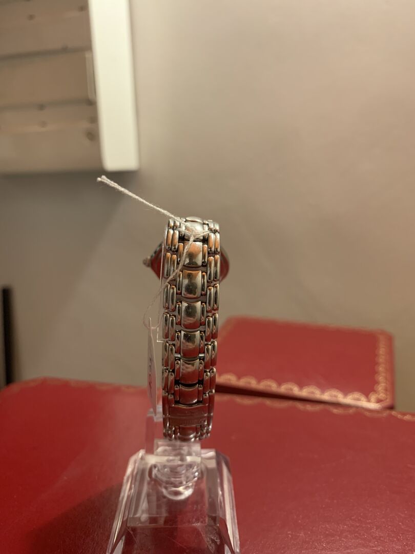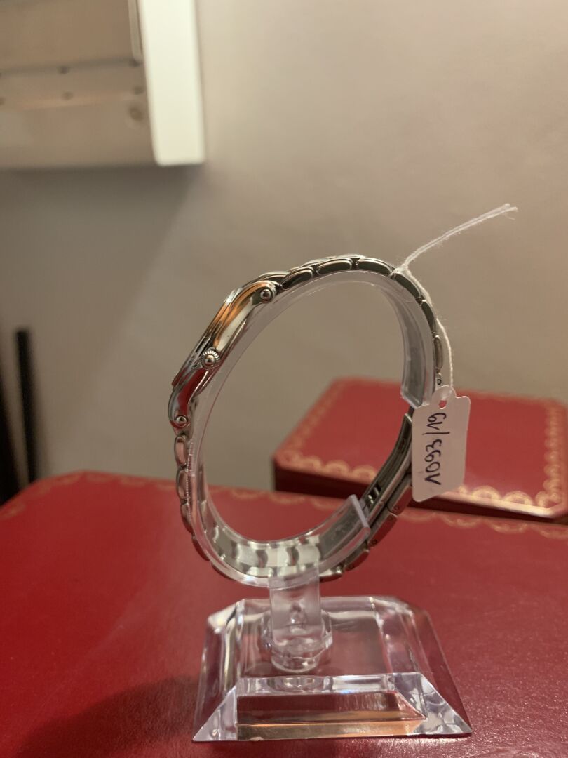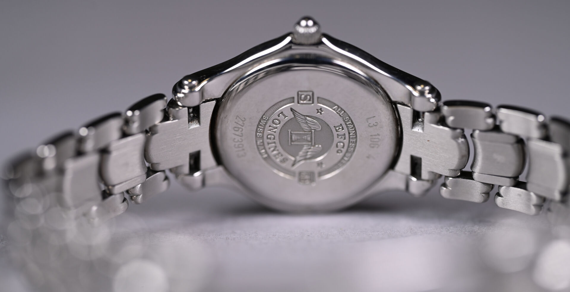 LONGINES Golden Wing, montre de dame en acier. Boîtier rond avec cadran signé à fond blanc, index des heures en chiffres romains argentés et guichet dateur à 3h. Mouvement quartz. Bracelet articulé sur boucle déployante. Boitier : 25 mm. A réviser. Long. de la montre avec boucle déployante fermée : 17 cm. Long. de la montre avec boucle déployante ouverte : 19 cm.
