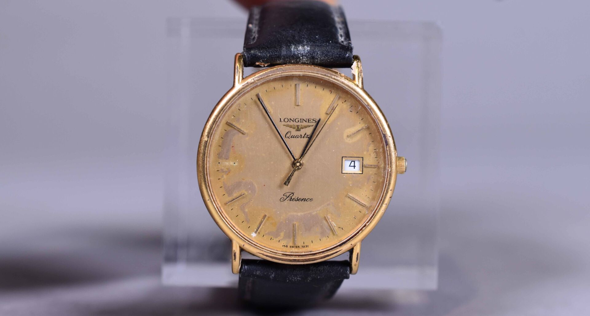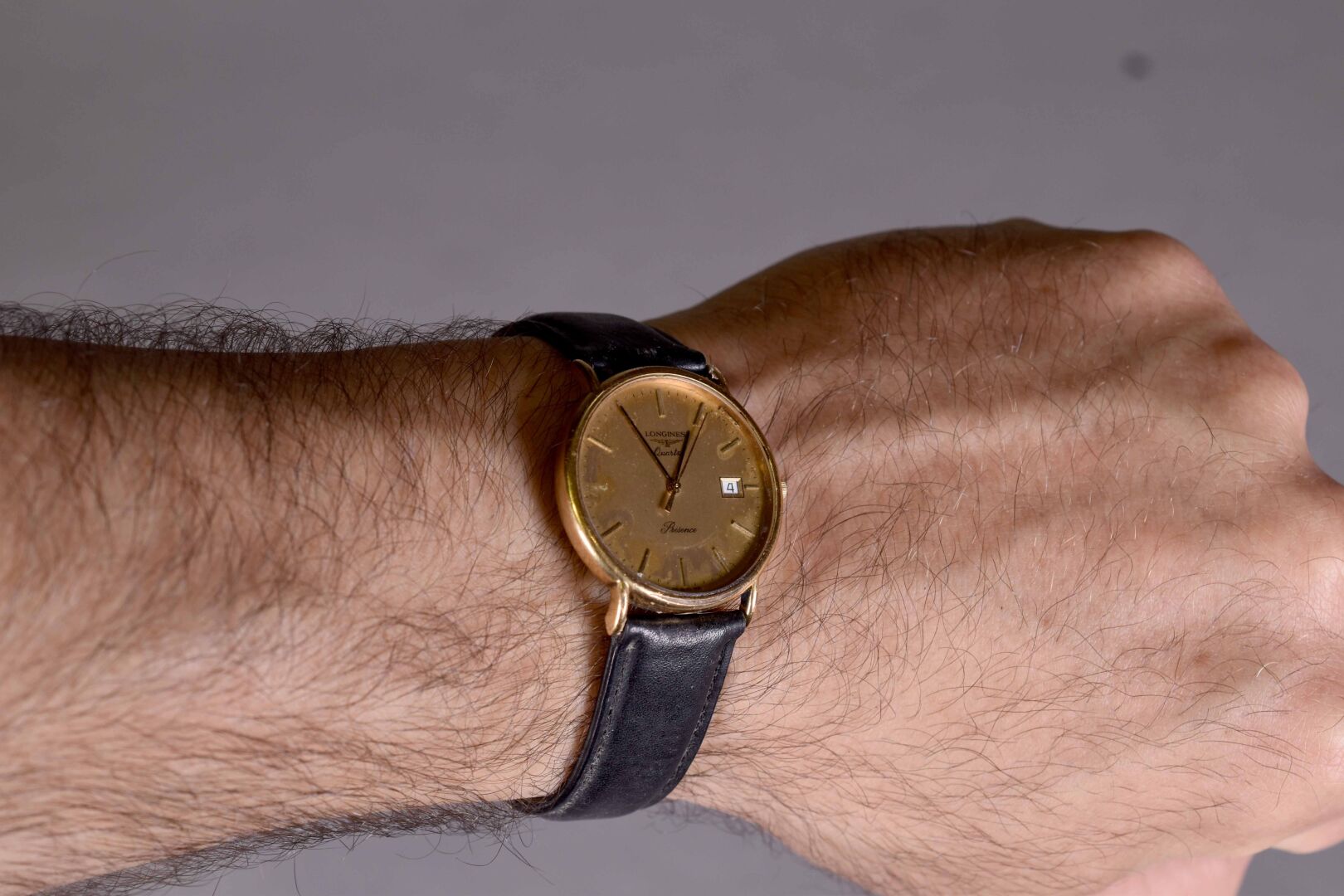 LONGINES. Montre bracelet d’homme à boitier en métal doré modèle « Présence ». Guichet date à 3 heures. Mouvement à quartz (index décollé). Boite d’origine.