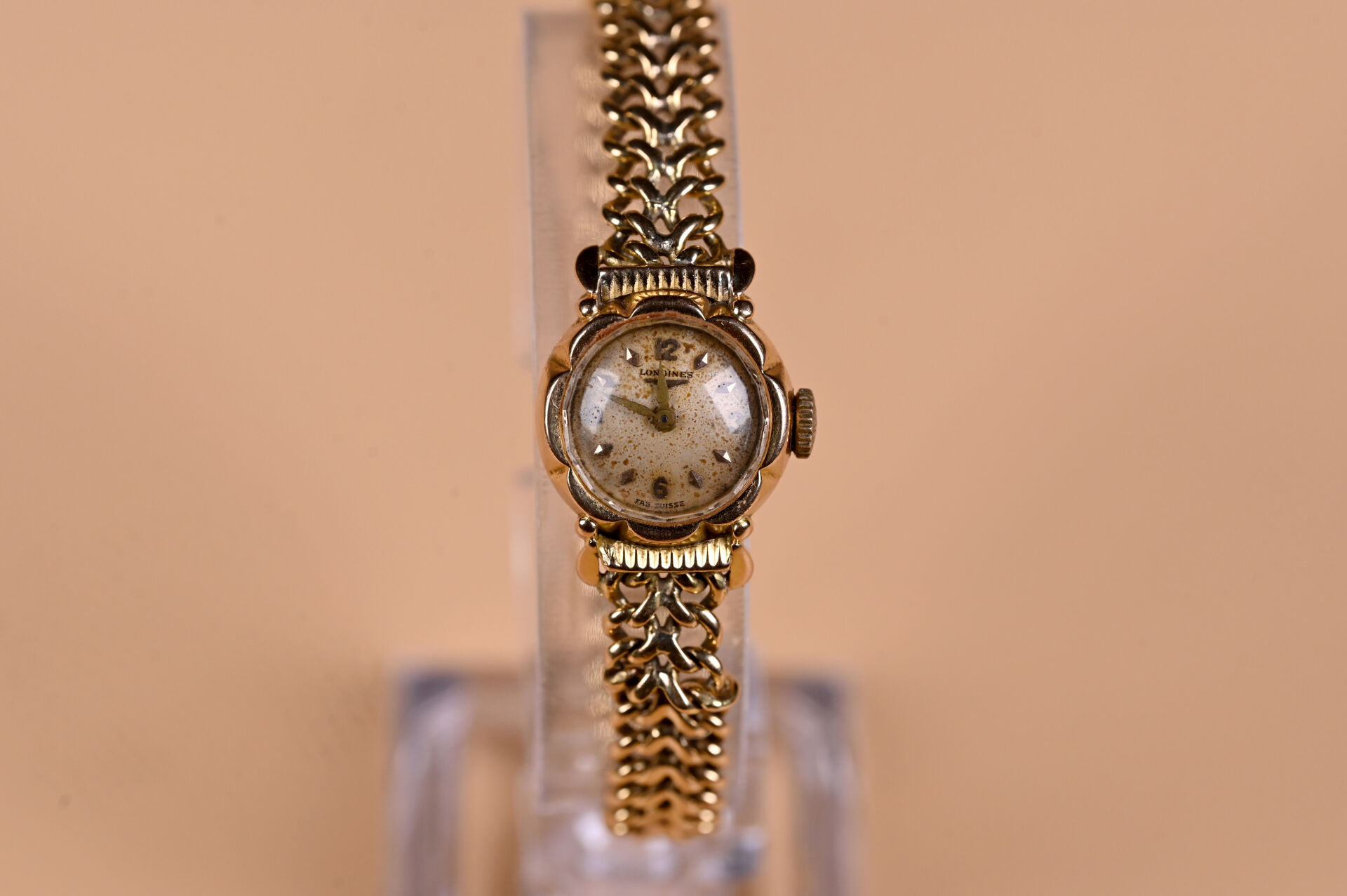 LONGINES. Montre de dame en or jaune 18K 750/1000e, boitier rond à bords chantournés, cadran signé à fonds blanc (taché), mouvement mécanique à remontage manuel, bracelet articulé avec chaine de sécurité (remontoir en métal bloqué, non fonctionnant, chocs au bracelet). Poids brut. : 27,4 g. A charge : le lot sera poinçonné avant la vente.